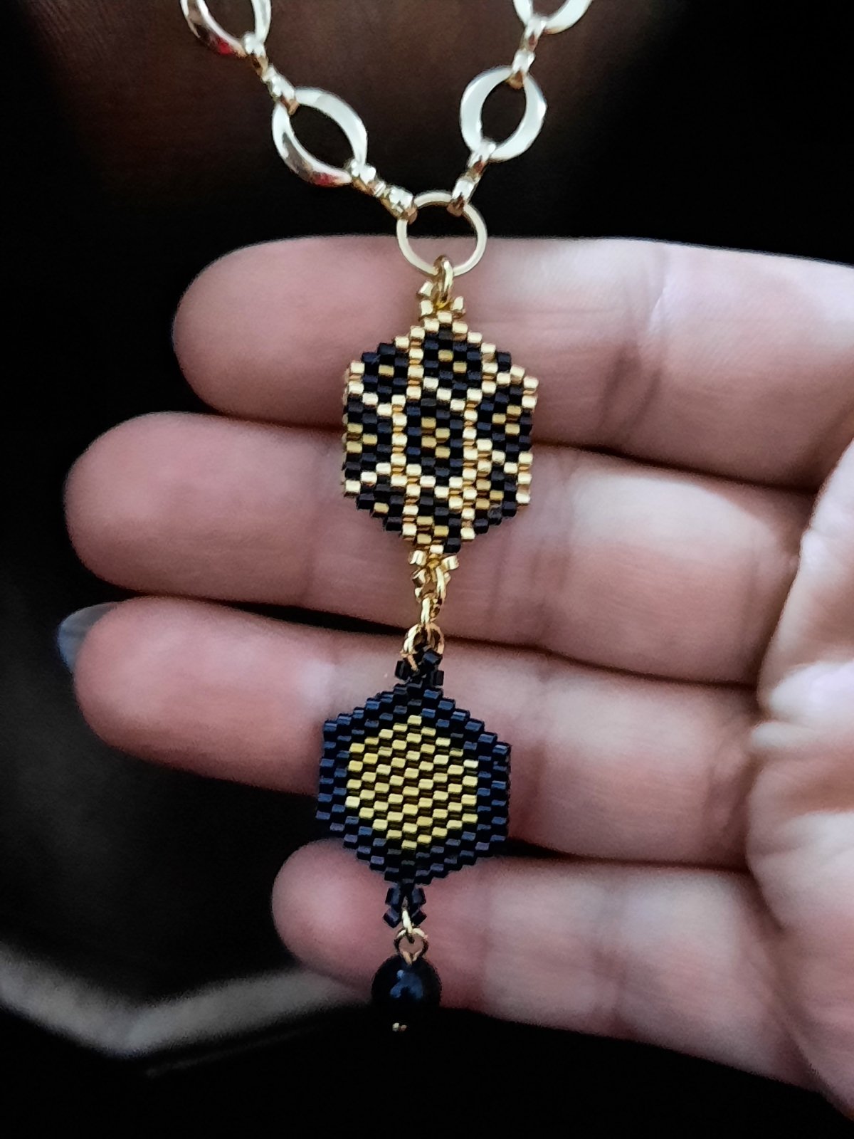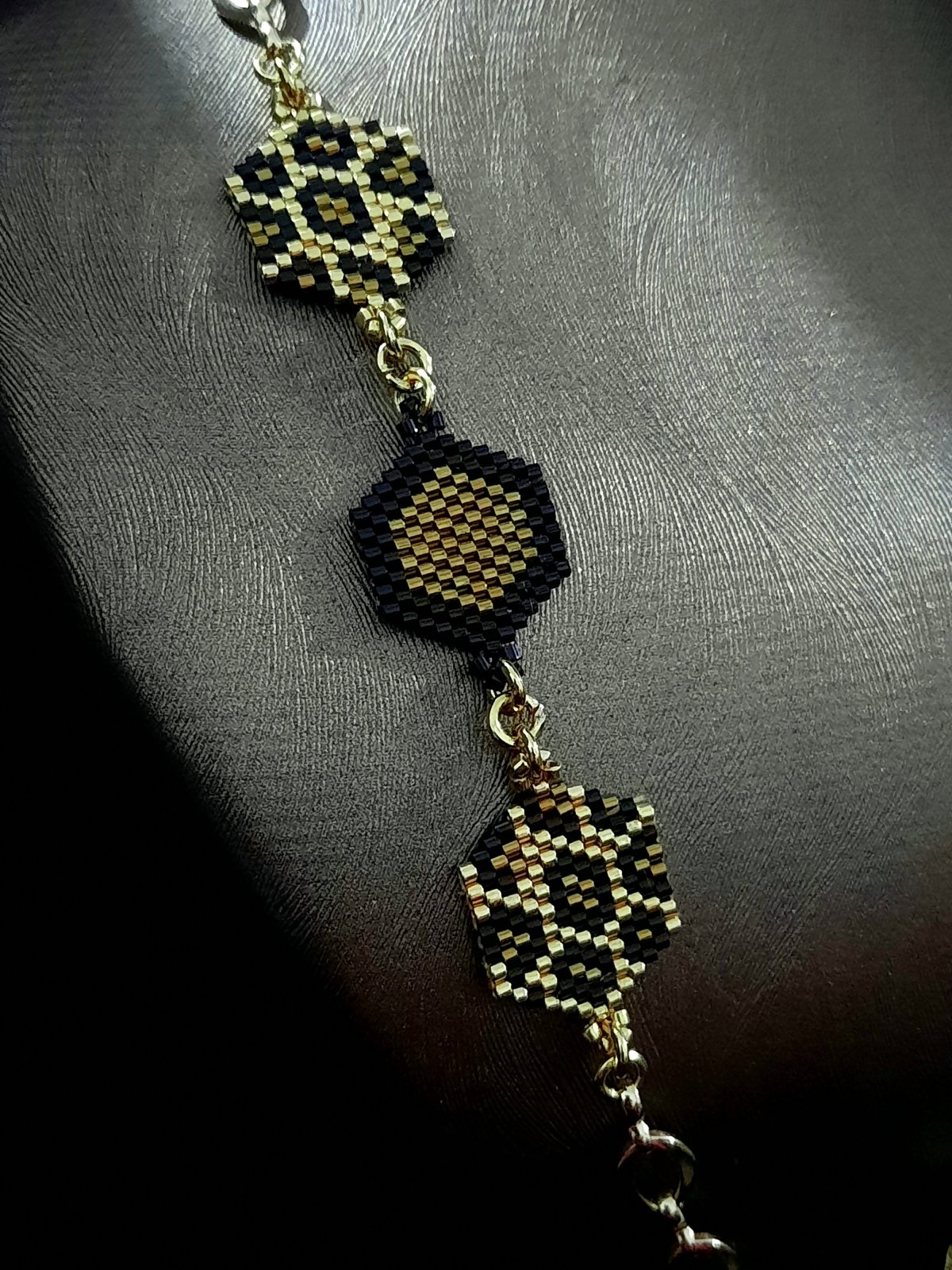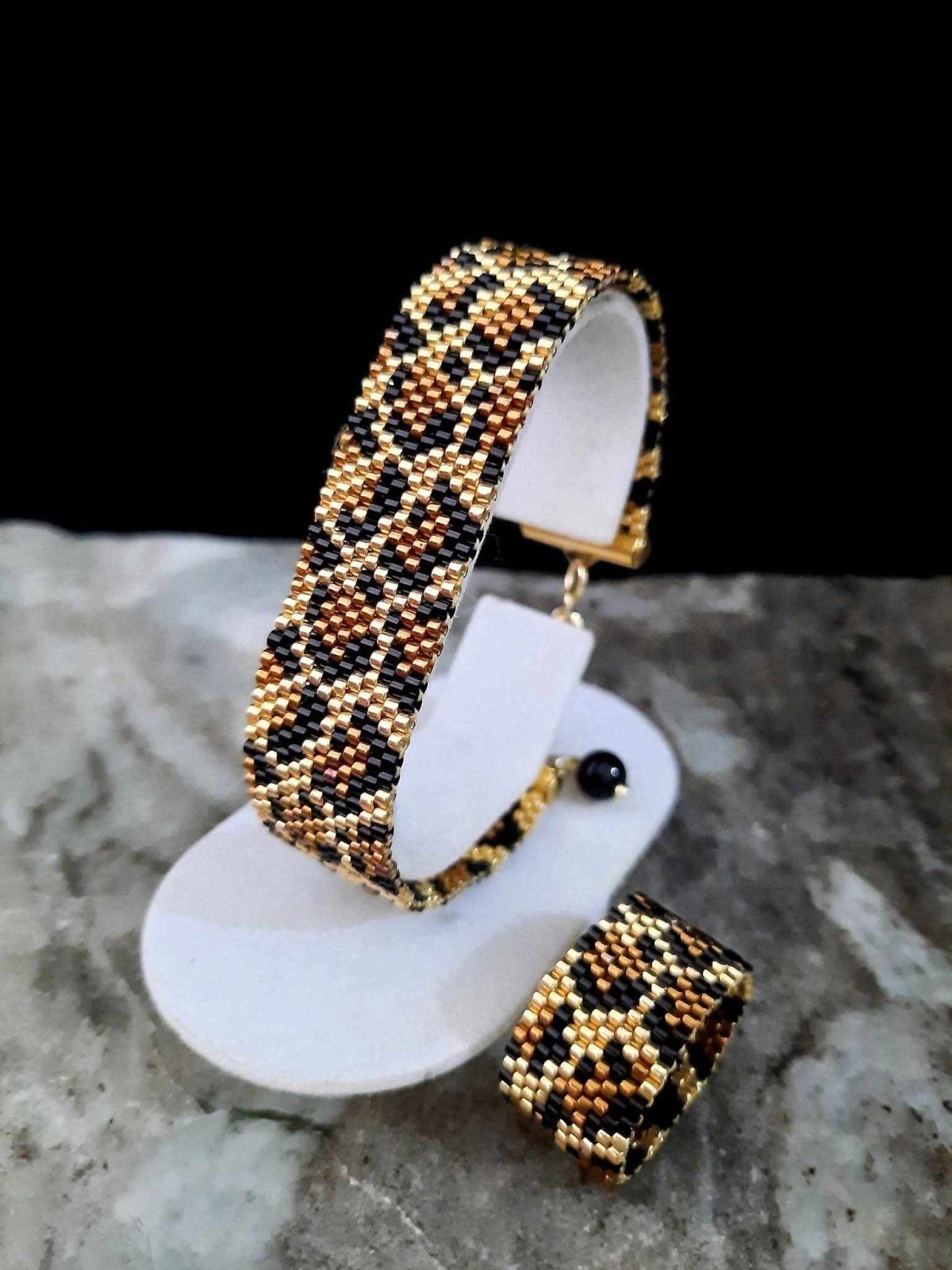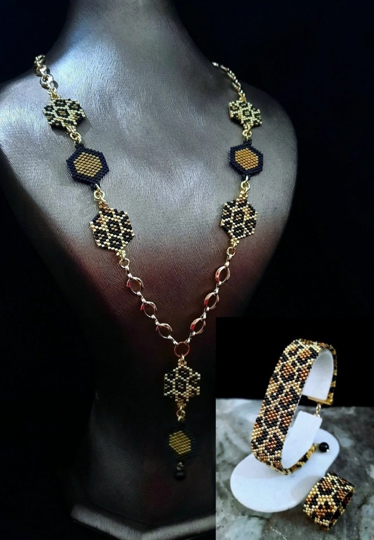 مجموعة جلد النمر من خرز الميوكى ... عبارة عن عقد بطول ٦٥ سم قابل للأطالة بتصميم وحدات سداسية لنمط جلد النمر باللون الذهبى والنحاسى والأسود .. وإسورة بتصميم جلد النمر الذهبية بتداخل الألوان الذهبى والنحاسى والأسود بتصميم ناعم وبسيط ولمسة عصرية رائعة .. بالأضافة الى خاتم بنفس النمط .. جميع المواد المعدنية المستخدمة غير قابلة للصدأ او تغيير اللون ولا تسبب التحسس .. وزنها خفيف جدا