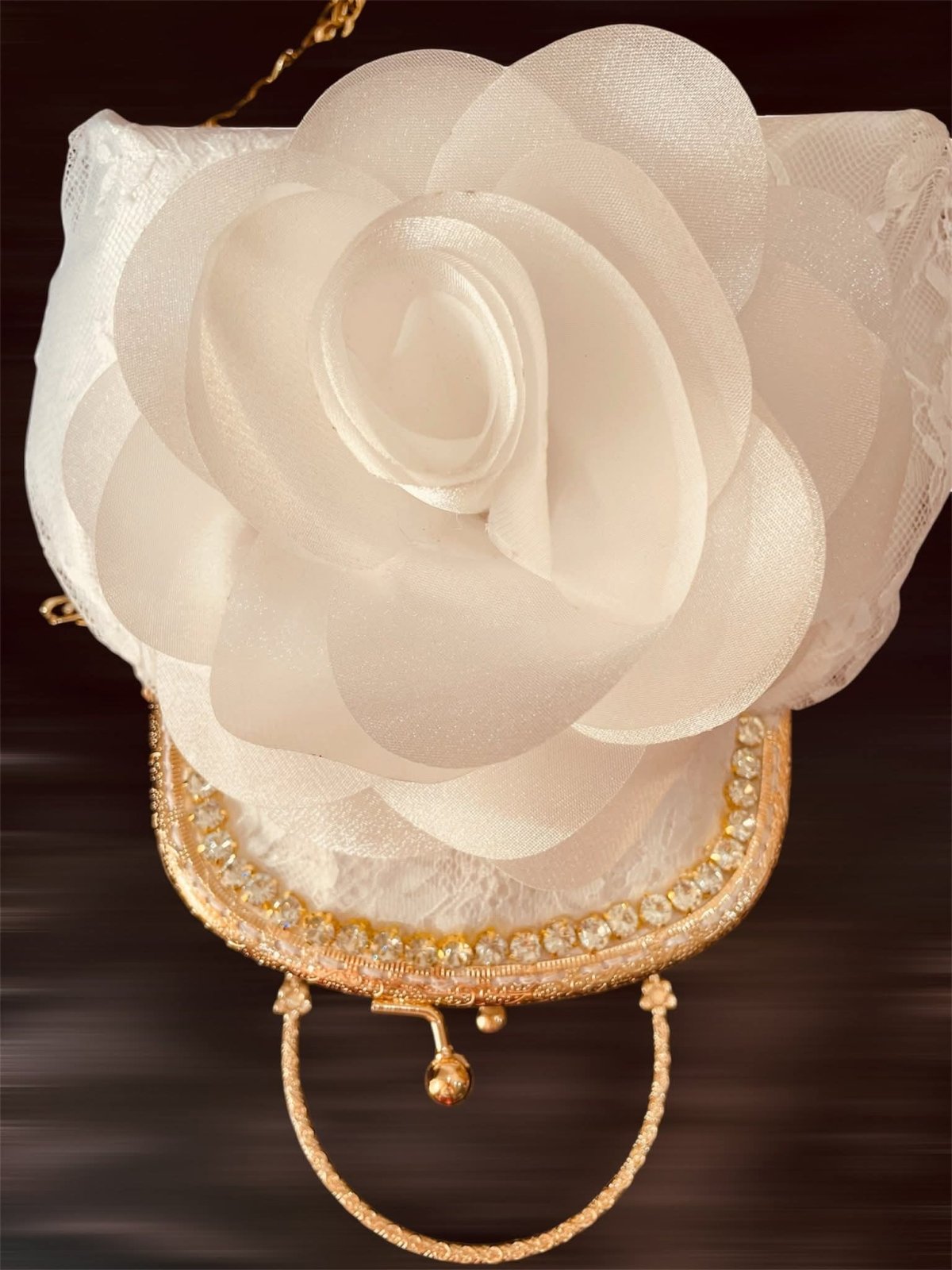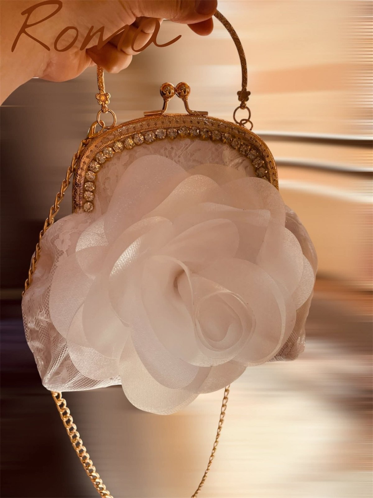 حقيبه سواريه صنعت يدويا من قماش الدانتيل والستان مزينه بالورد الابيض لها بطانه داخليه وفريم من المعدن مقاس 15 ولكن مقاس الشنطه ٢٥ ولها دراع سلسله متاح بجميع الالوان