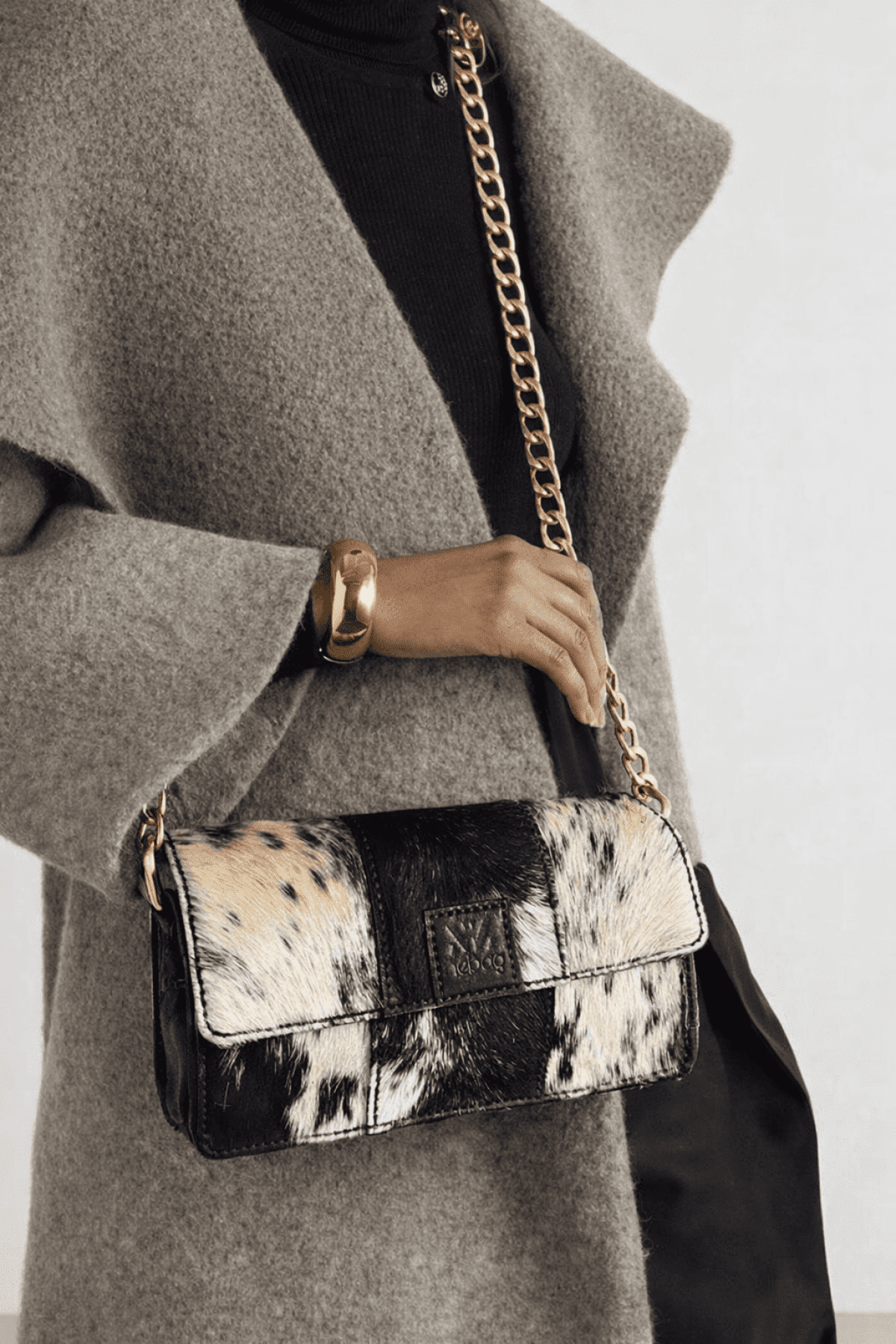 حقيبة كتف من جلد البقر حقيبة كتف هيكلية التصميم، تتميز بلمسة نهائية مذهلة من شعر جلد البقر الطبيعي (Hair-on-hide) باللونين الأبيض والأسود. صُممت الحقيبة بنمط ألواح "باتشورك" (Patchwork) طولية، ويتوسطها شعار مربع مميز من الجلد الأسود. • الأبعاد: 24 × 14 × 7