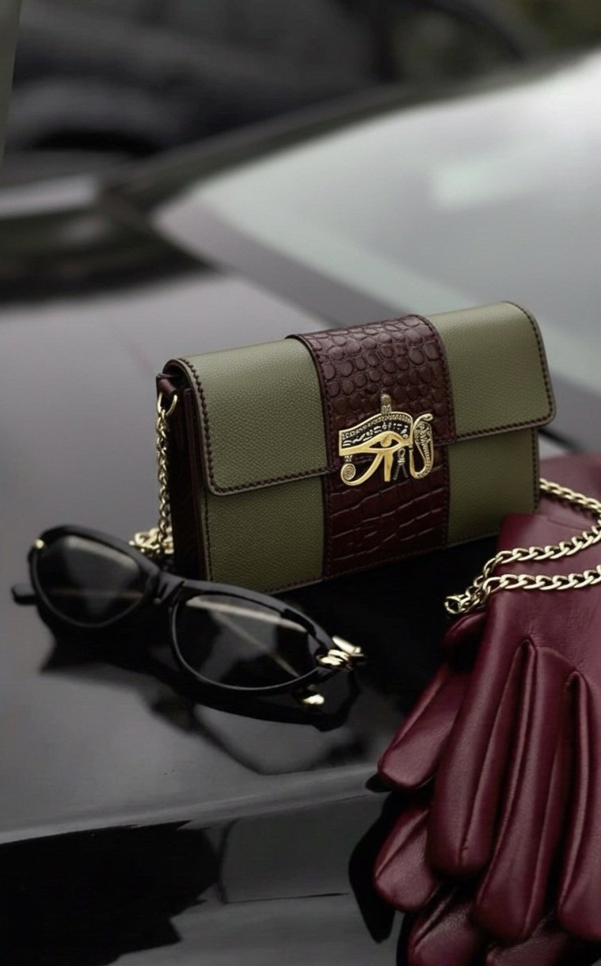 تتميز هذه الحقيبة الفاخرة ذات الحزام السلسلي بتصميم جريء ثلاثي الألوان يجمع بين الألوان الملكية والرموز المصرية القديمة. التصميم والميزات • اللون والملمس: تتكون الحقيبة من ثلاثة أجزاء مميزة: الجوانب مصنوعة من جلد محبب بلون أخضر زيتوني، بينما يتميز الجزء الأوسط بنقشة جلد التمساح بلون عنابي غني. • الإكسسوارات المعدنية المميزة: تتوسط الحقيبة مشبك ذهبي اللون ثقيل على شكل عين حورس (الودجات)، وهو رمز مصري قديم للحماية والسلطة الملكية والصحة الجيدة. الأبعاد: ٢٤ × ١٤ × ٧ سم