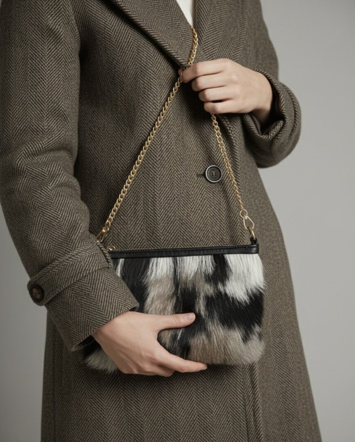 This fur clutch is an elegant, textural accessory designed to add a touch of luxury to cold-weather outfits. • Material & Texture: Crafted from high-quality, long-pile fur that features a natural-looking gradient of black, charcoal, and silver-grey tones. Dimensions; 24*15