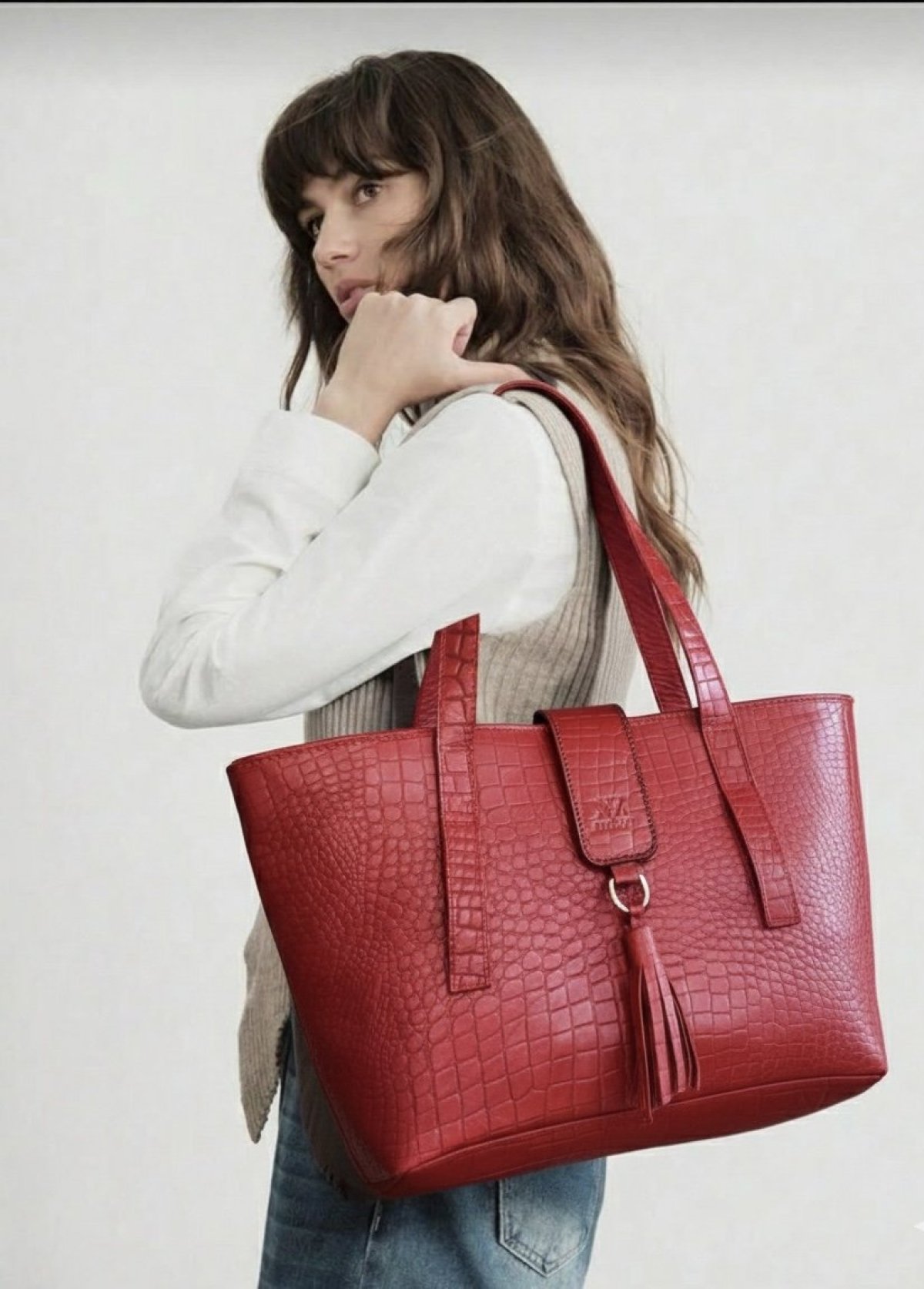 شنطه من الجلد الطبيعي عالي الجوده باللون الاحمر طبعه التمساح مصممه لتناسب الاستخدام اليومي بشكل عملي و انيق مقاس 40*27 *12 متاح تنفيذ اي اون