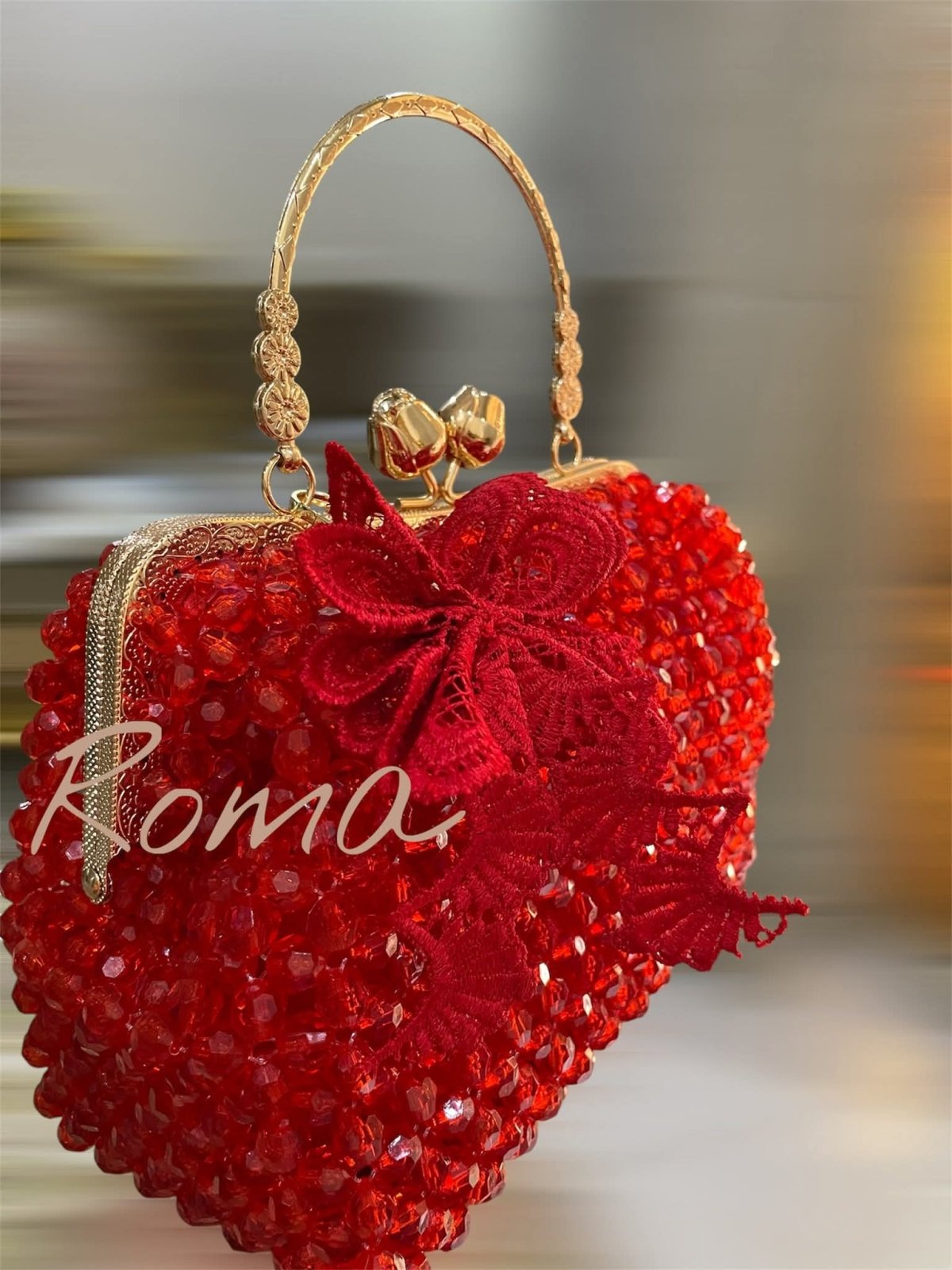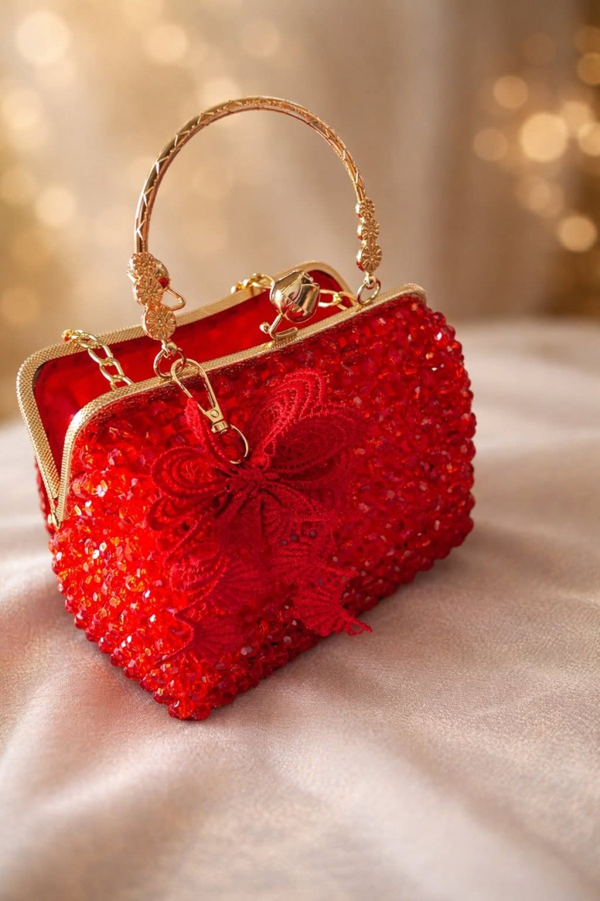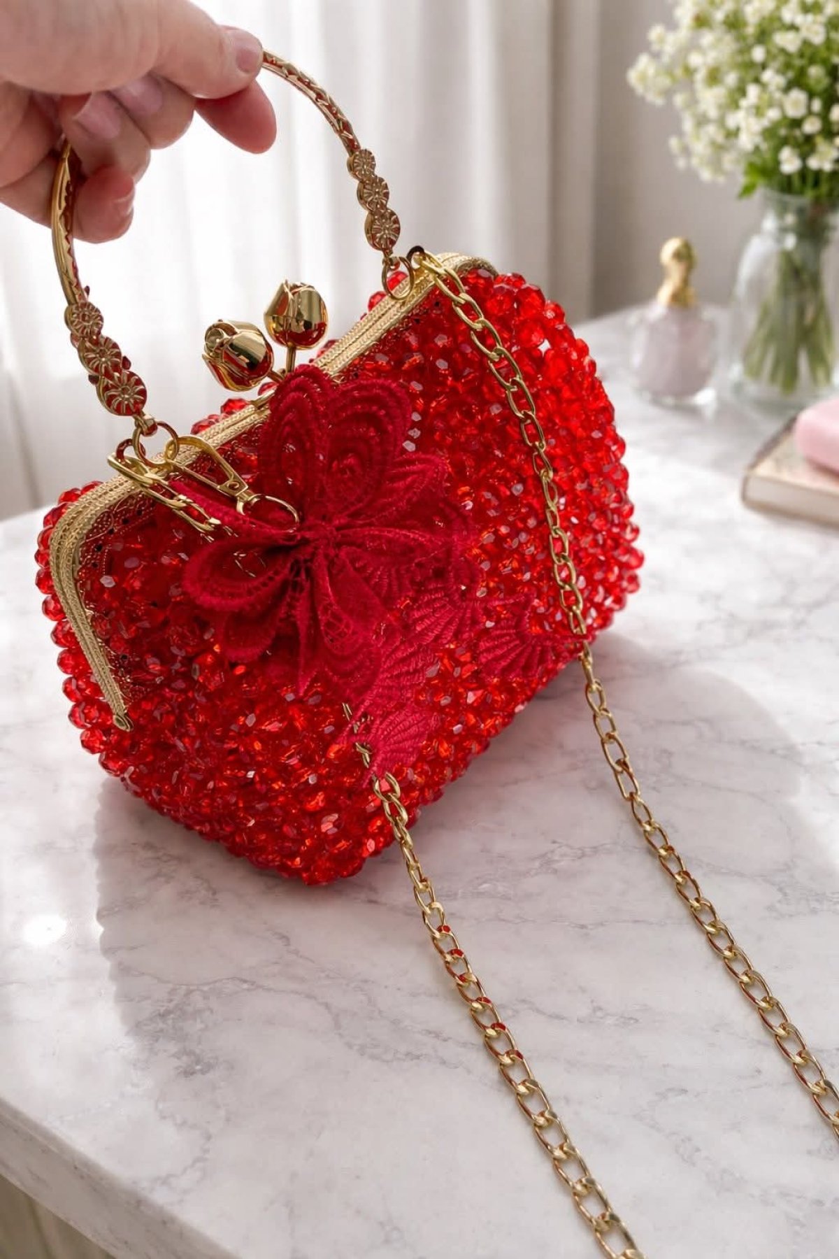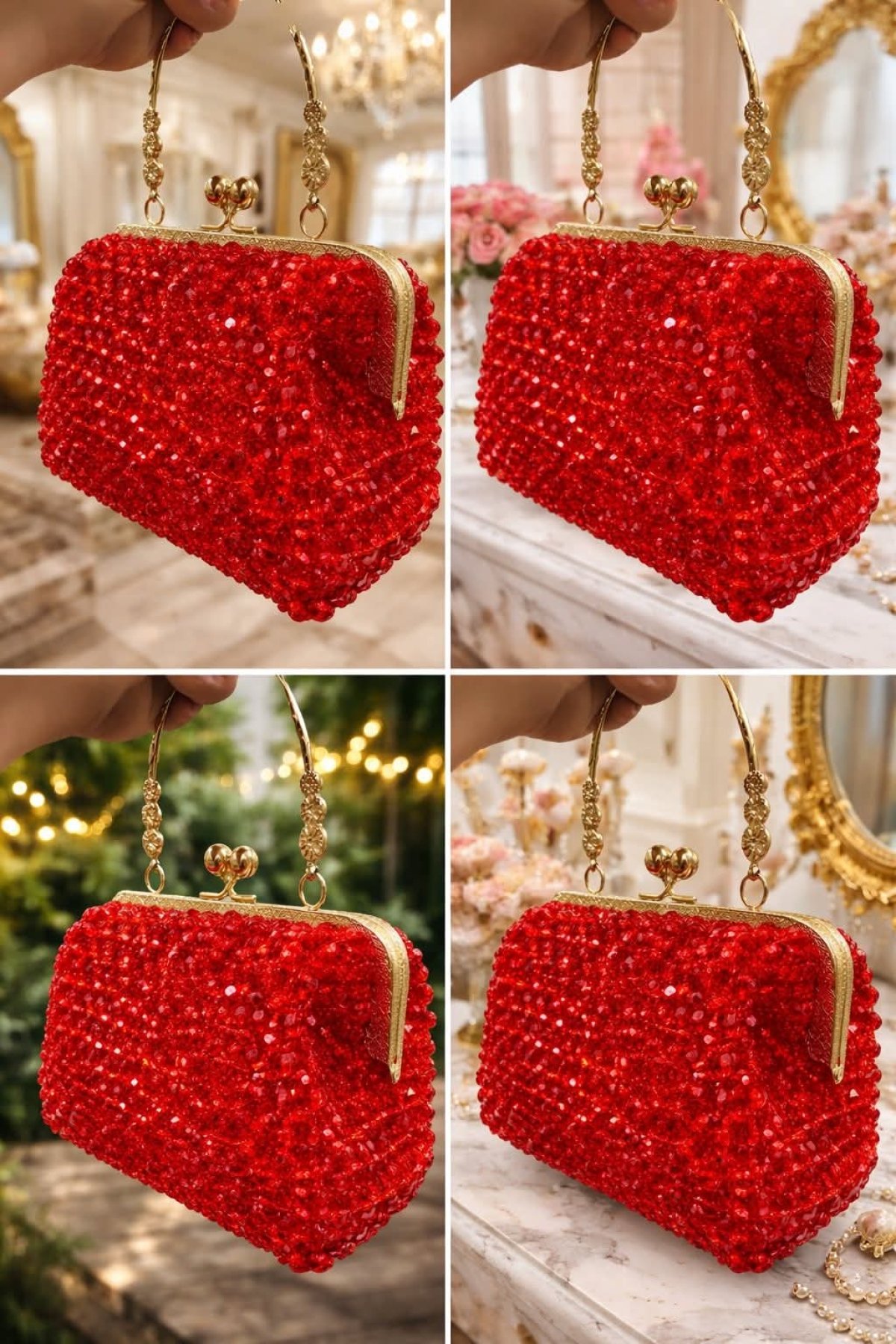 حقيبه خرز صنعت يدويا من الخرز الكريستال الاحمر لها بطانه من الستان التركي ومذوده بدراع سلسله