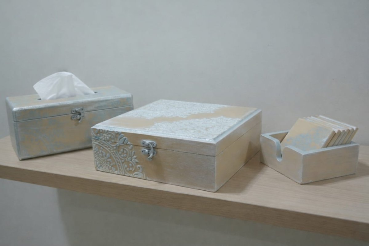 طقم مكون من صندوق شوكلاتة، علبة مناديل، و6 كوسترات