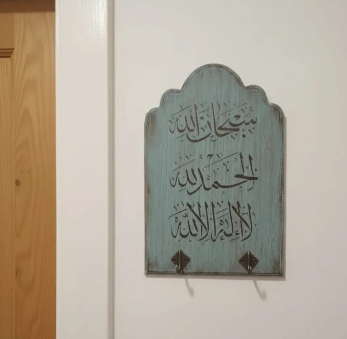 علاقة مفاتيح خشبية جميلة وبسيطة ملونة ومعتقة باللونين الأخضر والبني ومطبوع عليها بالأسود الاكريلك
