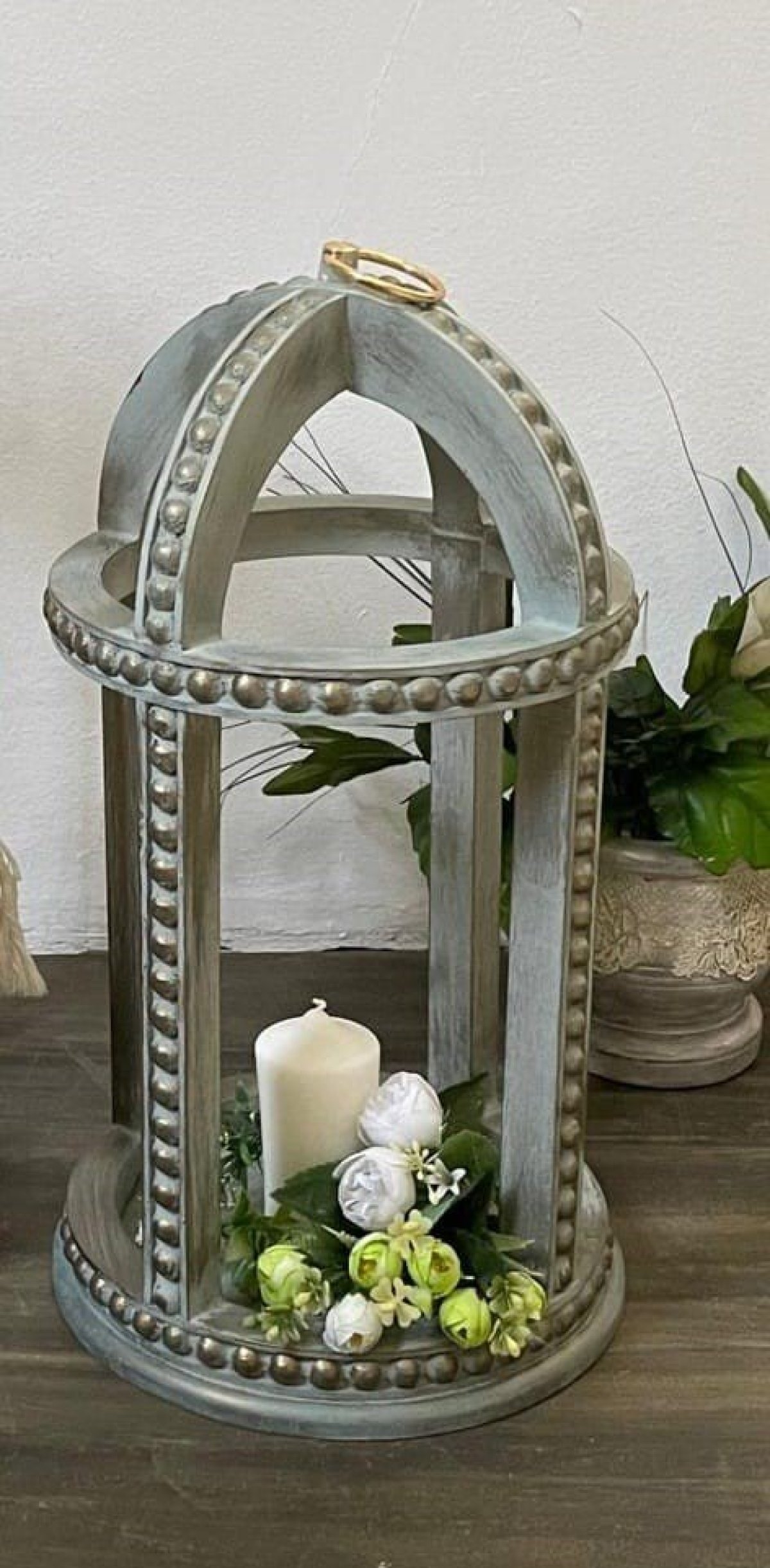 فانوس خرز فانوس من الخشب مزين بخرز ذهبي عتيق ارتفاع ٥٠ سم، قطر القاعدة ٢٧ سم لون أزرق فاتح مع لمسات ذهبية عتيقة السعر يشمل شمعة بطارية وزهور زينة