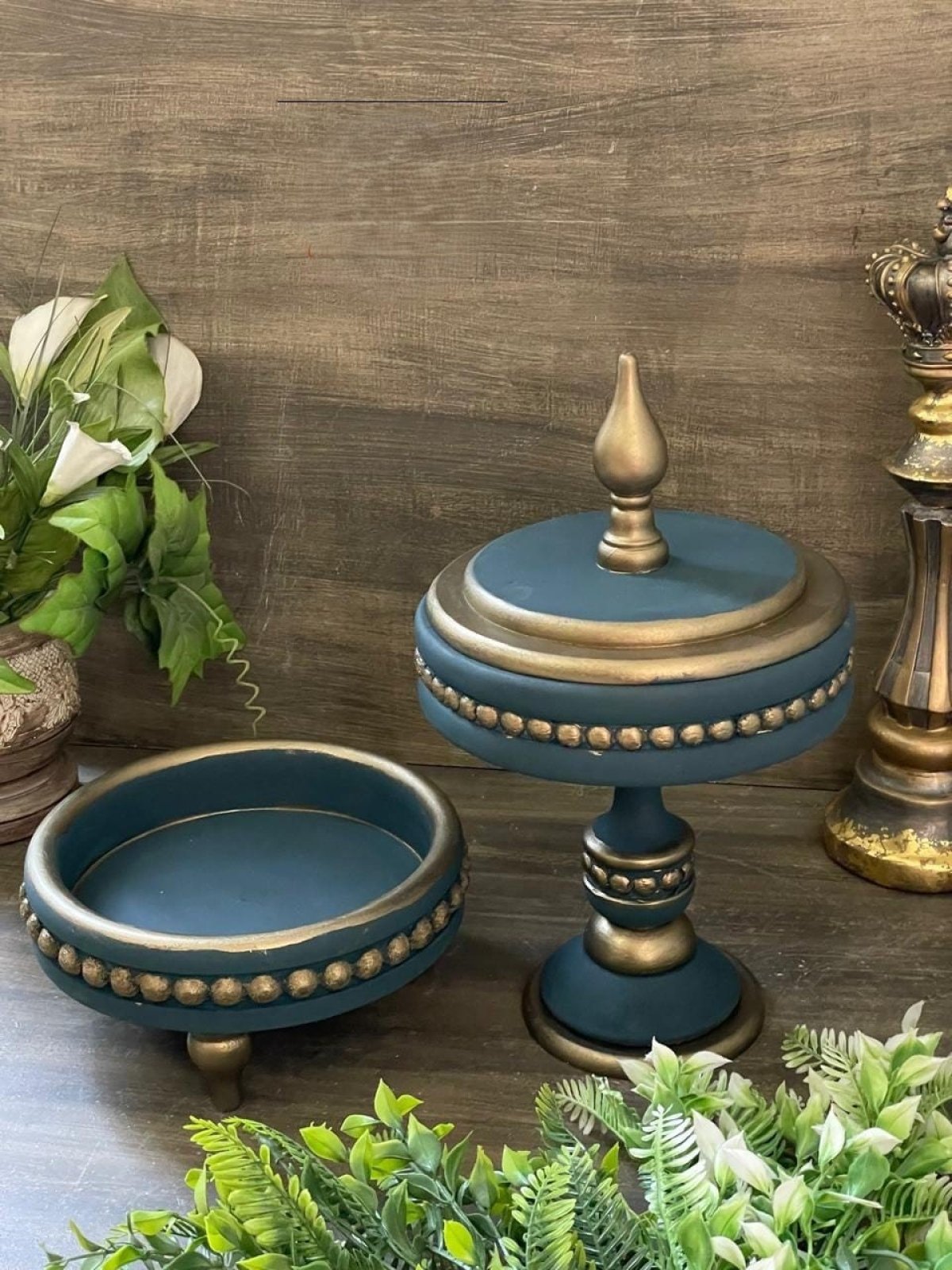 طقم ديكورى أنيق طقم ديكورى أنيق وعريق يتضمن علبة حلوى (بونبونير) بارتفاع 35 سم وقطر 20 سم، وطبق ( مكسرات أو تمر أ, ديكور ) بقطر 22 سم لون أزرق عتيق مع لمسات ذهبية عتيقة يمكن بيع الطقم بشكل منفصل