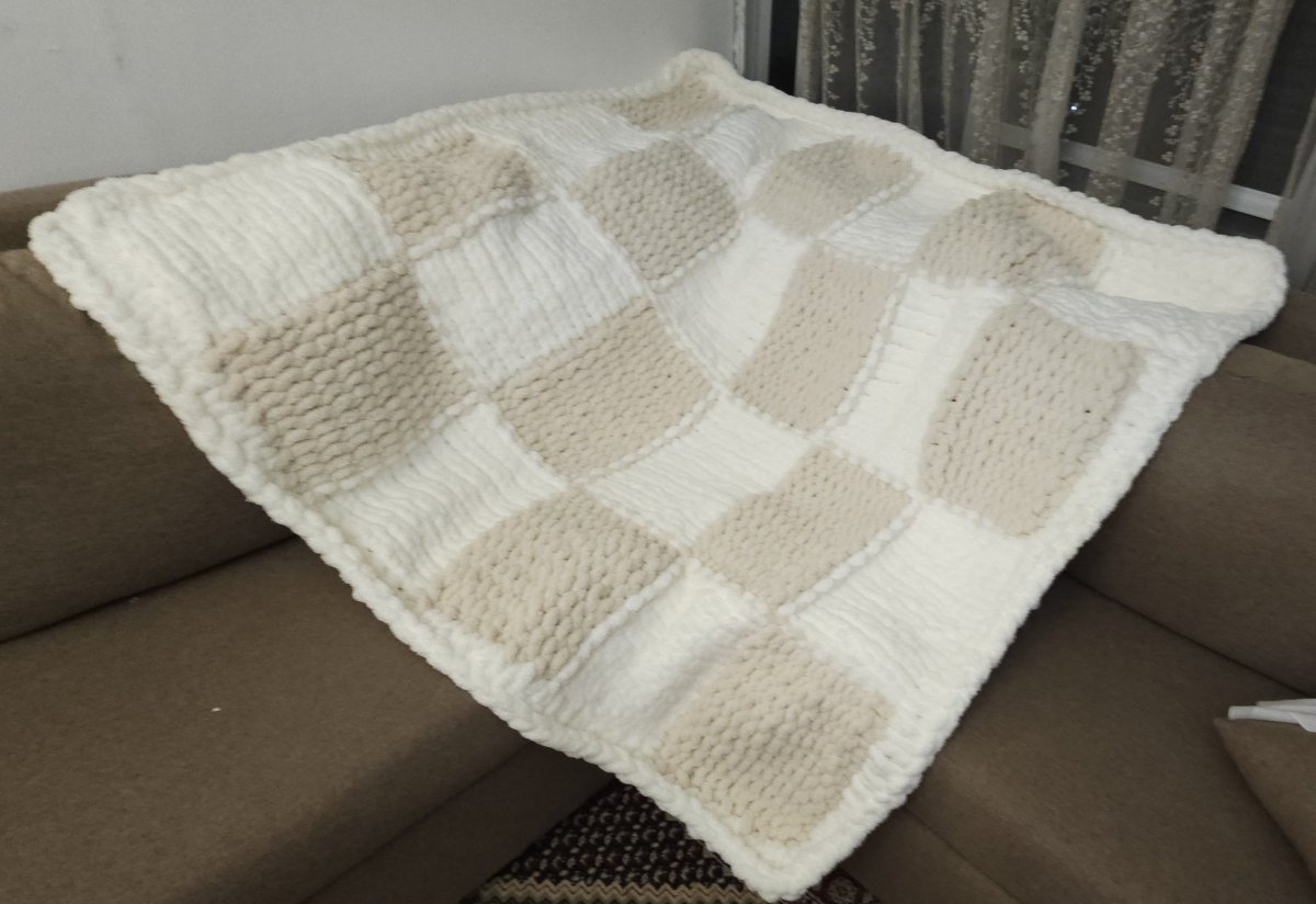 hand-knitted blanket, crafted from smooth chunky chenille bulky yarn, measures 140x180 cm.