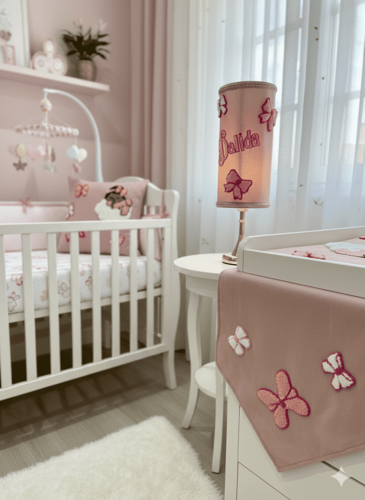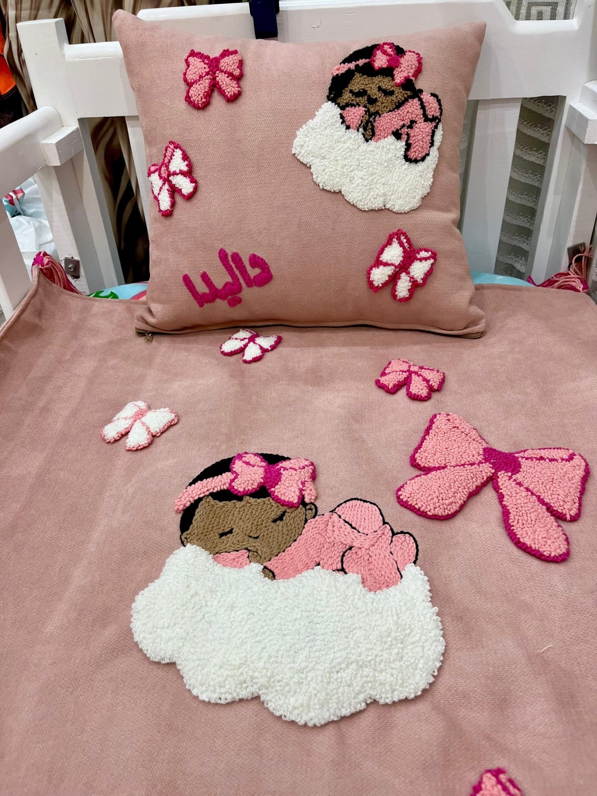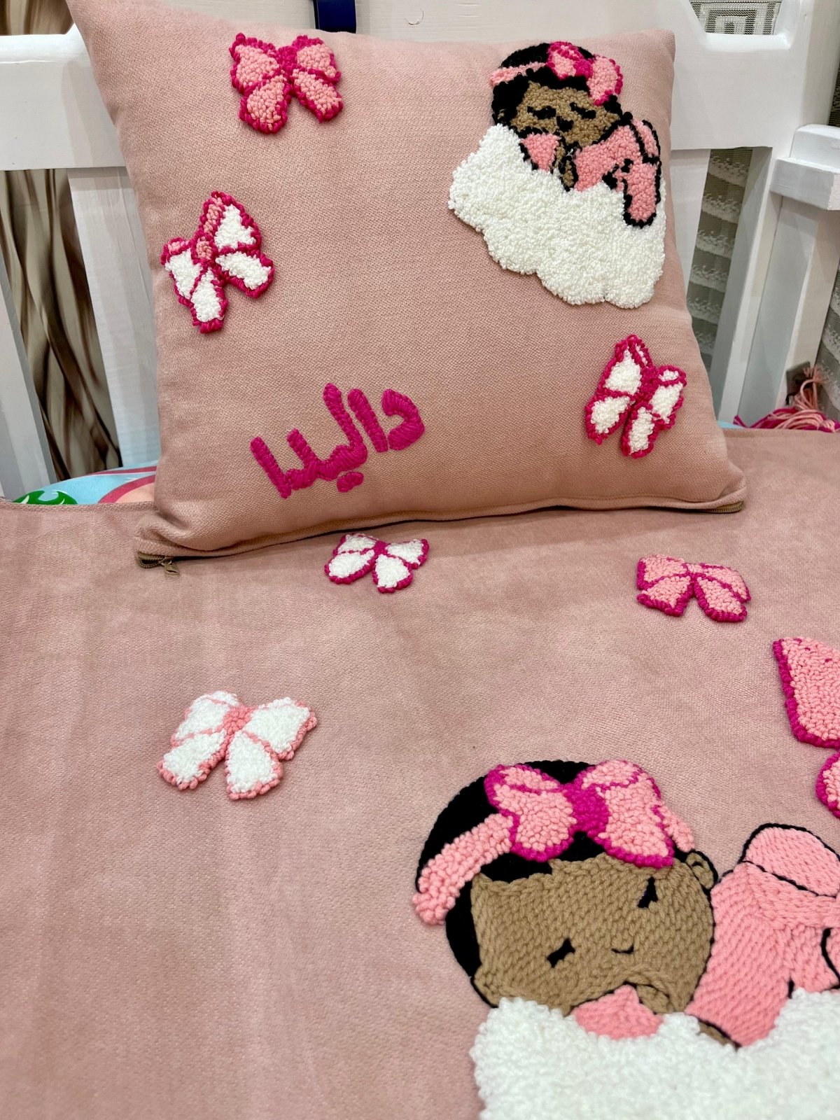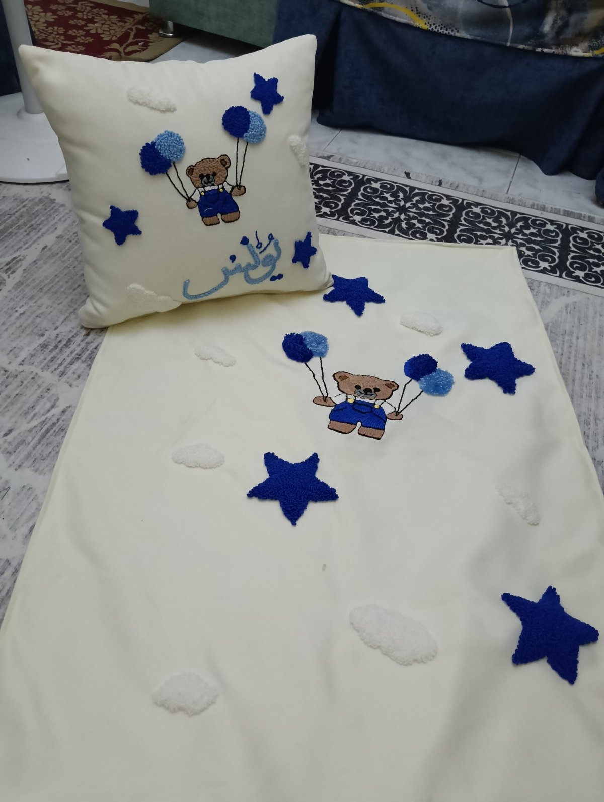 قماش كتان شغل هاند ميد ابره النفاش وخيوط قطن باسم الطفل و مقاسها متر في مترو٢٠سم ومبطنه من الخلف بنفس الخامه كتان