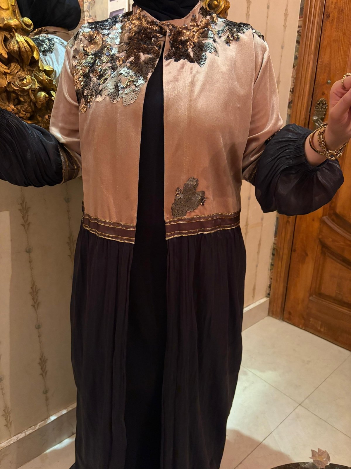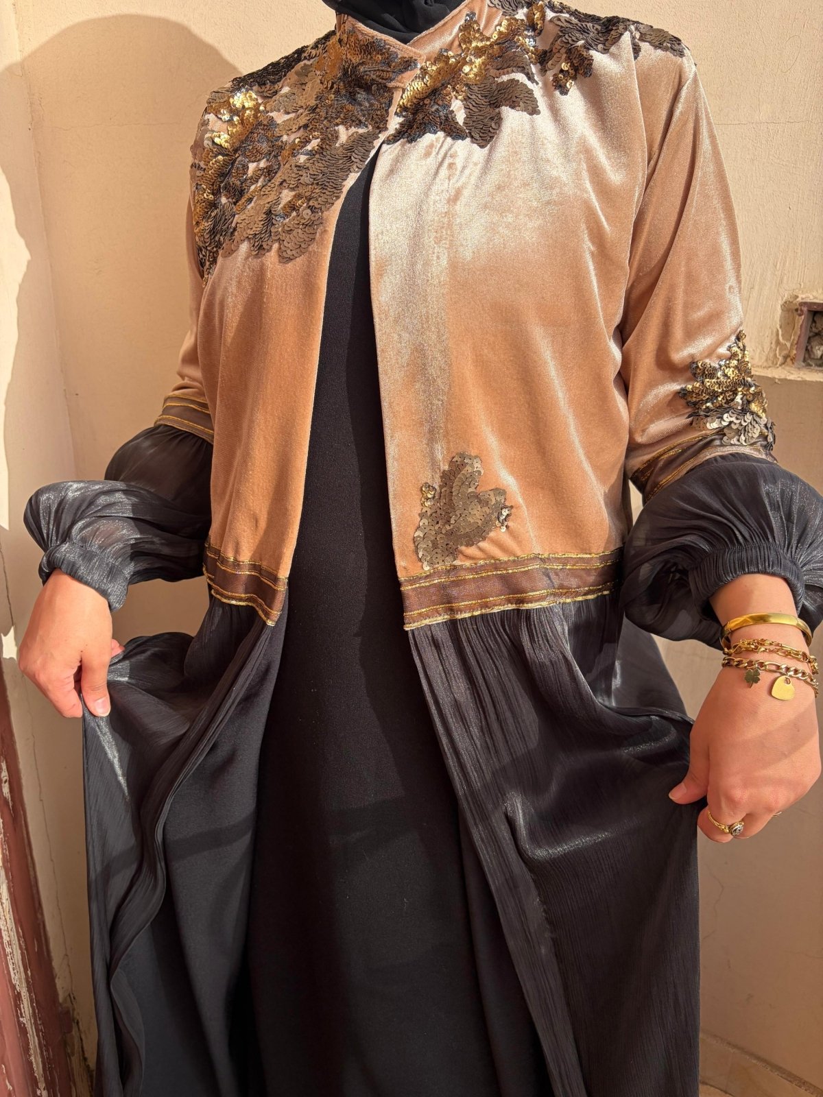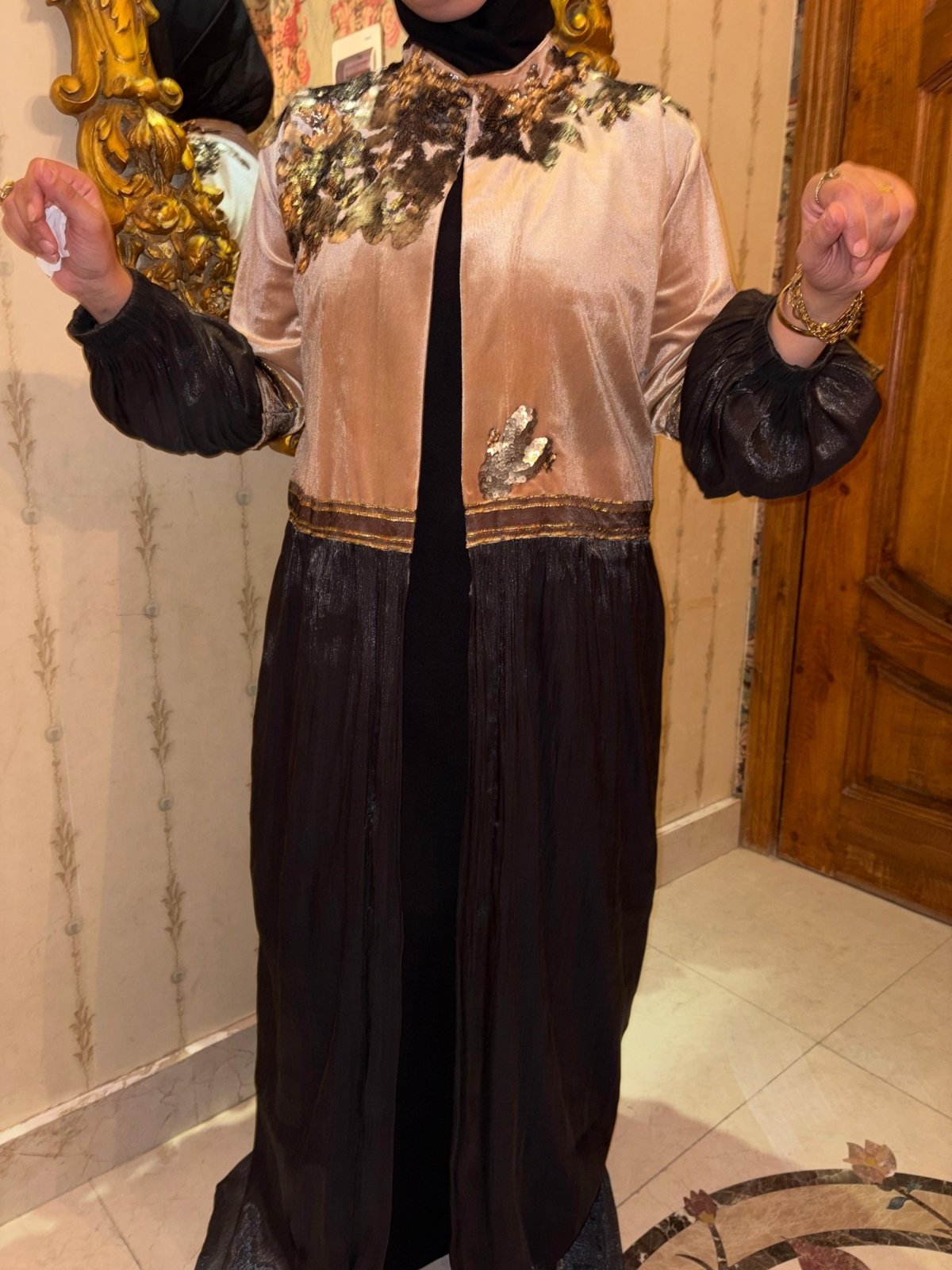 تالقى بقفطان مميز من القطيفة البيج مع اورجنزا اسود مبطن ستان ومطرز بالنحاسى والذهبى