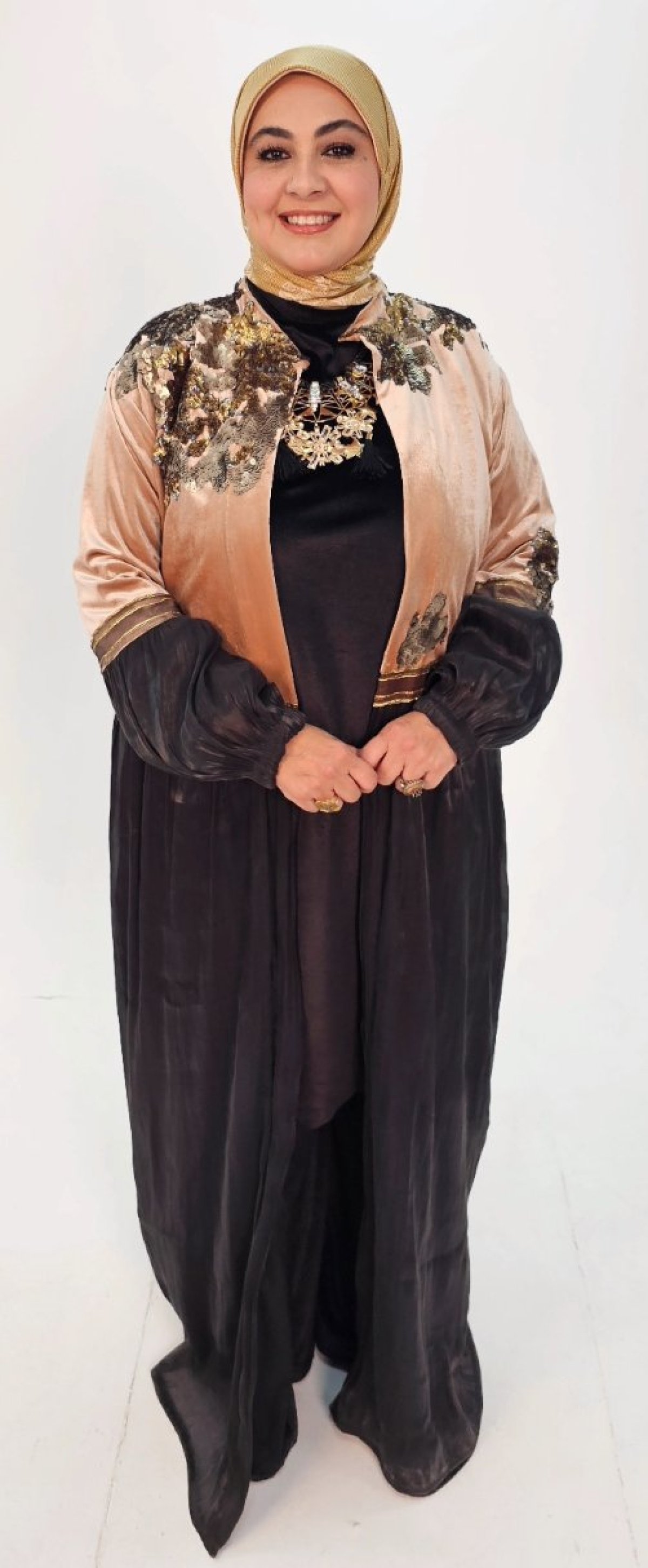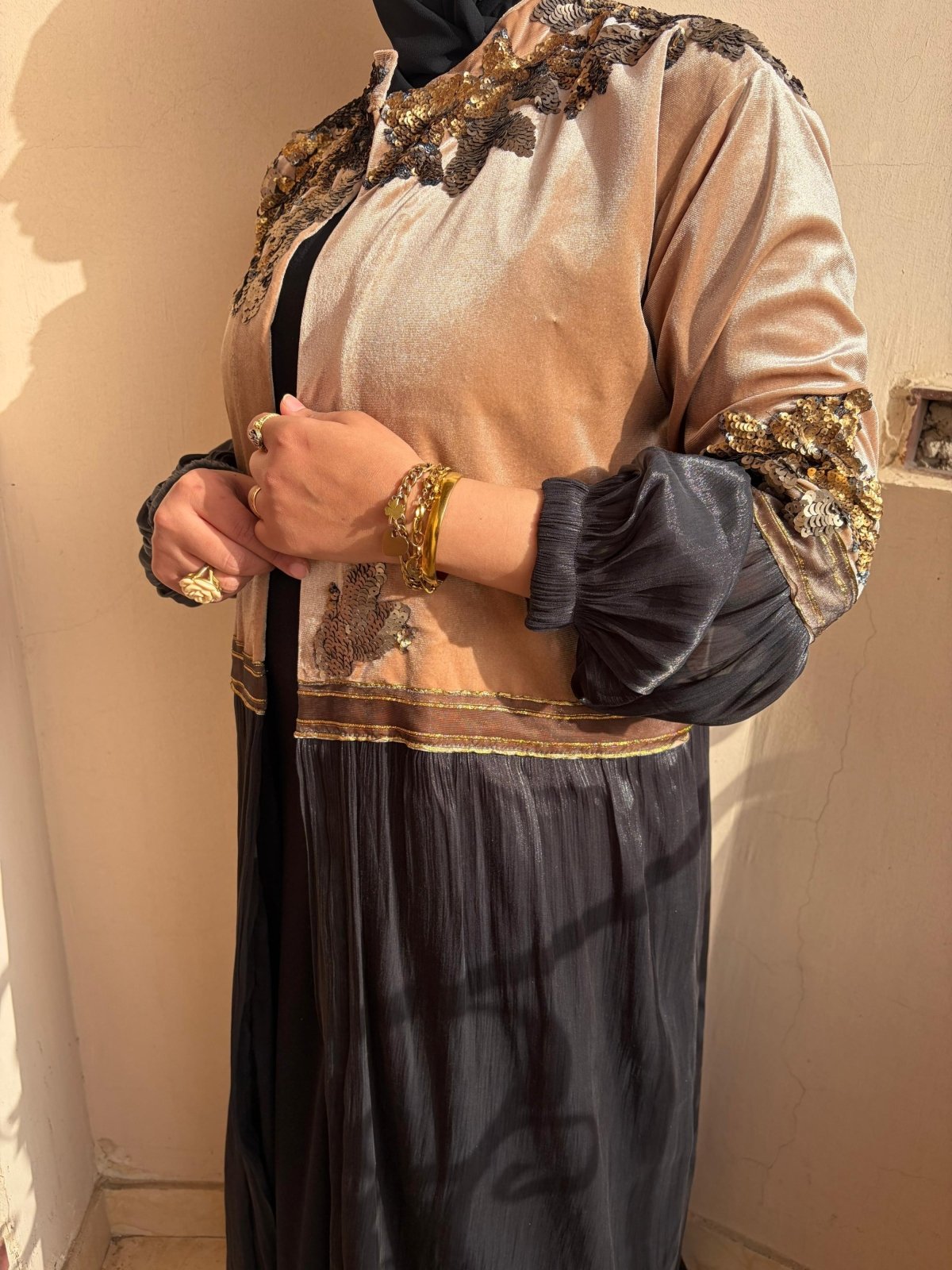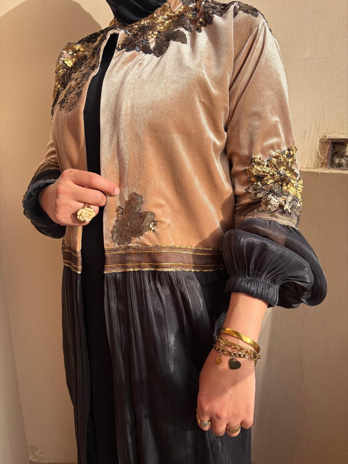 تالقى بقفطان مميز من القطيفة البيج مع اورجنزا اسود مبطن ستان ومطرز بالنحاسى والذهبى