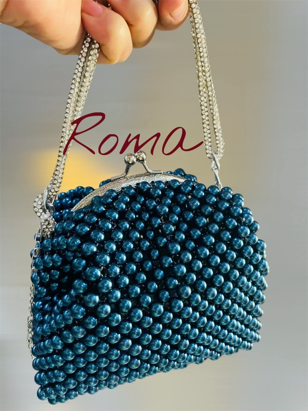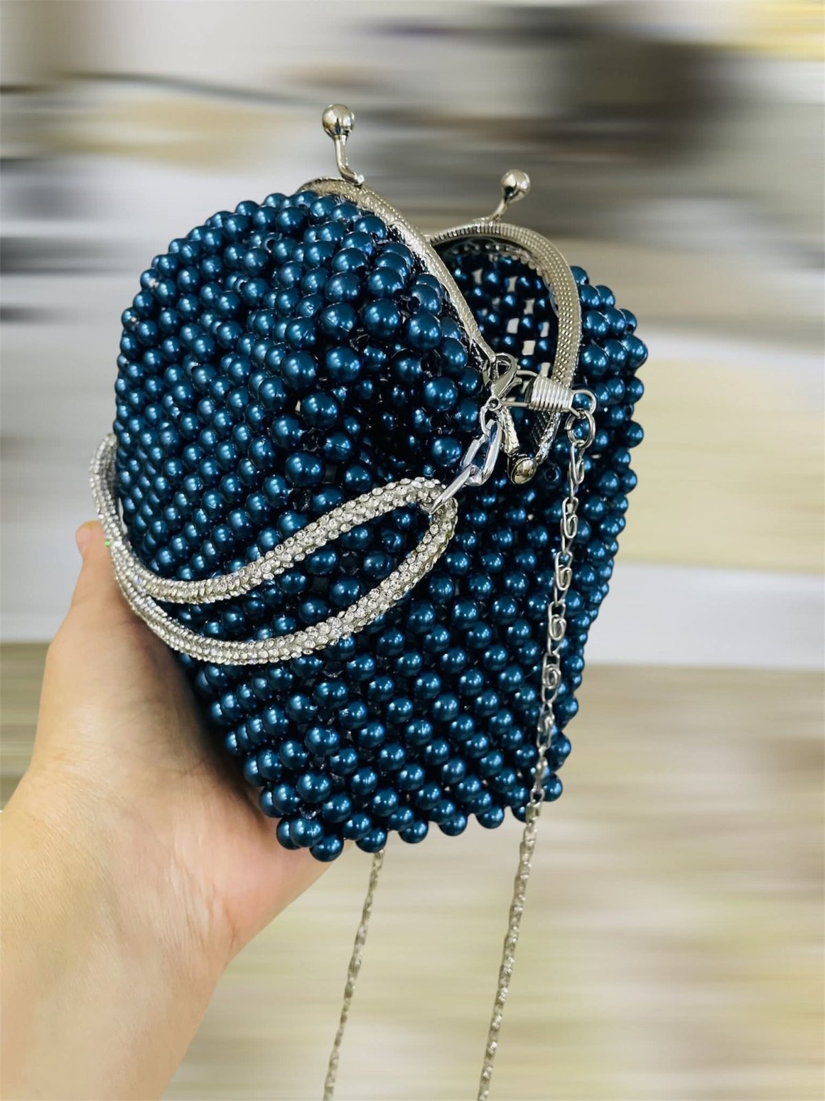 حقيبه من اللولي صنعت يدويا من حبات اللؤلؤ بلون البحر بفريم من المعدن مقاس 12 لها يد صغيره من خرطوم الكافيار ودراع سلسله