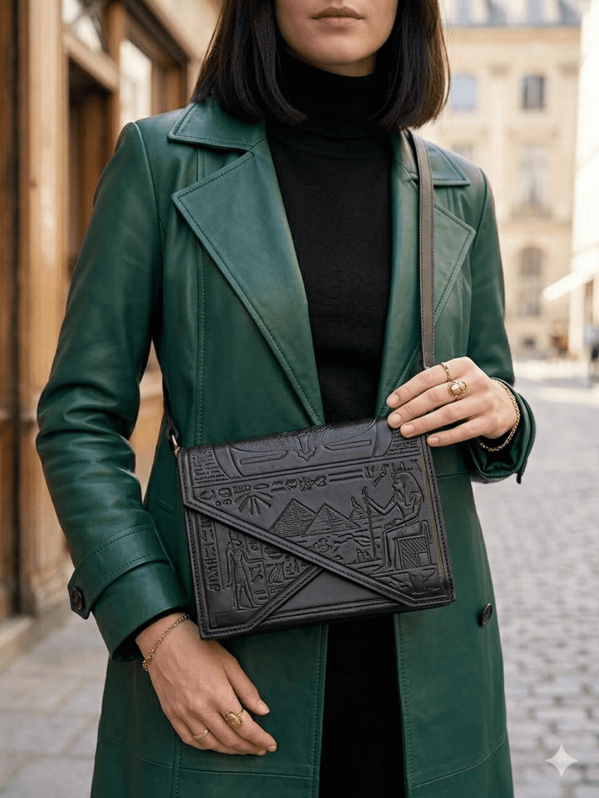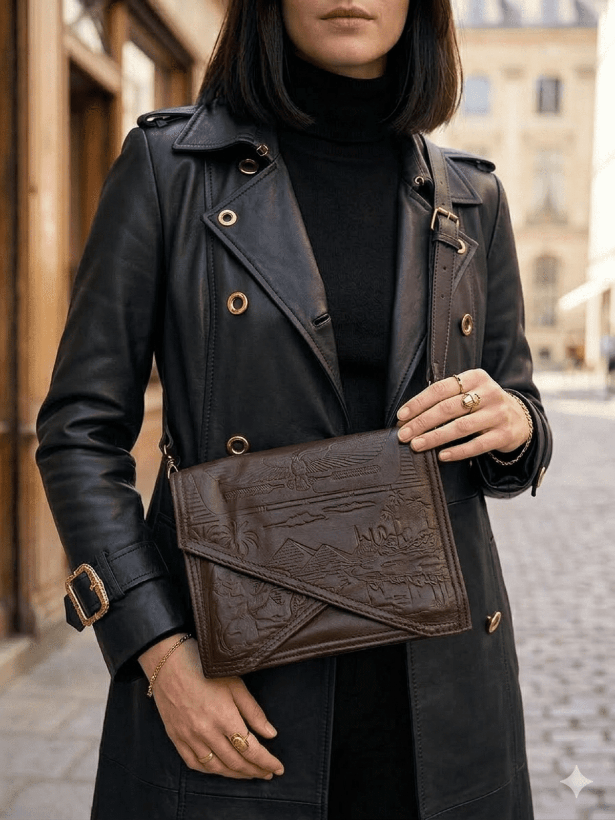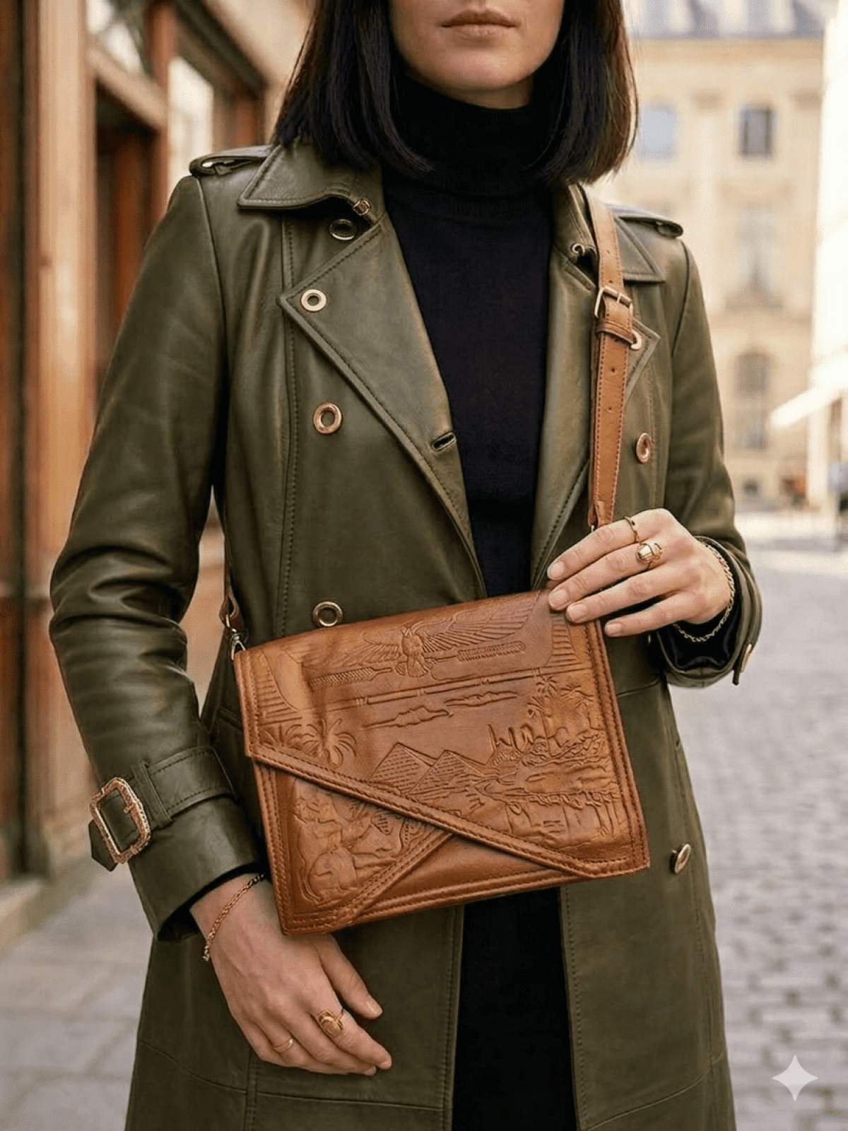 شنطه جلد طبيعي بالكامل، 5 جيوب عمليه إكسسوارات ستانلس، والرسم حفر هاند ميد
