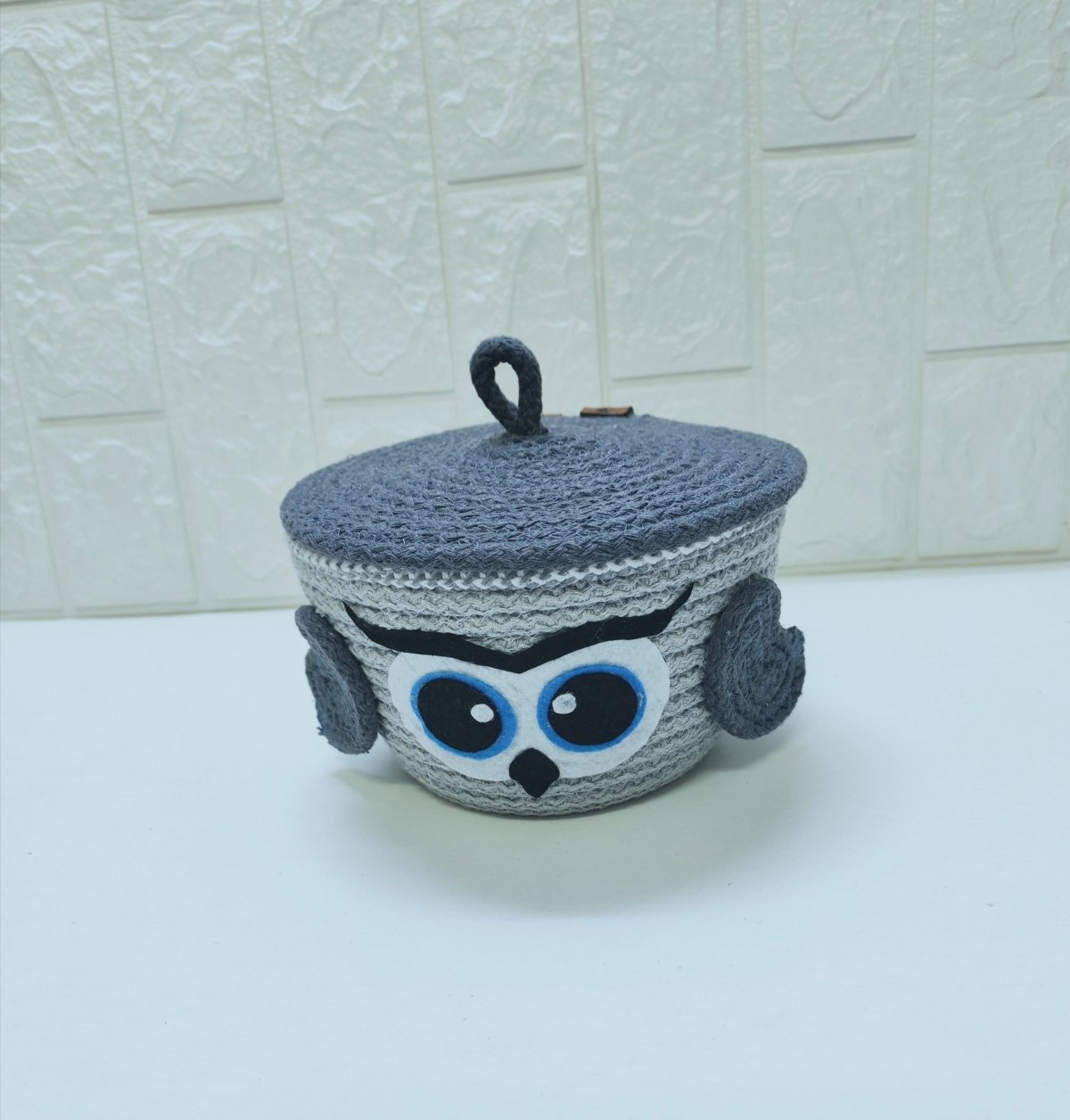 باسكت ديكورى منظم متعدد الاستخدام شكل بومة بغطاء يمكن استخدامه للاكسسوارات، الميكب اب، بونبينيره، .... مصنوع من خيوط الكوردون القطن الزجزاج المقاس :- القطر السفلى ١٤ سم العلوى ١٨ سم الارتفاع ١٠ سم يمكن تغيير اللون والمقاس حسب الطلب