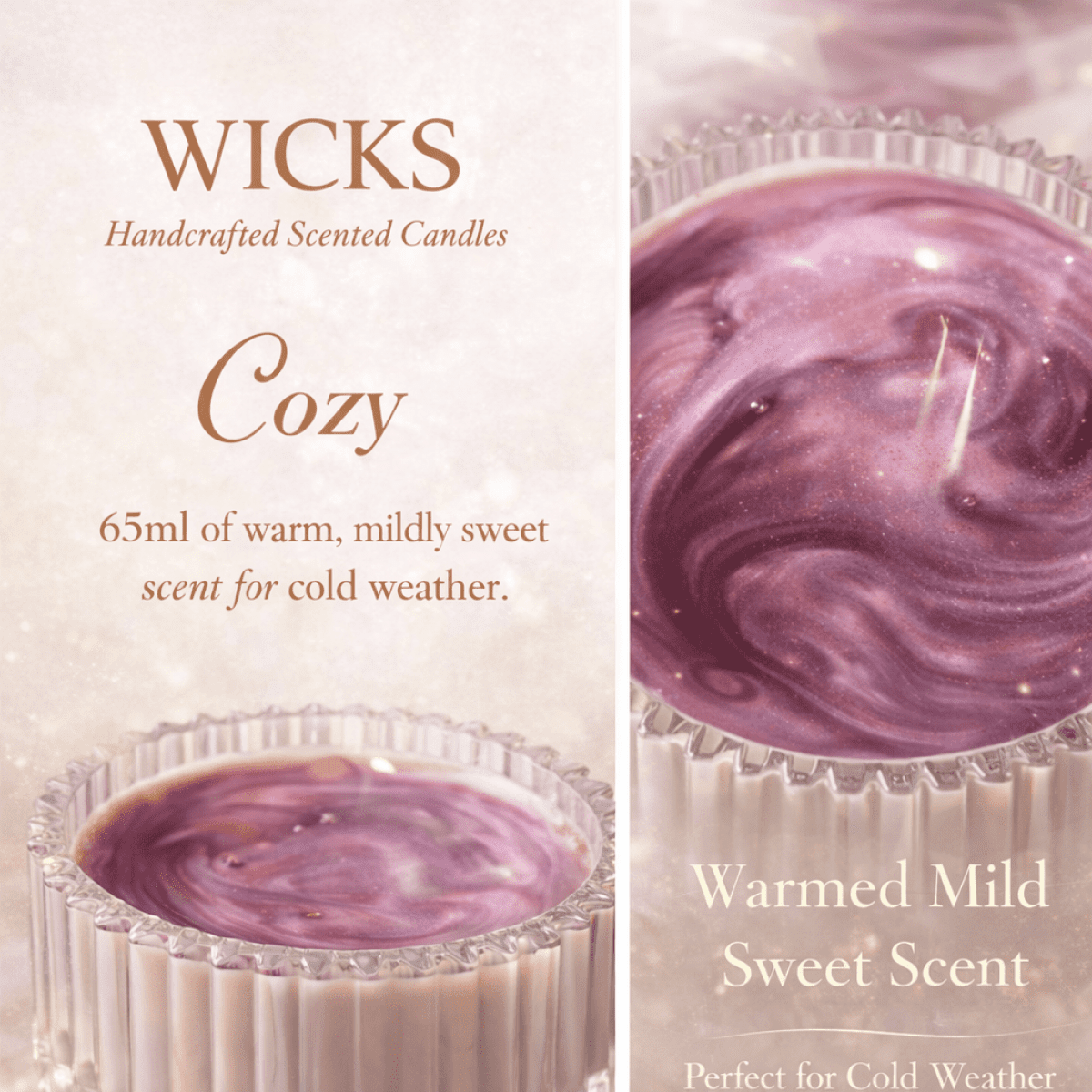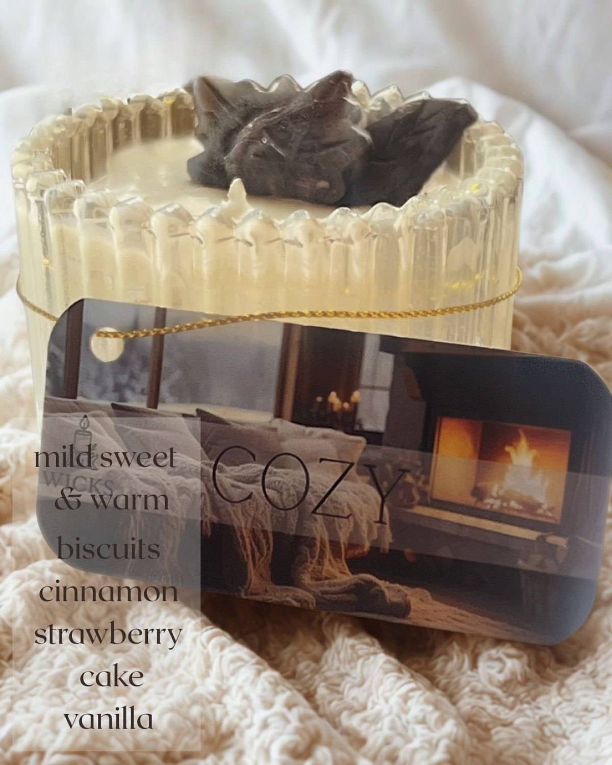 Cozy – شمعة صويا 65 مل بمزيج دافئ من البسكويت، القرفة، وكعكة الفراولة. مصنوعة يدويًا من شمع الصويا الطبيعي 100% لتمنحك راحة ودفئًا في الأجواء الباردة. ✨