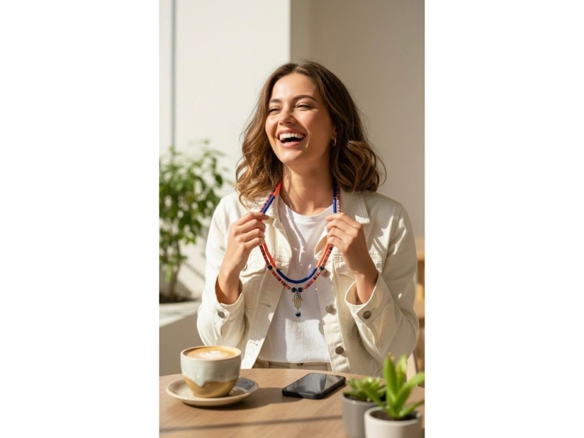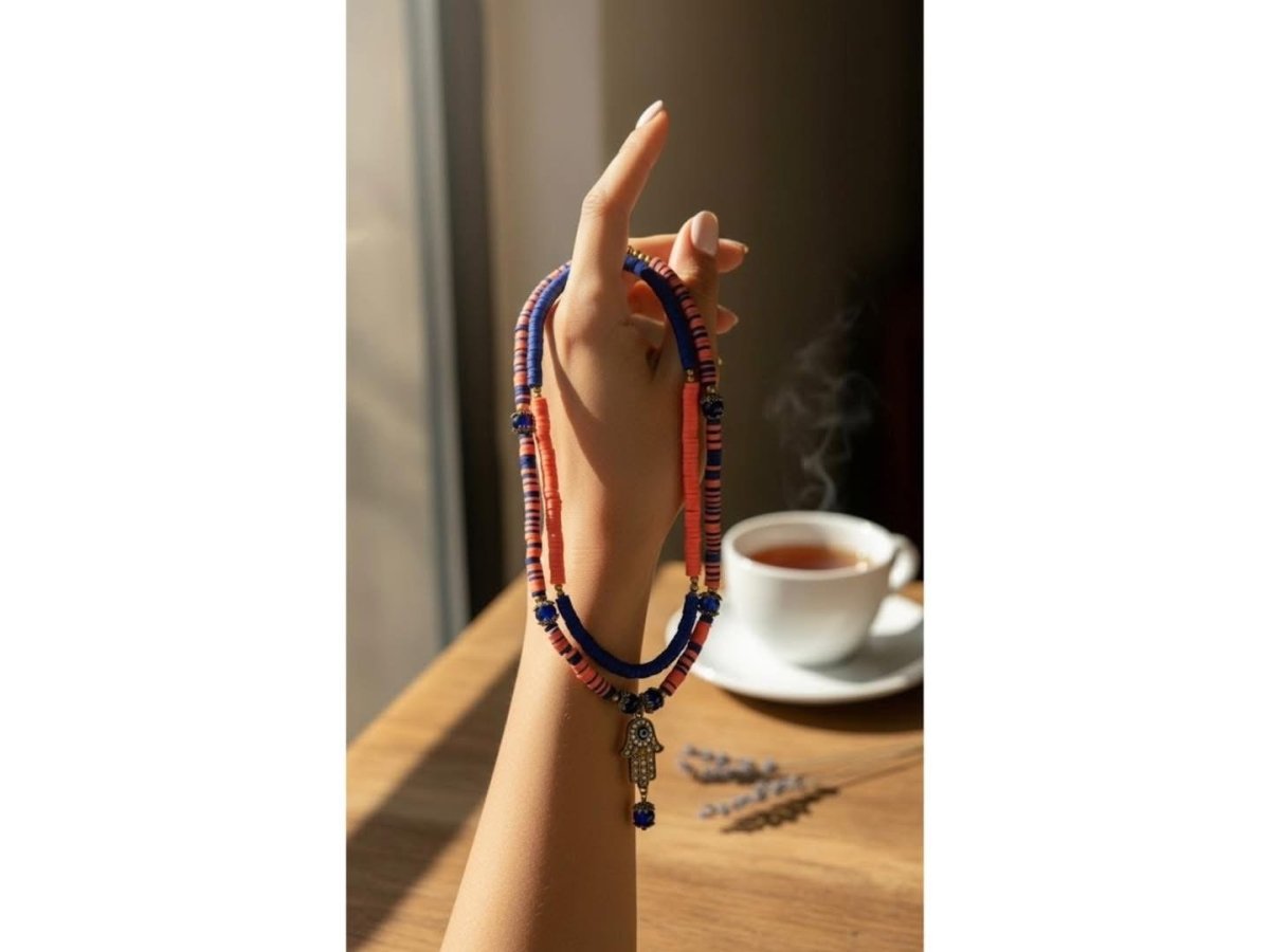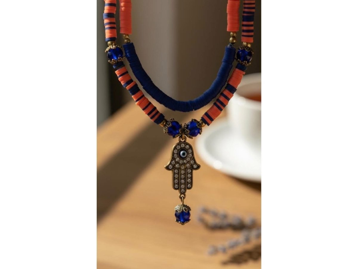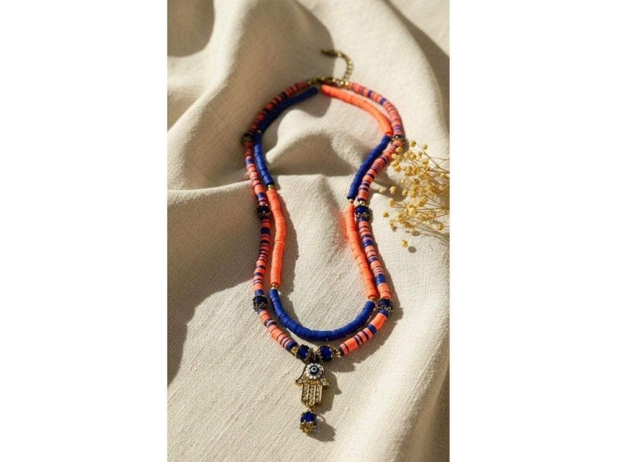 ✨ Glow – همسه جلو ✨ ✨ عيشي روح الجمال الشرقي مع عقد الحماية والأناقة المصنوع من جاميكا الملونه بألوان اورنج والنيلي العميقة. يتوسطه رمز الكف المزدان بحجر عين زرقاء للحماية وجلب الطاقة الإيجابية، مع لمسات ذهبية تضيف فخامة وتميّز. قطعة بتكمّل إطلالتك اليومية وتلمع في المناسبات… عقد بيحكي عن شخصية قوية وذوق مختلف. ✨