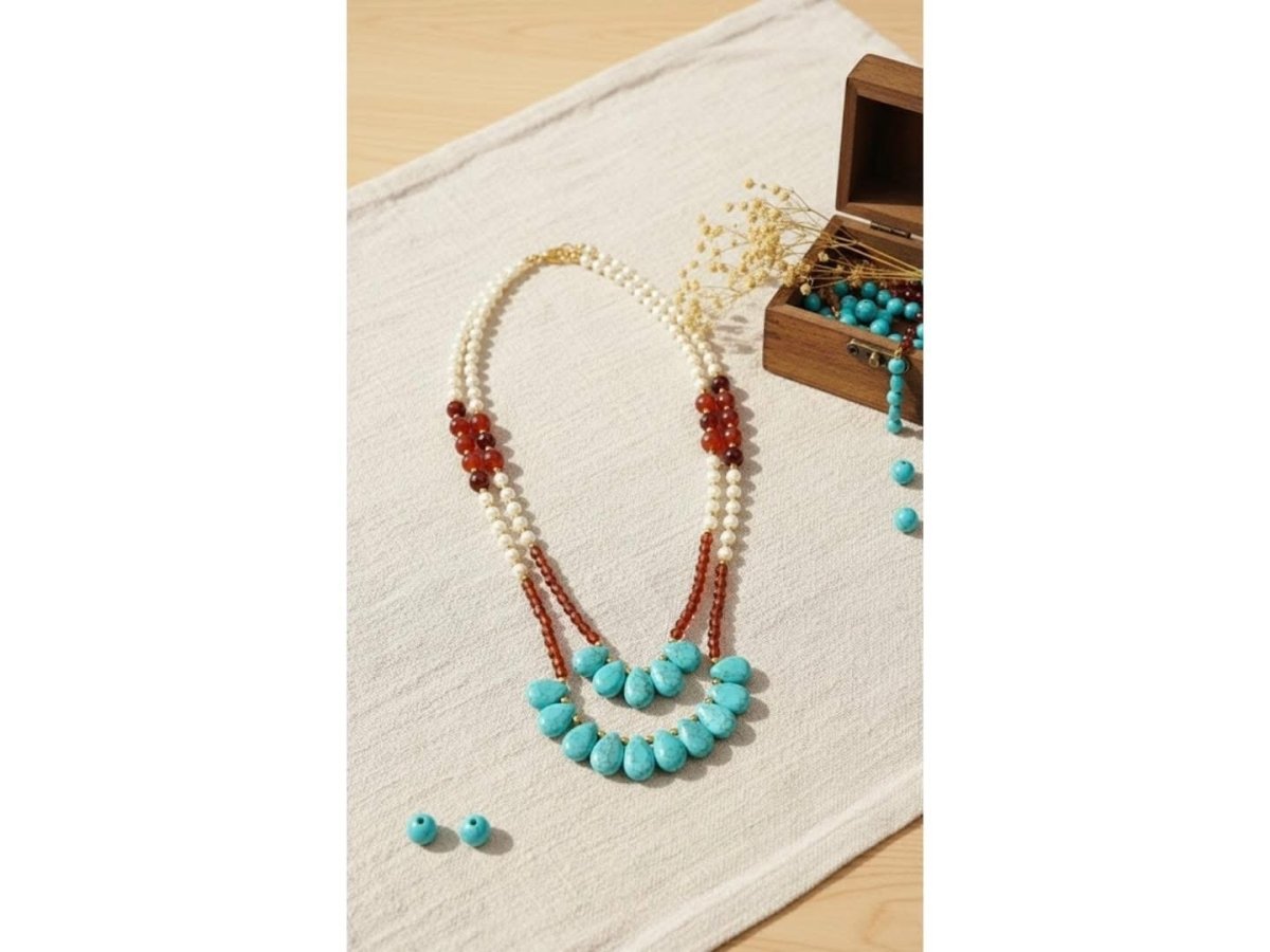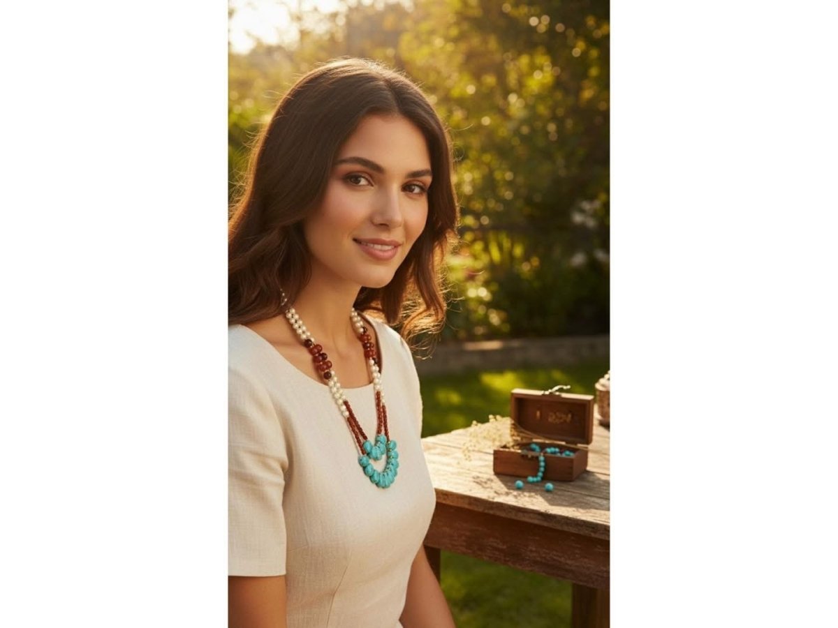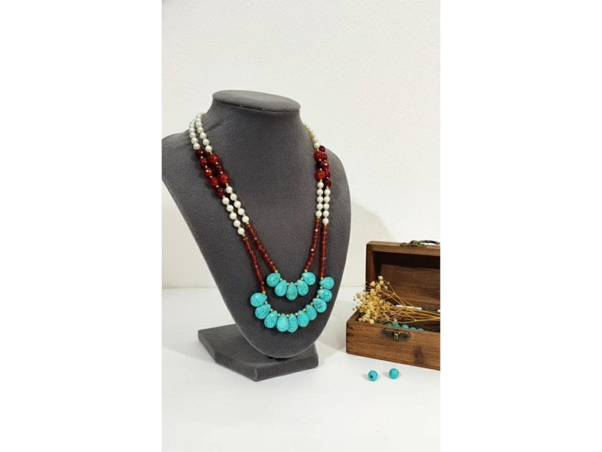 🦋🦋عقد نسمات الفيروز🦋🦋 ✨عقد أنيق يجمع بين لمعة اللؤلؤ الناعمة و دفء حجر العقيق الأحمر مع لمسة مميزة من الفيروز الطبيعي في المنتصف. تصميم ثلاثي الطبقات يمنحك مظهرًا راقياً يجمع بين الأصالة والأنوثة، مناسب للإطلالات اليومية والمناسبات الخاصة. قطعة فريدة تعكس ذوقك وتضيف لستايلك لمسة فنية تشد الأنظار بكل بساطة.