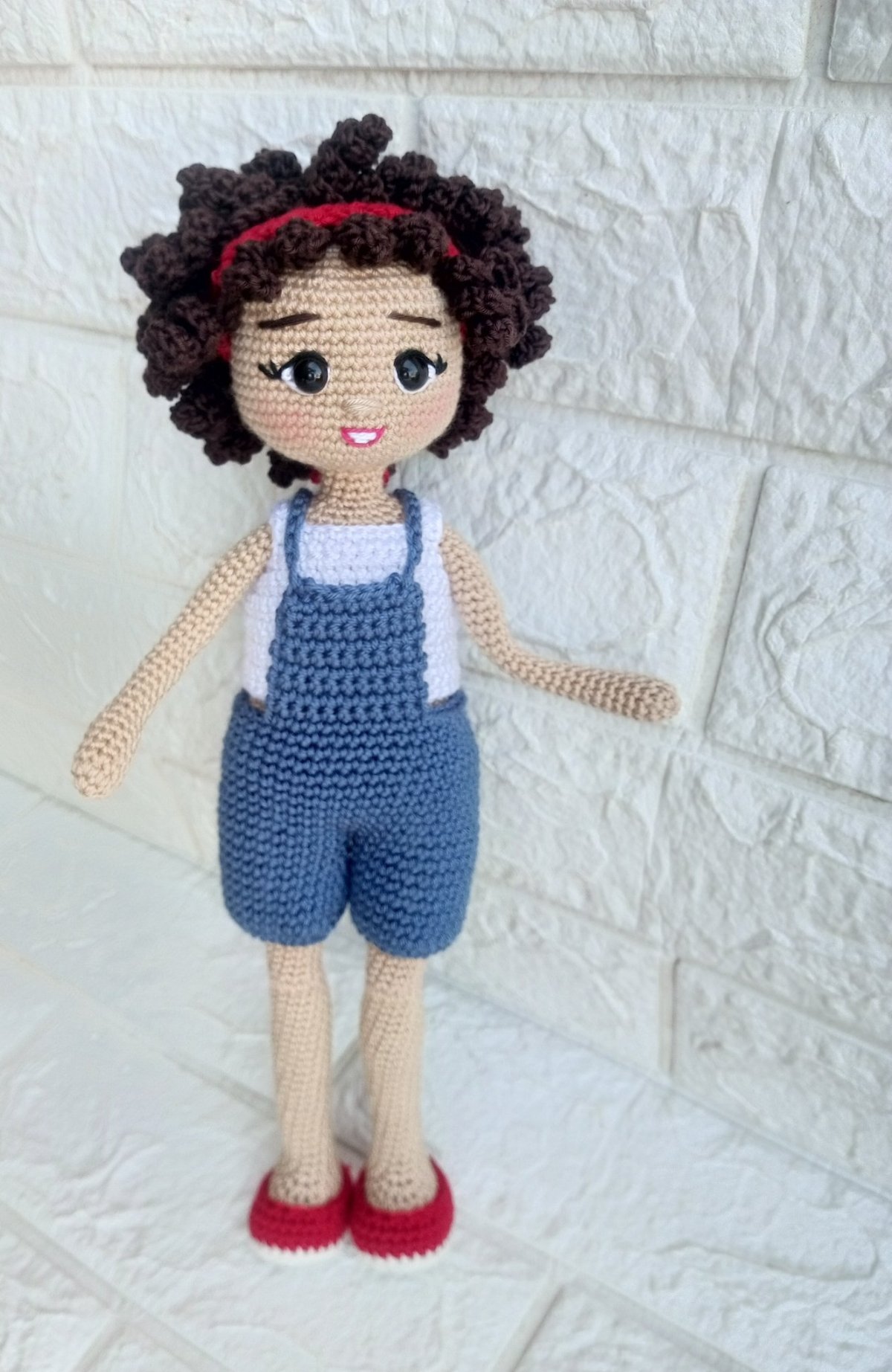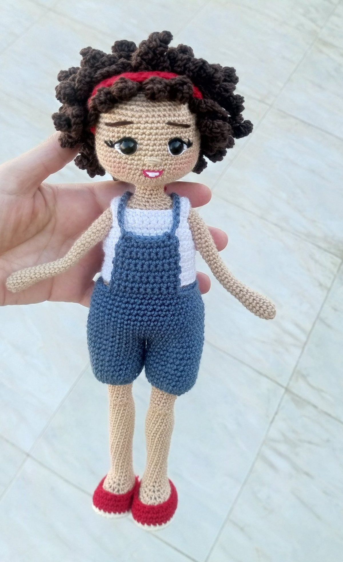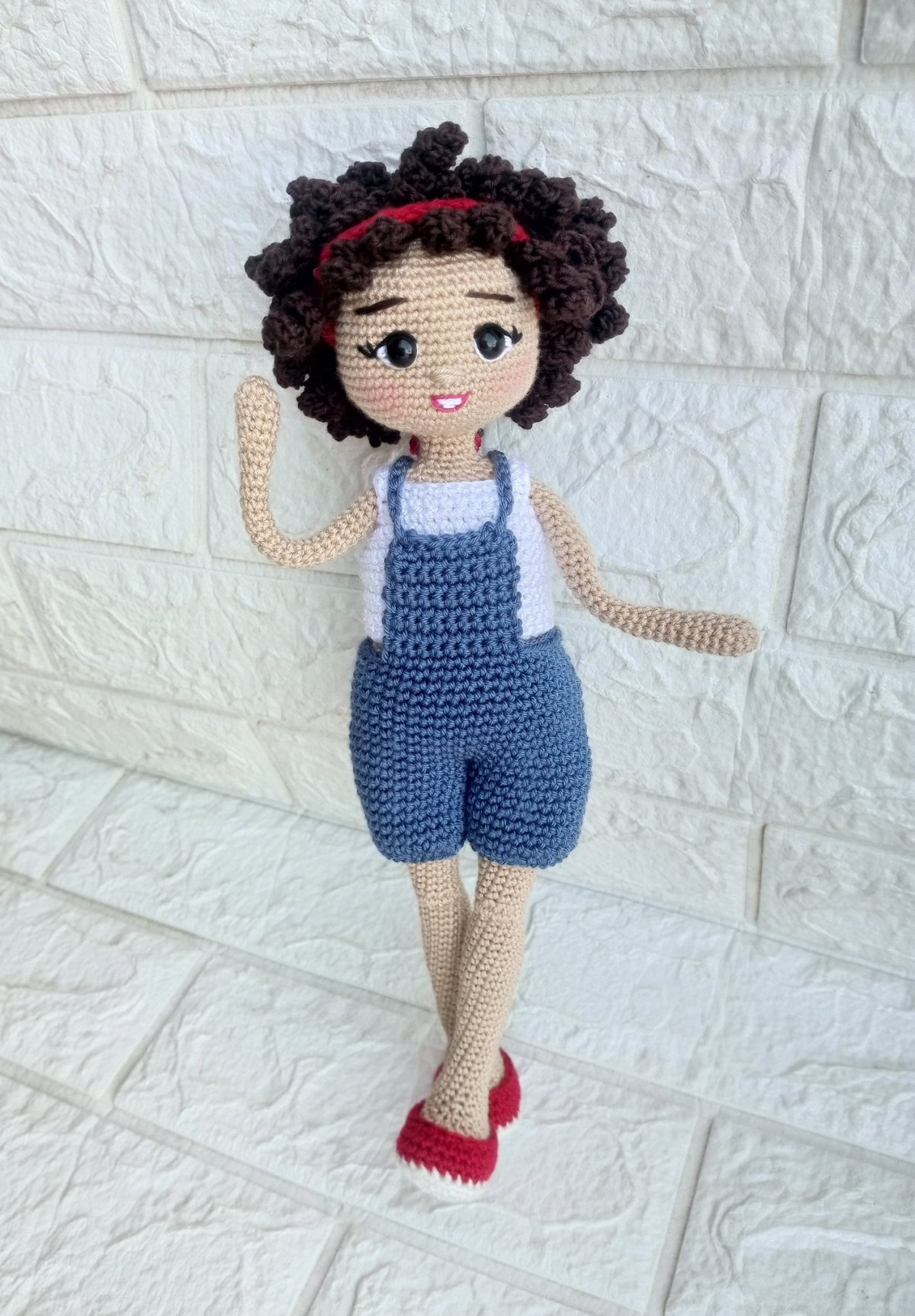 عروسه ايموجرامى مشغوله بخيط تركى و مدعمه بسلك نحاس لسهوله الحركه طولها 30 سم تقريبا ملابسها منفصله عن الجسم ملامح الوجه تطريز يدوى و عيون safety الشعر مشغول كروشيه