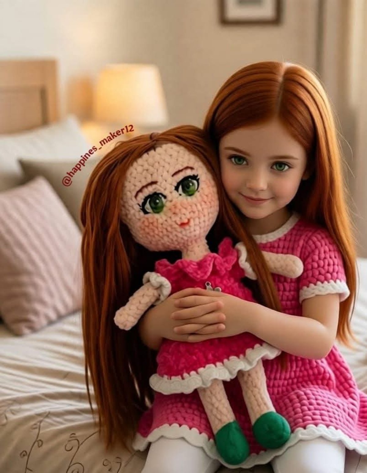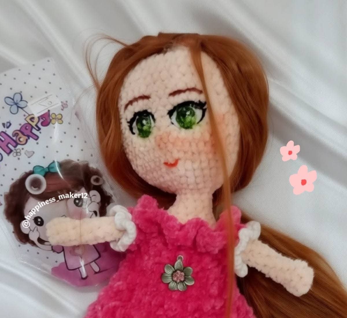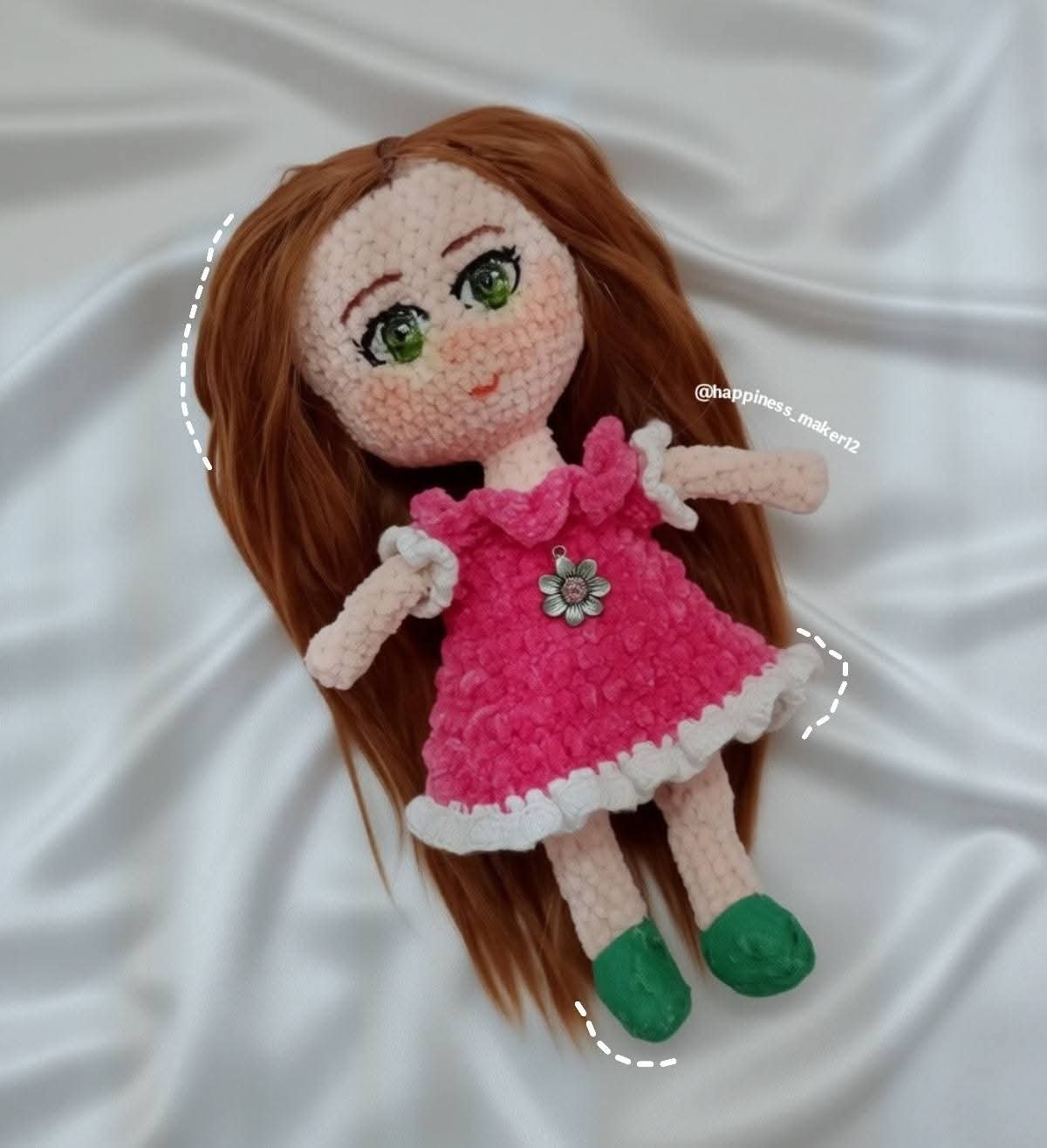 عروسه قطيفه لطيفه بعيون تطريز ٣٠ سم مدعمه بسلك لسهولة الحركه شعر حراري كروشيه اميجرومي