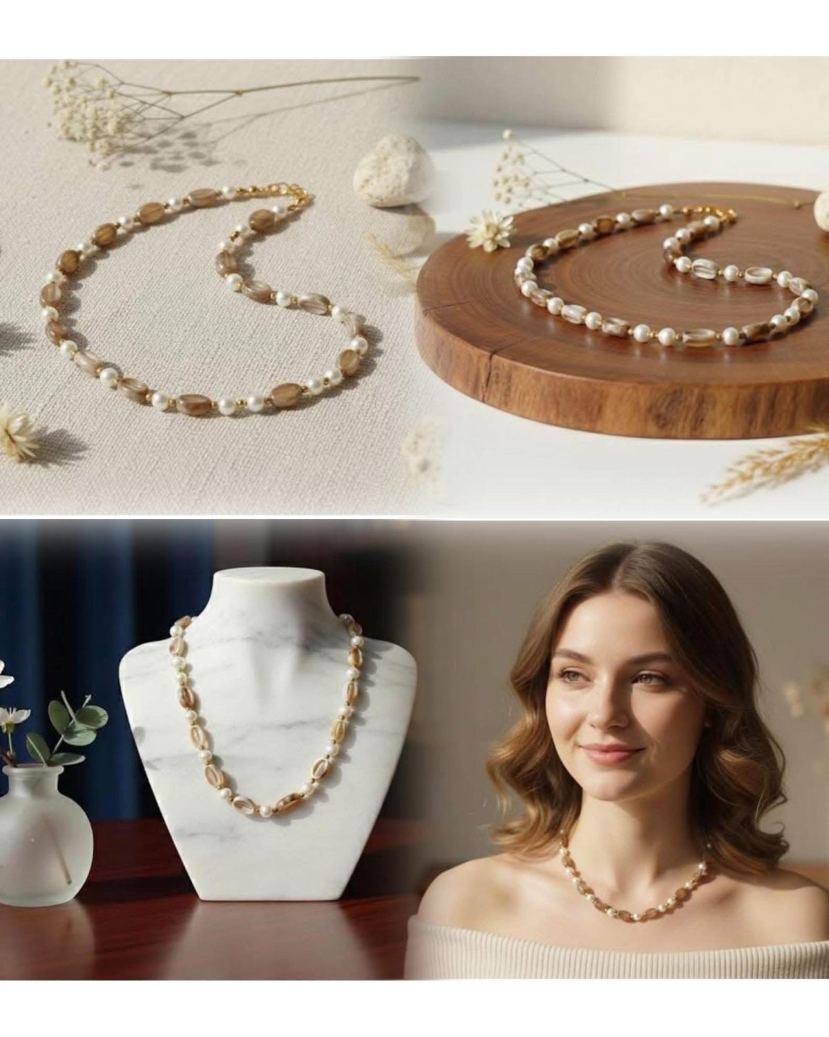 🌸عقد ناتشر بيرل🌸 قلادة أنيقة مستوحاة من هدوء الطبيعة، تجمع بين اللؤلؤ الكلاسيكي وخرز بدرجات البيج الدافئة مع لمسات ذهبية ناعمة. تصميم خفيف وراقي يكمّل إطلالتك اليومية ويمنحك إحساس البساطة والفخامة في آنٍ واحد. مثالية لمحبات الستايل الهادئ والأنوثة الطبيعية 🌾