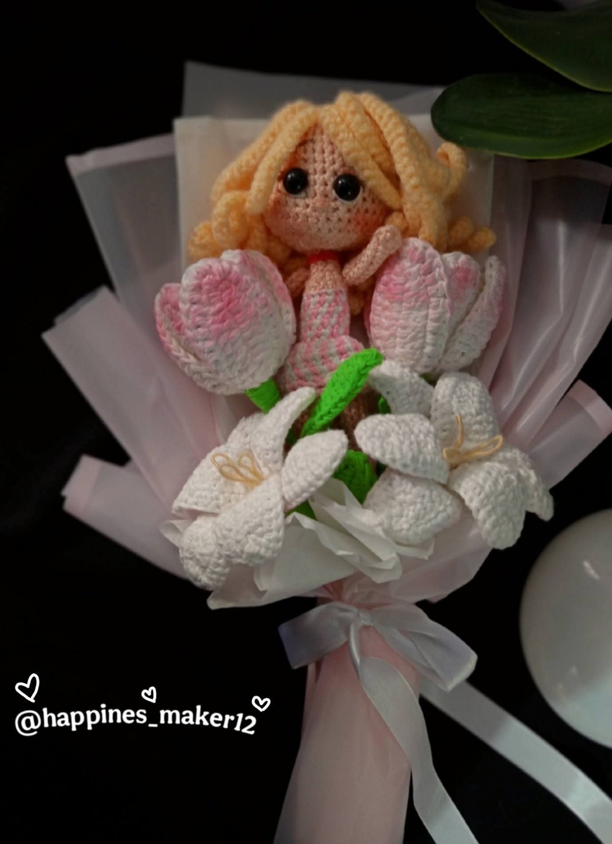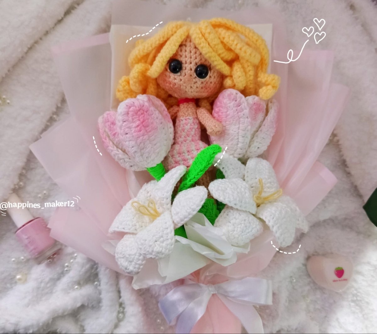 بوكيه ورد التوليب مع شخصية باربي لمحبين الشخصيات الكرتونيه خيوط تركي ورد كروشيه متاح تنفيذ الورد المفضل لك مع شخصيتك المفضله حسب الطلب