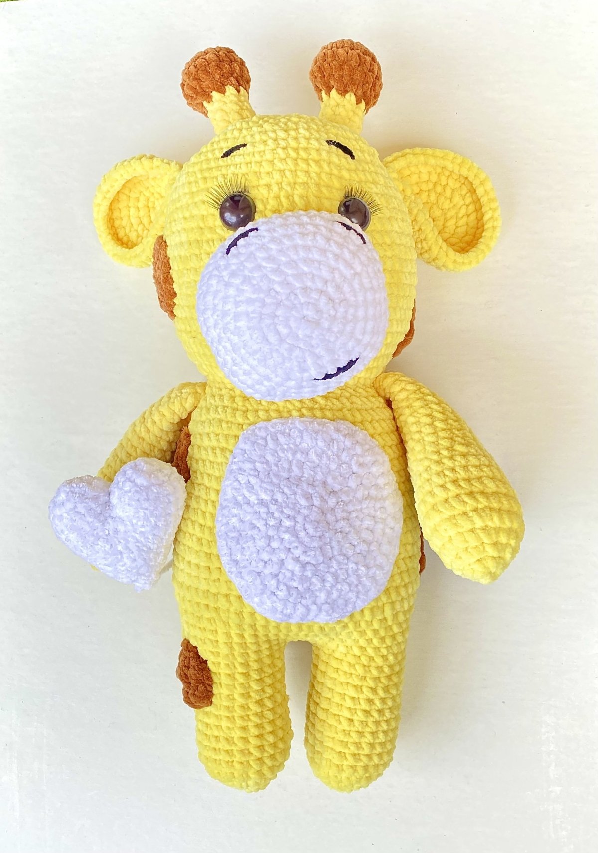 "هدية محببة من القلب! 😊 زرافة كروشيه محشوة فريدة من نوعها، مصنوعة بكل حب ودقة، من خيوط القطيفة الناعمة للغاية قطعة فنية يدوية تنقل الدعم والبهجة إلى أحبائك. مناسبة كهدية مميزة لأي مناسبة! 💕"الطول: 50 سم يمكن صنع قلب معها وكتابة حرف اسمك عليه لتصبح مميزة أكثر!❤️