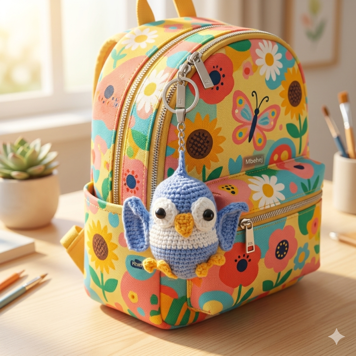 ميدالية يدوية الصنع (Handmade) بتصميم بومة مبهجة، مشغولة بدقة واحترافية من خيوط ناعمة باللونين الأزرق والأبيض. تتميز بعيون واسعة تمنحها مظهراً لطيفاً، مع أجنحة بارزة ومنقار أصفر صغير يضيف لمسة حيوية. مصممة لتكون إكسسواراً مميزاً وفريداً يزين شنطتك ويبرز ذوقك الفني. الحجم: 10 times 10 سم.