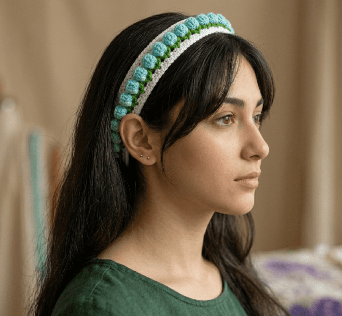 لمسة من النعومة والرفاهية لشعرك مع بندانة التوليب المشغولة يدوياً. الخامة: مصنوعة من خيوط أليزا ديفا (Alize Diva) الشهيرة بتأثير الحرير، والتي تمنحكِ ملمساً ناعماً وبريقاً طبيعياً جذاباً. التصميم: تتميز بغرز ثلاثية الأبعاد (3D) تحاكي زهور التوليب، بتنسيق لوني يجمع بين الأبيض الناصع والفيروزي المنعش. المميزات: الخيط يمتاز بخفته الفائقة ولا يسبب تعرق فروة الرأس، مما يجعلها مثالية للأجواء الحارة وساعات الارتداء الطويلة. الاستخدام: قطعة إكسسوار راقية تليق بالمناسبات الصباحية أو لإضافة لمسة "هاند ميد" فاخرة لإطلالتك.