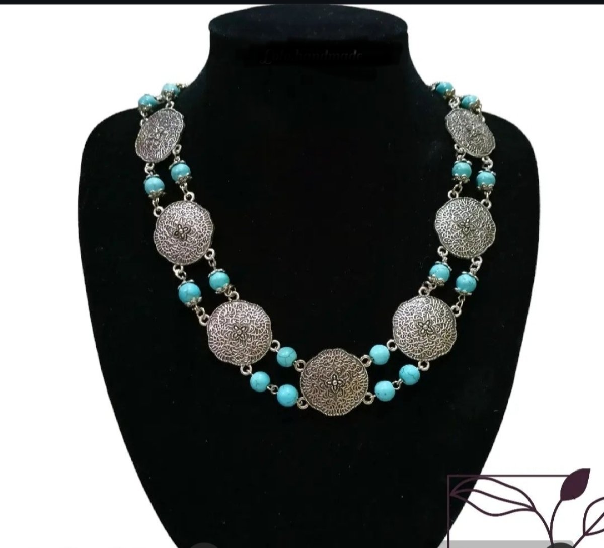 قلاده من حجر فيروزي بتوصيلات معدن فضي اللون بطول 35سم