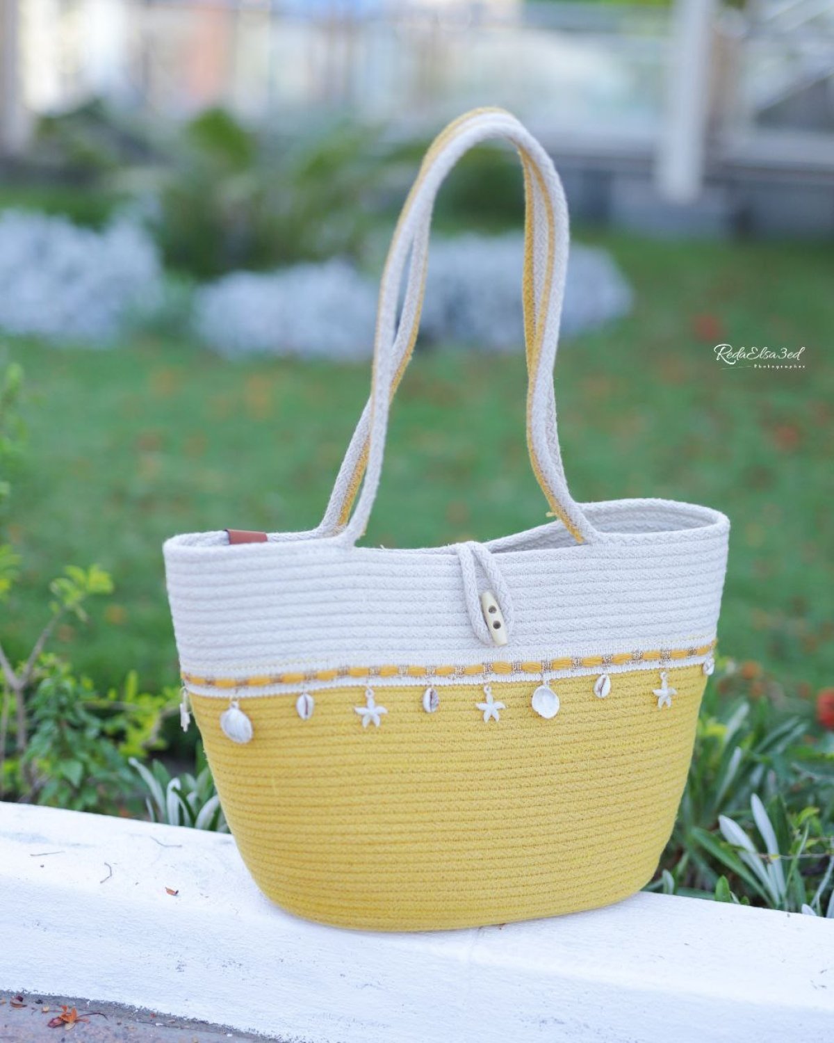 شنطة مصنوعه من حبال القطن الطبيعي صديق البيئة خفيفة الوزن وكبيرة الحجم ومزينة بشريط يتدلى منه قواقع ونجوم البحر
