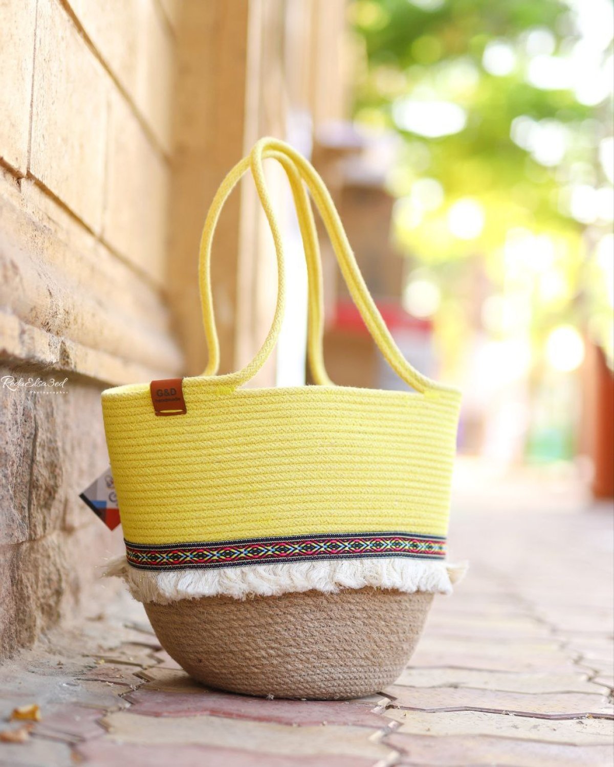 شنطة ذات قاعده دائرية ومزينة بشريط يتدلى منه شراشيب من القطن الناعم مصنوعه من حبال القطن الطبيعي وحبال الخيش البيور