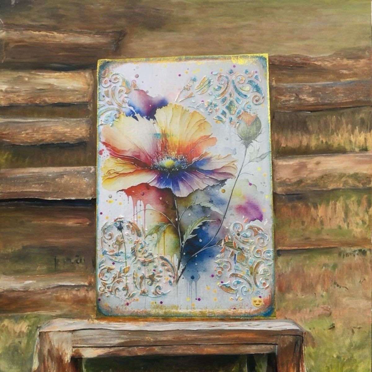 تابلوه زهور دكيوباج خشبي مع اطار ذهبي مرسوم