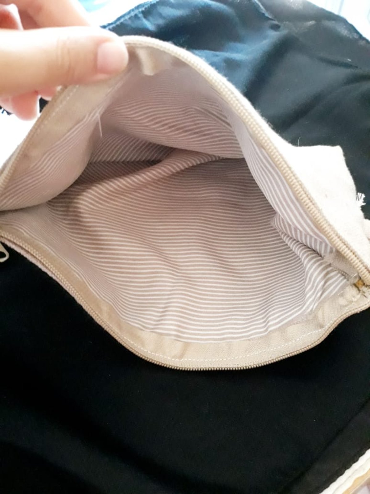 لون كافيه او درجة لون الخيش ومزود بسوستة و يد جانبية