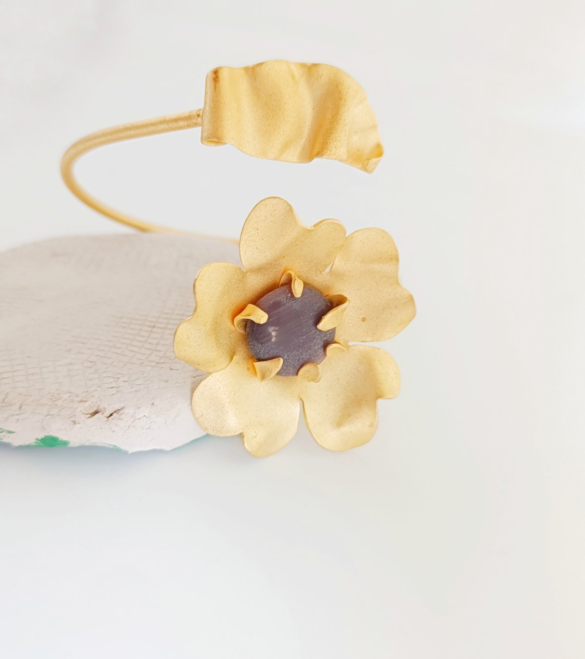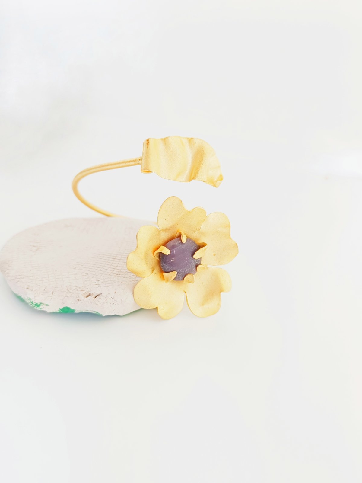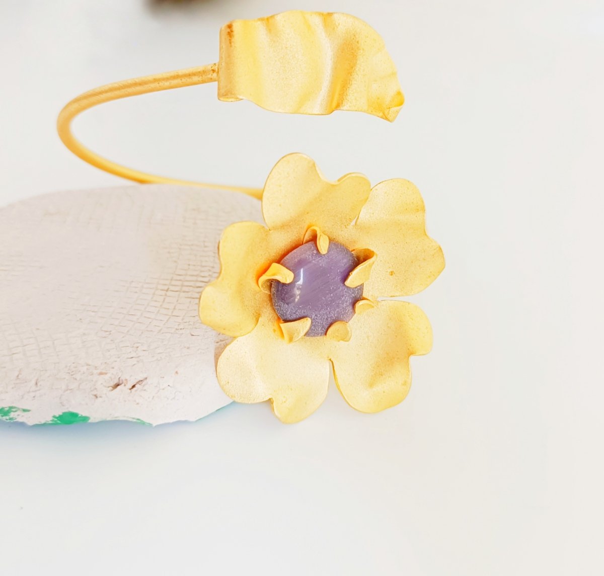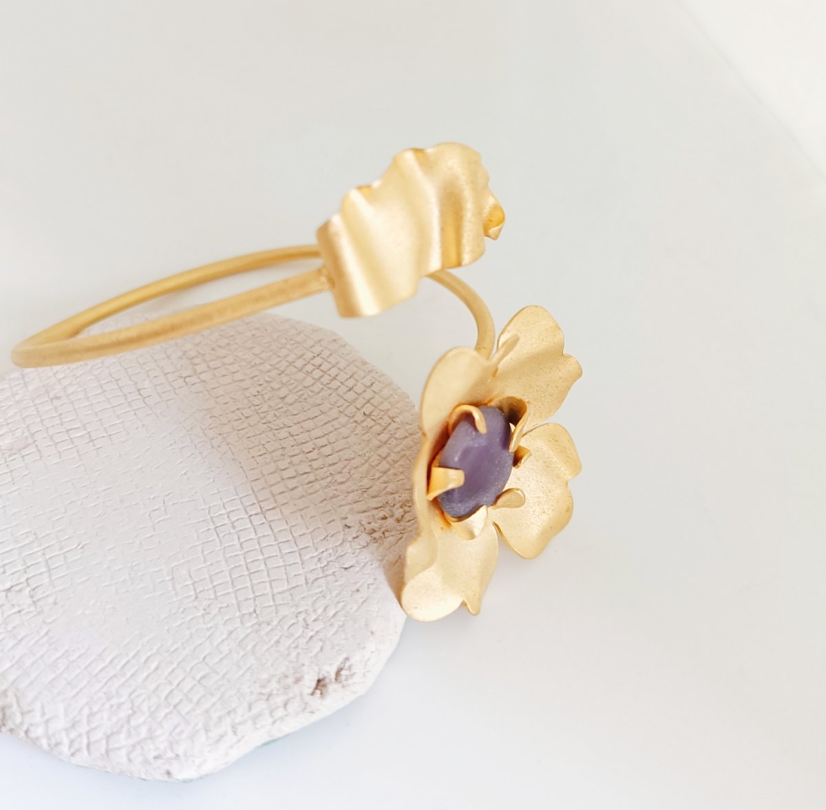 لا نقطف الزهور، ففط نتأمل جمالها سوار من النحاس المطلي ذهب مصنوع يدويا، غير لامع مرصع بحجر اماتيست. مستوحى من الطبيعة
