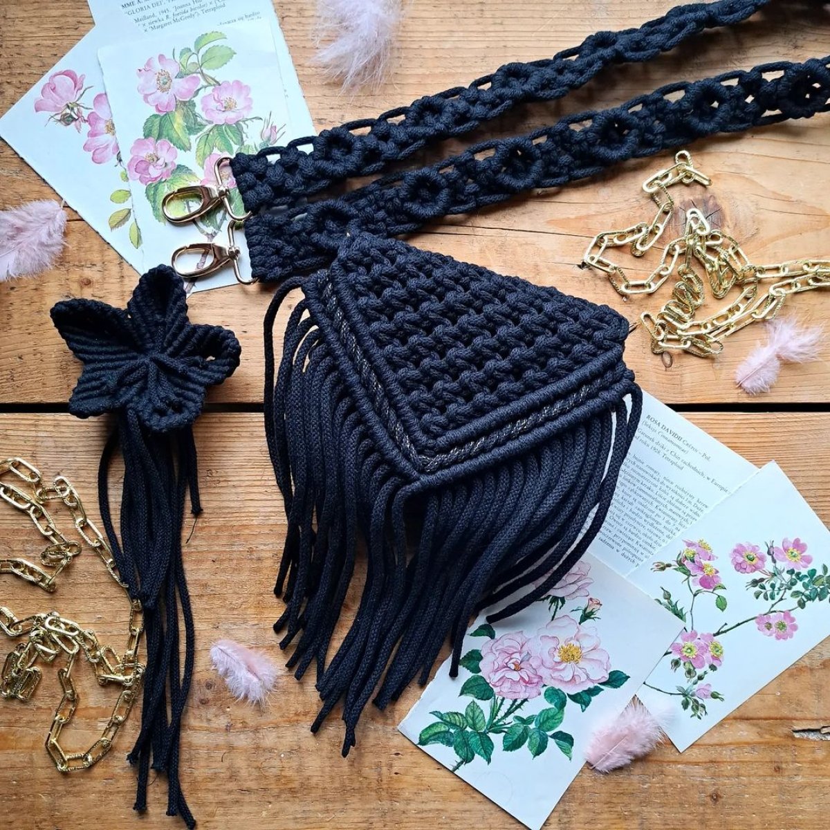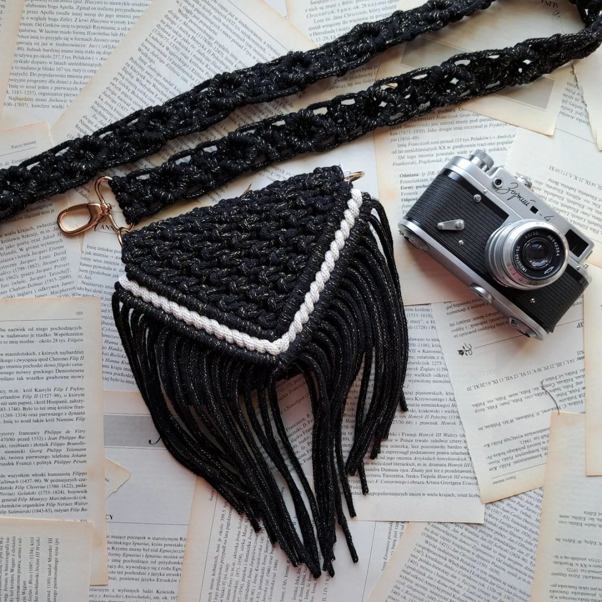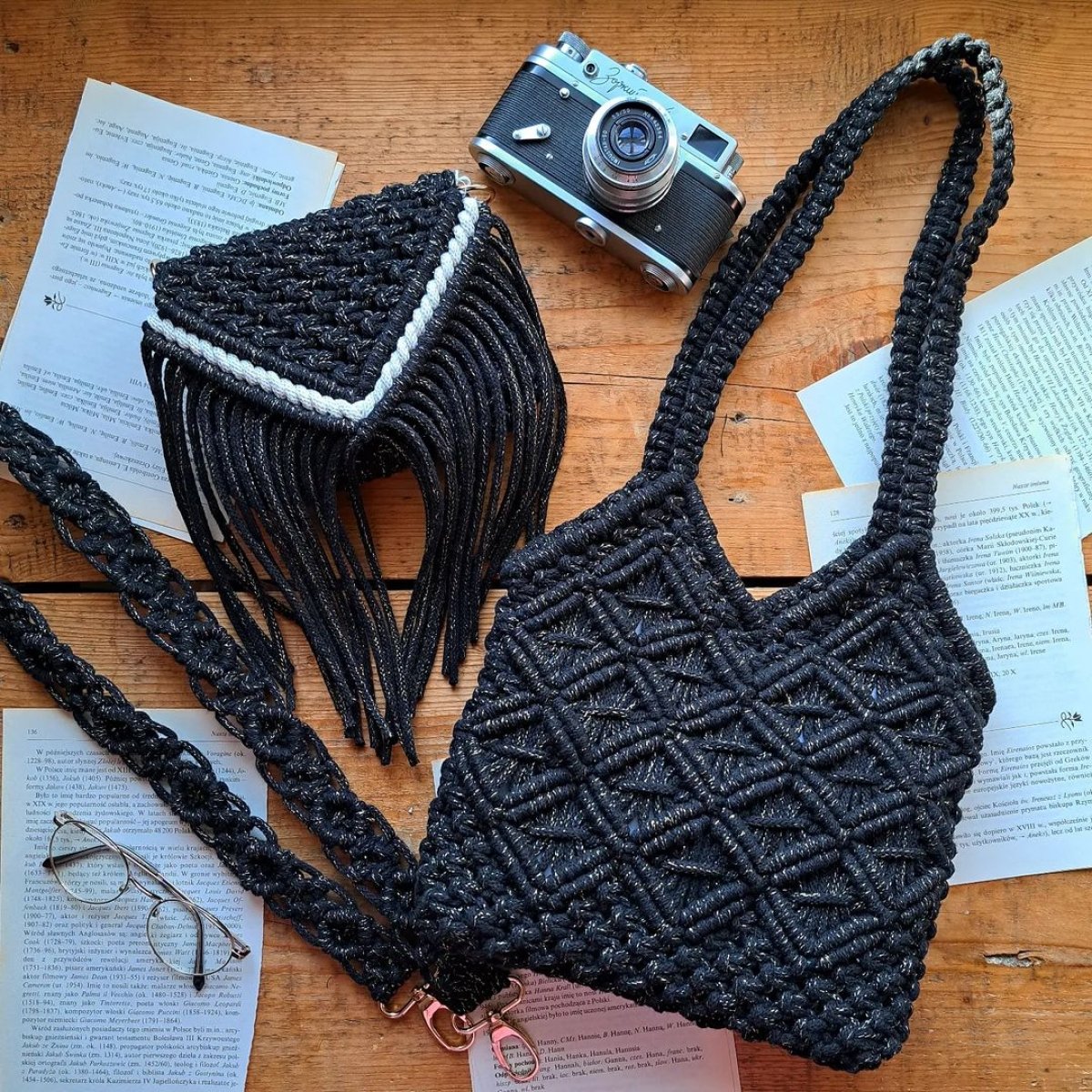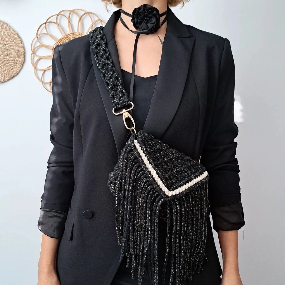 شنطة سوداء أنيق بخيوط المكرمية منسوج بخيط ذهبي اضافة الى حامل طويل للكتف مقاس : 90 سم الشنطة : عرض 20 سم : وطول 25 سم