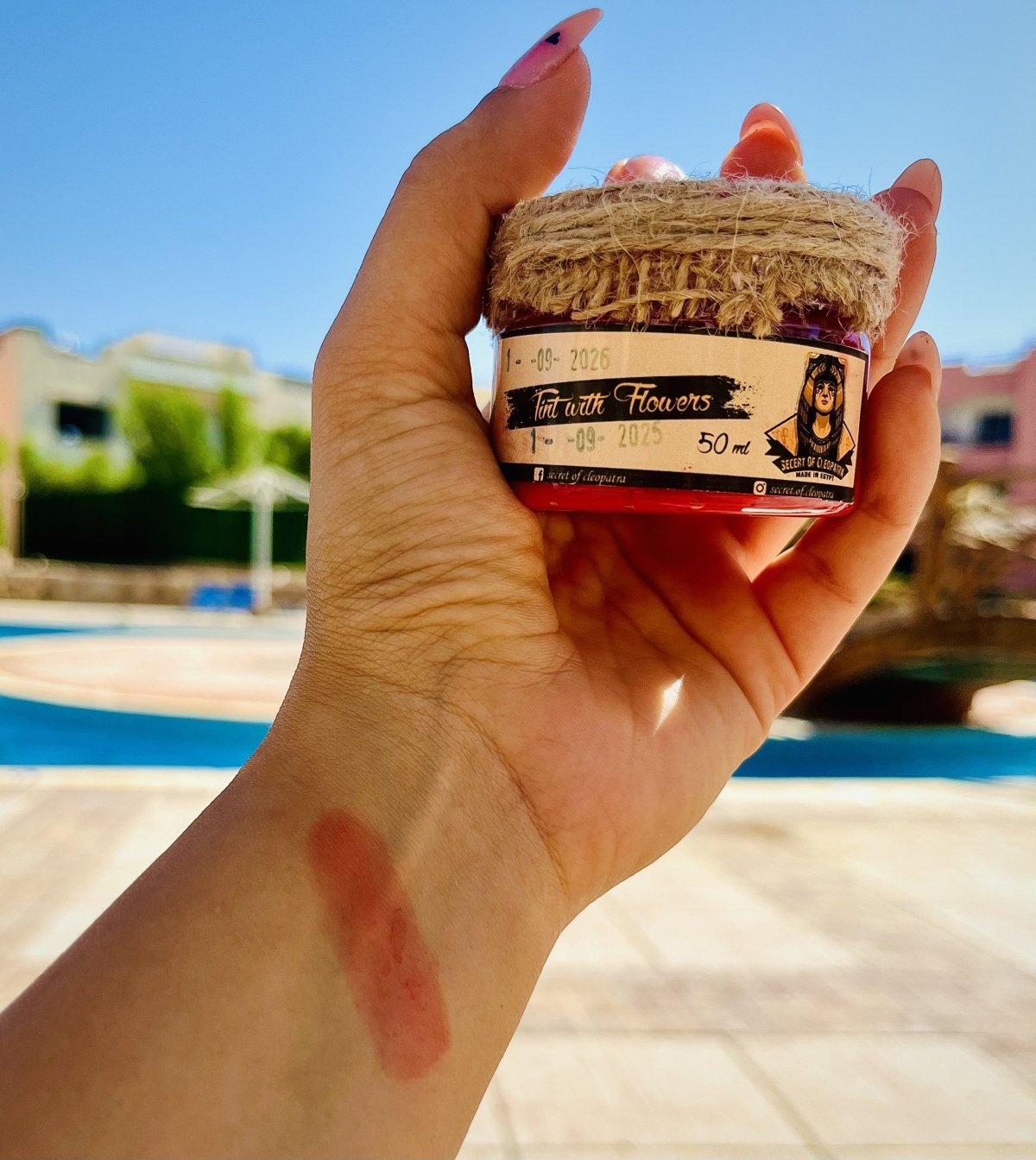 الى بيميز التنت من سيكرت اوف كليوبترا ان بيتم سحب اللون عن طريق عملية تكمير للورد الاحمر فى احواض زيت اللوز الحلو النقى لمدة من الوقت لسحب اللون والفيتامينات من الوردة لتحقيق لون طبيعى الشكل على البشرة