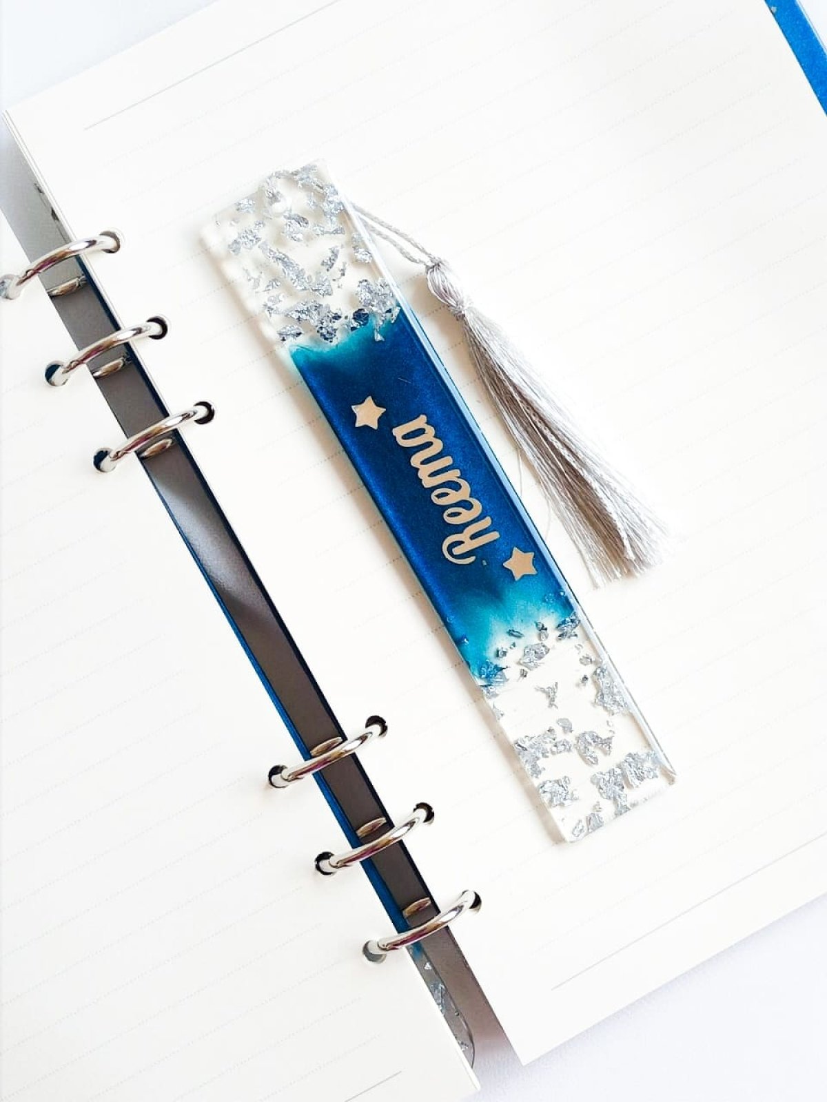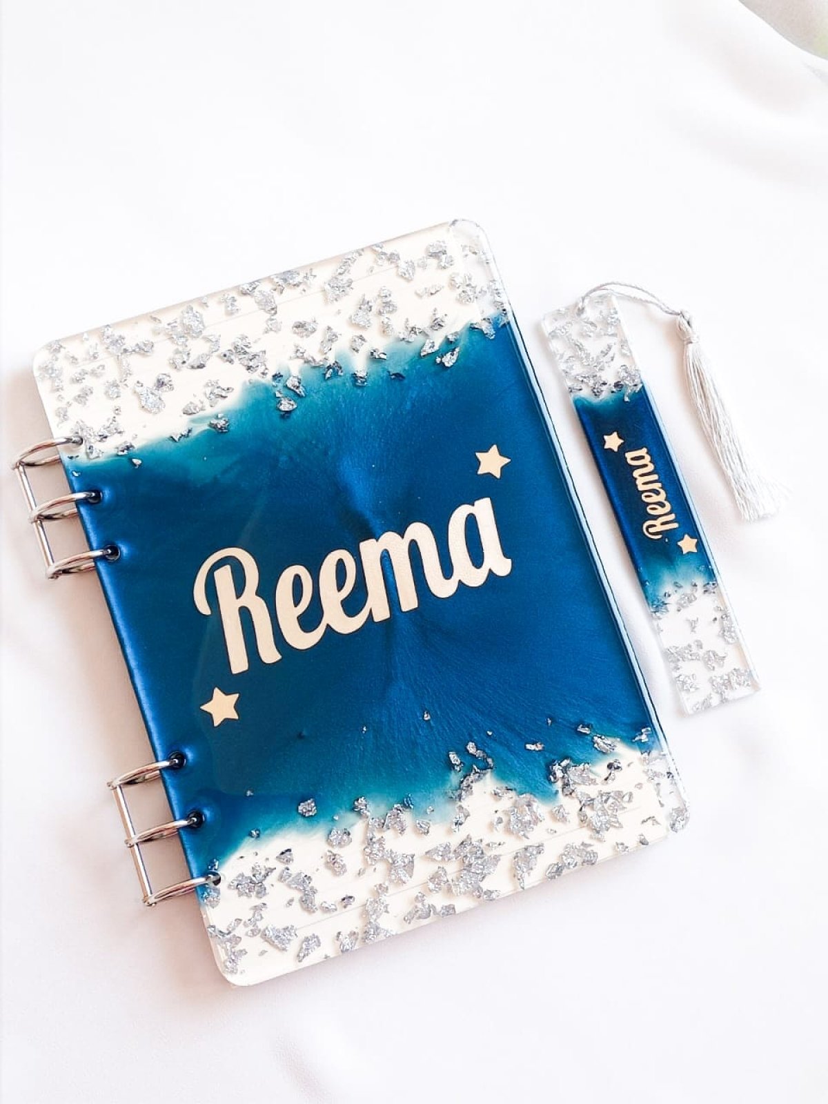 👌🏻مع بوك مارك هديه مقاس ١٤ سم 🔖✨ من اللون الازرق والورق الفضي مع الريزن الشفاف 🤗 تحتوي علي ورق عالي الجوده وعند انتهاءه يمكن فكه وتركيب ورق جديد 👌🏻 متاح تغيير التصميم وكتابه اسم العميل ✨✨