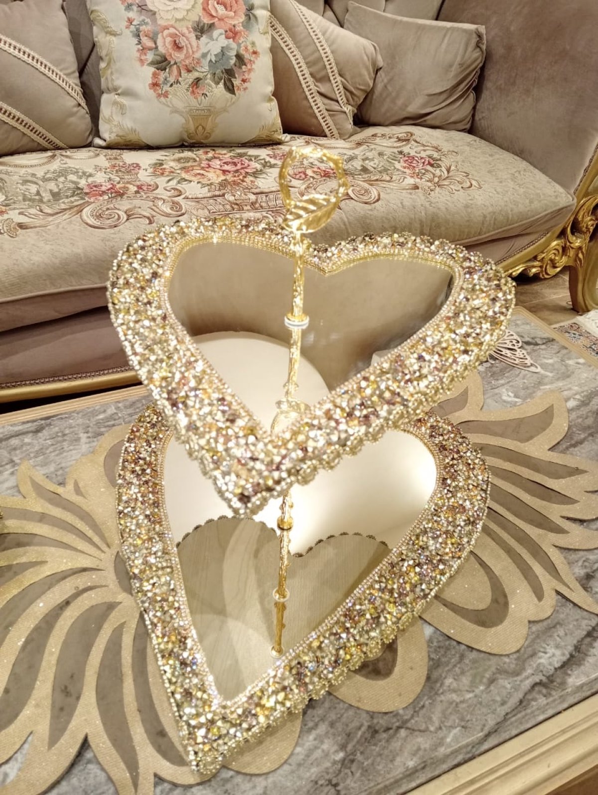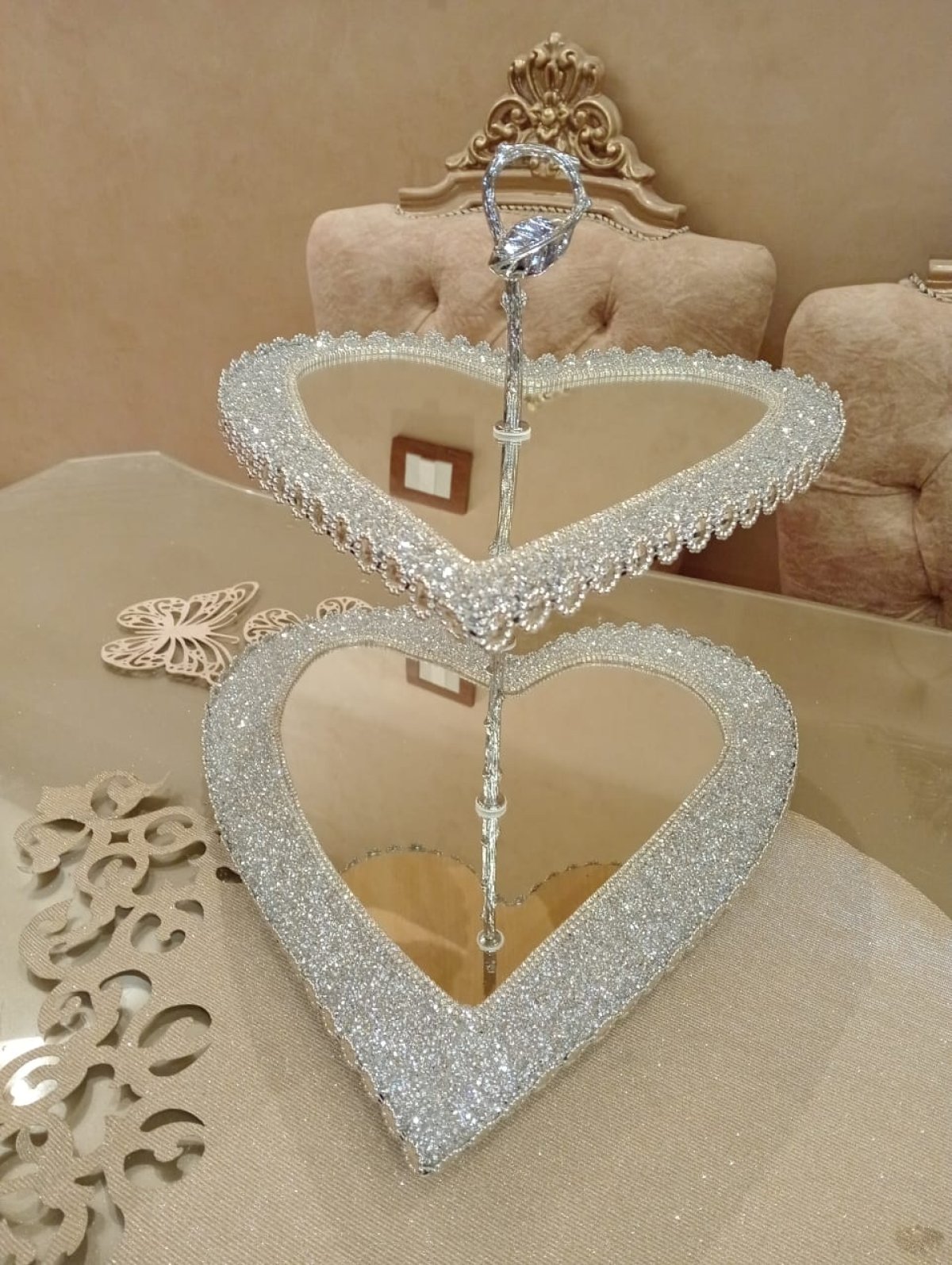 لأصحاب الذوق الرفيع حاملة الكيك والبسكويت على شكل قلب قطعة مميزة جدا تستحق التأمل. المادة عبارة عن مرآة 3 مم. مبطنة من الخلف بخشب MDF لحمايتها من الكسر. مزينة بكافيار مستورد لا يتغير لونه.
