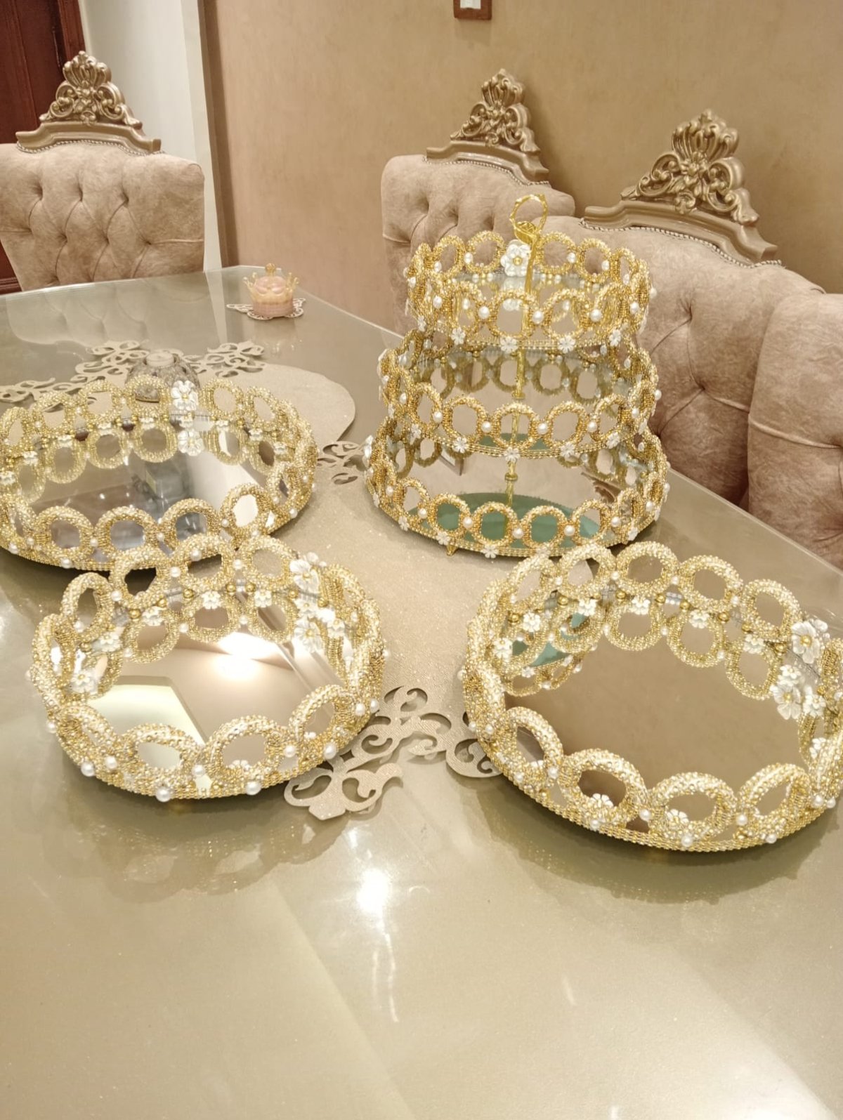 طقم كامل مكون من ثلاث صواني تقديم مرايات مقاس 40سم و35سم و30سم حامل مرايا ثلاث مستويات مقاس 35سم و30سم و25سم علبة مناديل اكريلك حجم العبوة 550 منديل علبة بونبونير زجاج كبير متوسط 2كيلو شوكولاته جميع المرايا مبطنة من الخلف بقطعة من MDF لحمايتها من الكسر الخامة كافيار