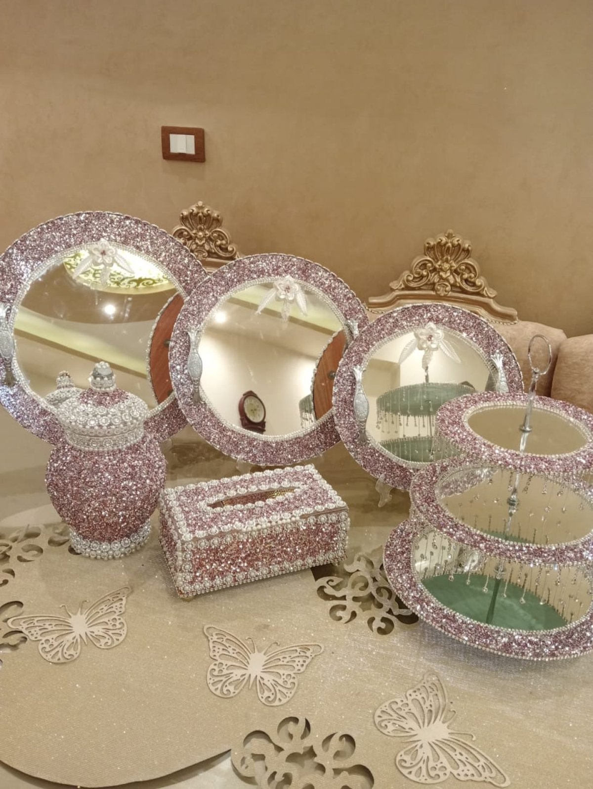 طقم مكون من 6 قطع شيالة بسكويت وثلاث صواني تقديم وبونبونيره وعلبة مناديل لاصحاب الذوق الرفيع