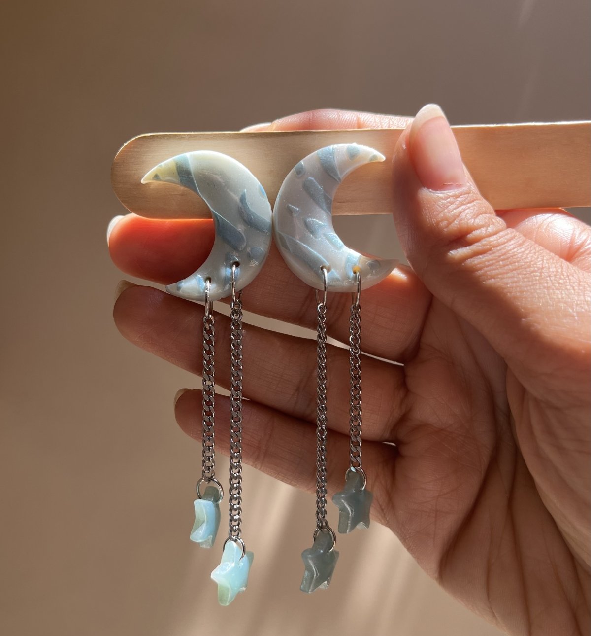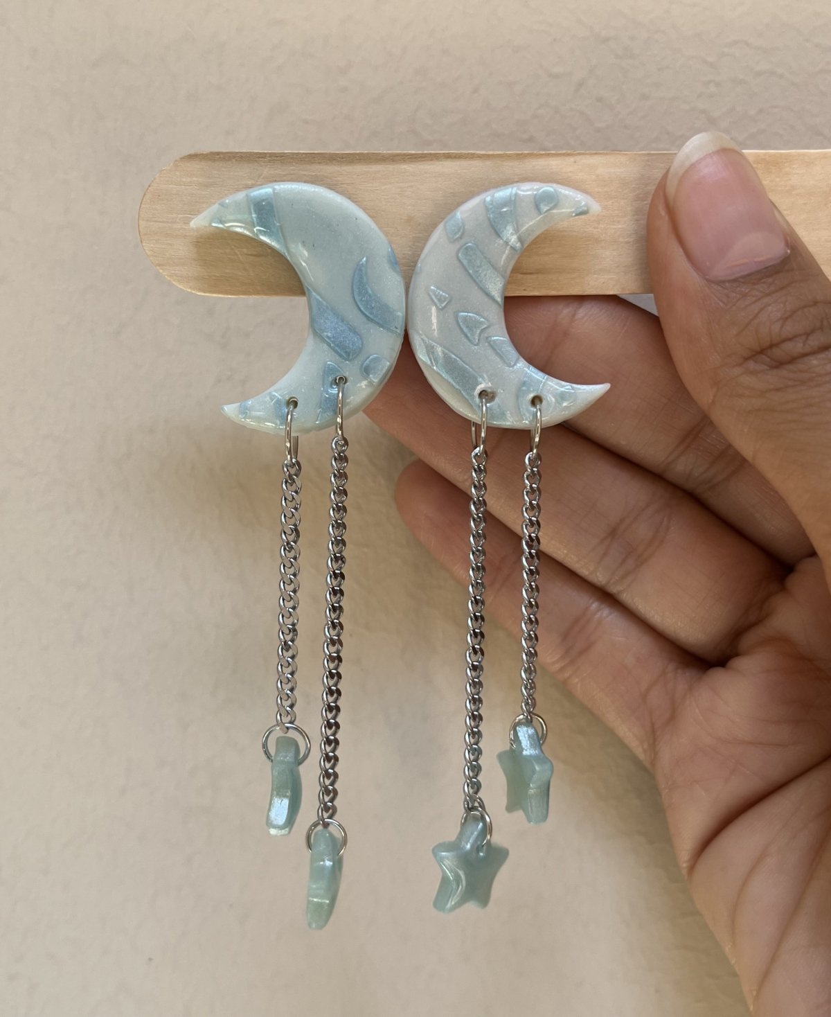 مصنوع يدوياً من الصلصال الحراري ، خفيف الوزن عالأذن مغطى بطبقة من الريزن تزيد من الحماية و تحافظ عالالوان واللمعان مع اجزاء معدن ستانلس ستيل مقاوم للصدأ و لا يسبب الحساسية