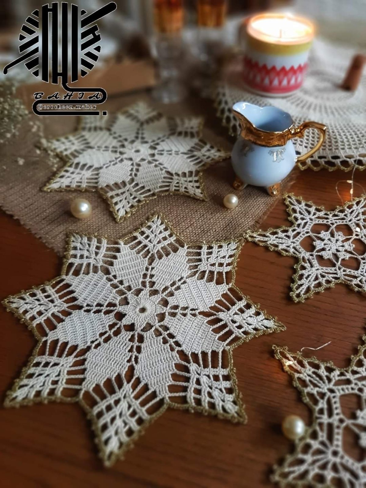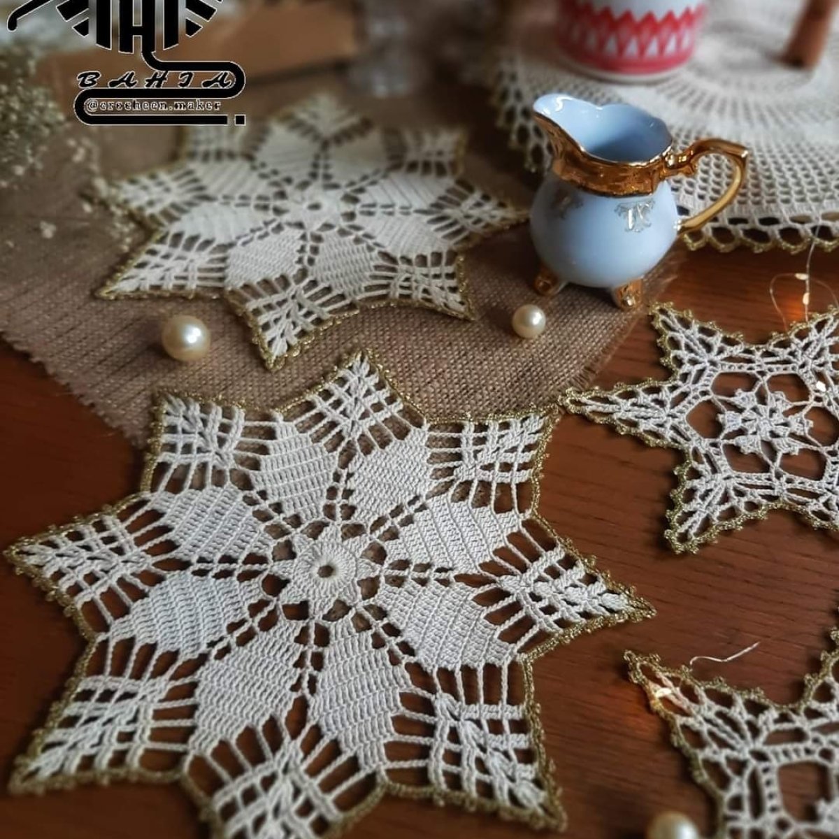 مفرش كروشيه بخيوط القطن مع حرف ذهبي انيق
