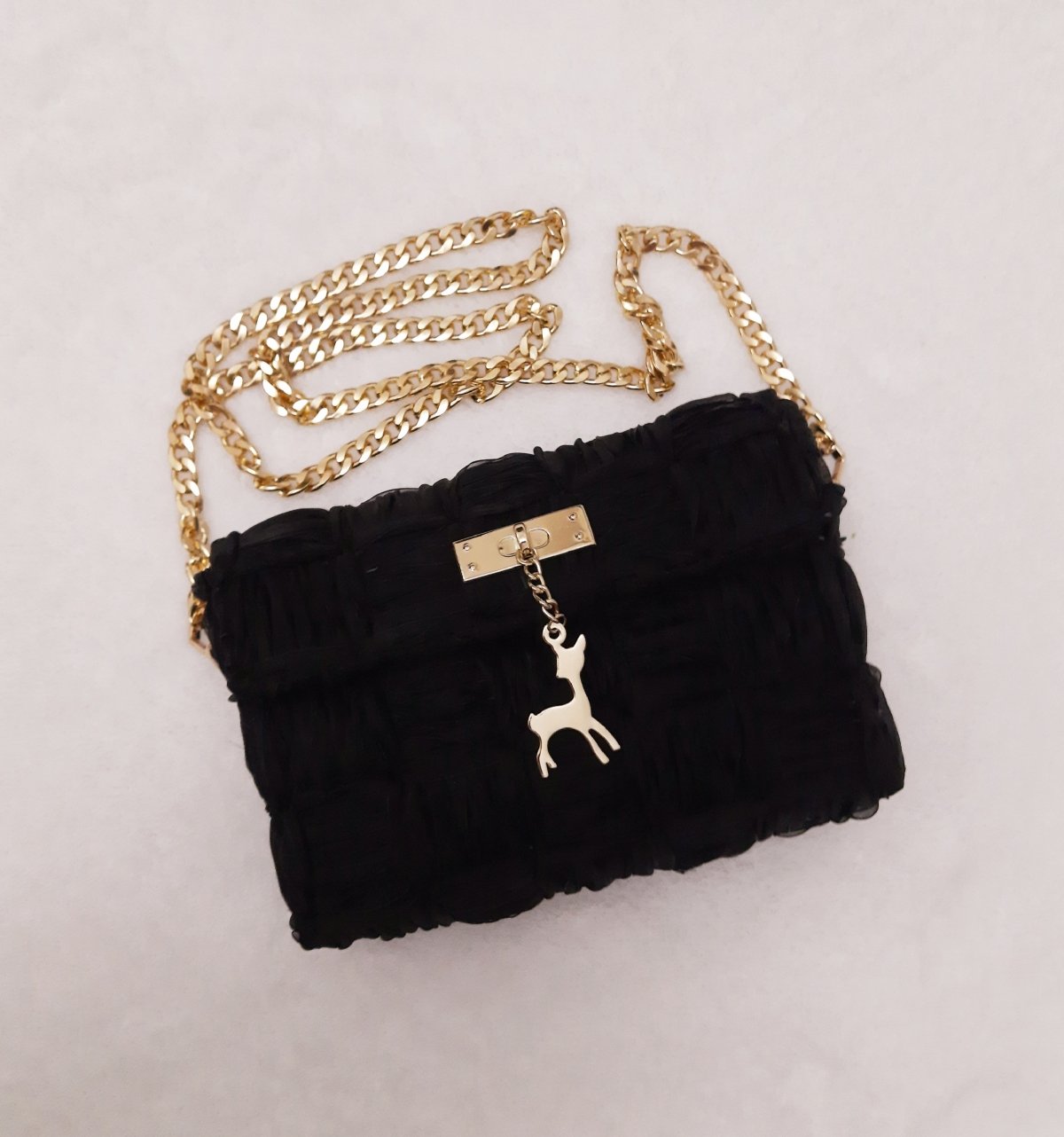 شنطة كنفاه مشغولة بشرايط الاورجنزا . مبطنة من الداخل ولها يد سلسلة . واكسسوار دهبي . متاح تنفيذها بأى لون ومتاح اكسسوار فضى .