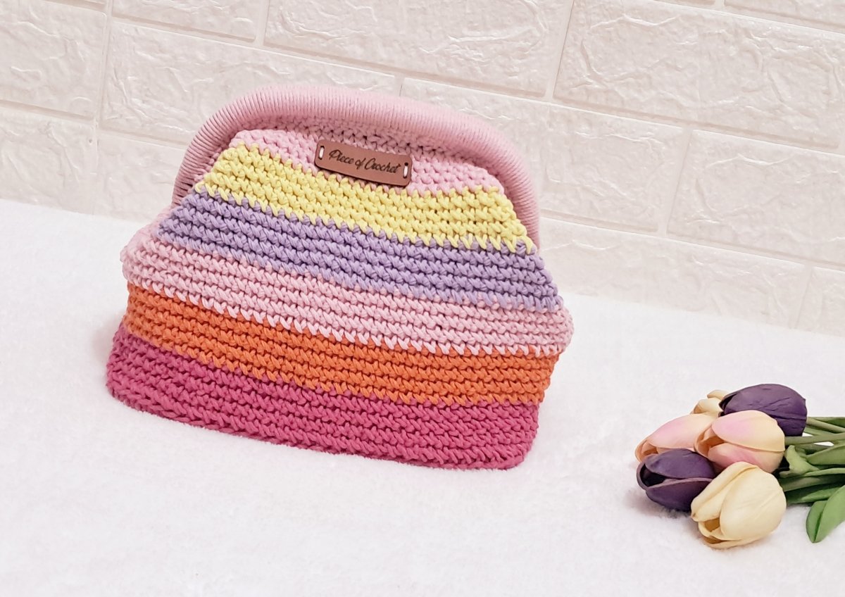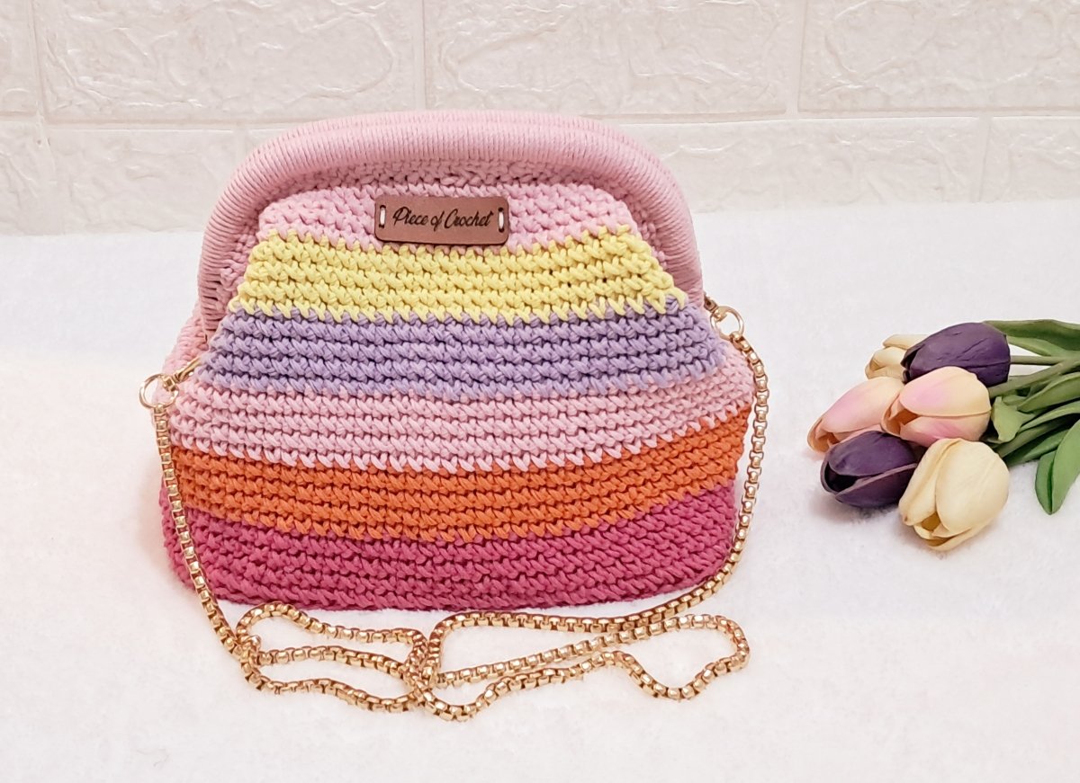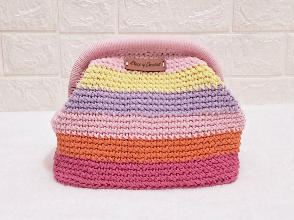 شنطة كروشية ترندى الوان . مشغولة بخيط قطن جودة عالية . مبطنة من الداخل ولها جيب داخلى ولها يد سلسلة الشنطة واسعه من الداخل . عرض القاعدة ٢٢ سم وطول القاعدة ١٦ سم ارتفاع الشنطة ١٨ سم عمق الشنطة ١٧ سم