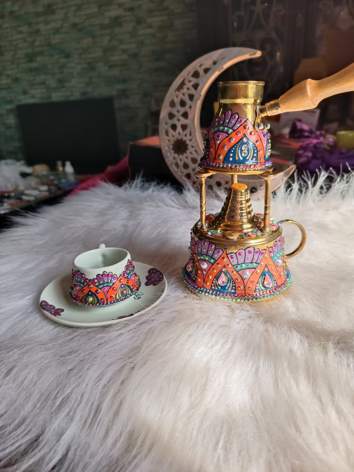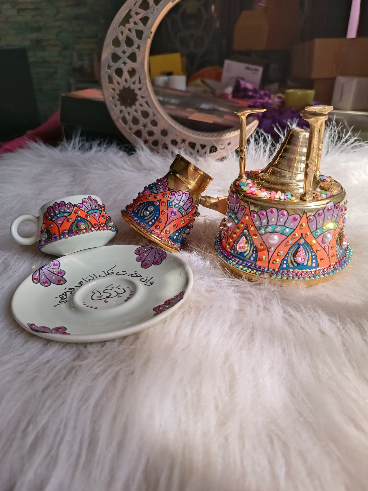 طقم سبرتاية وكنكة نحاس وفنجان قهوة برسم يدوي وترصيع كريستال