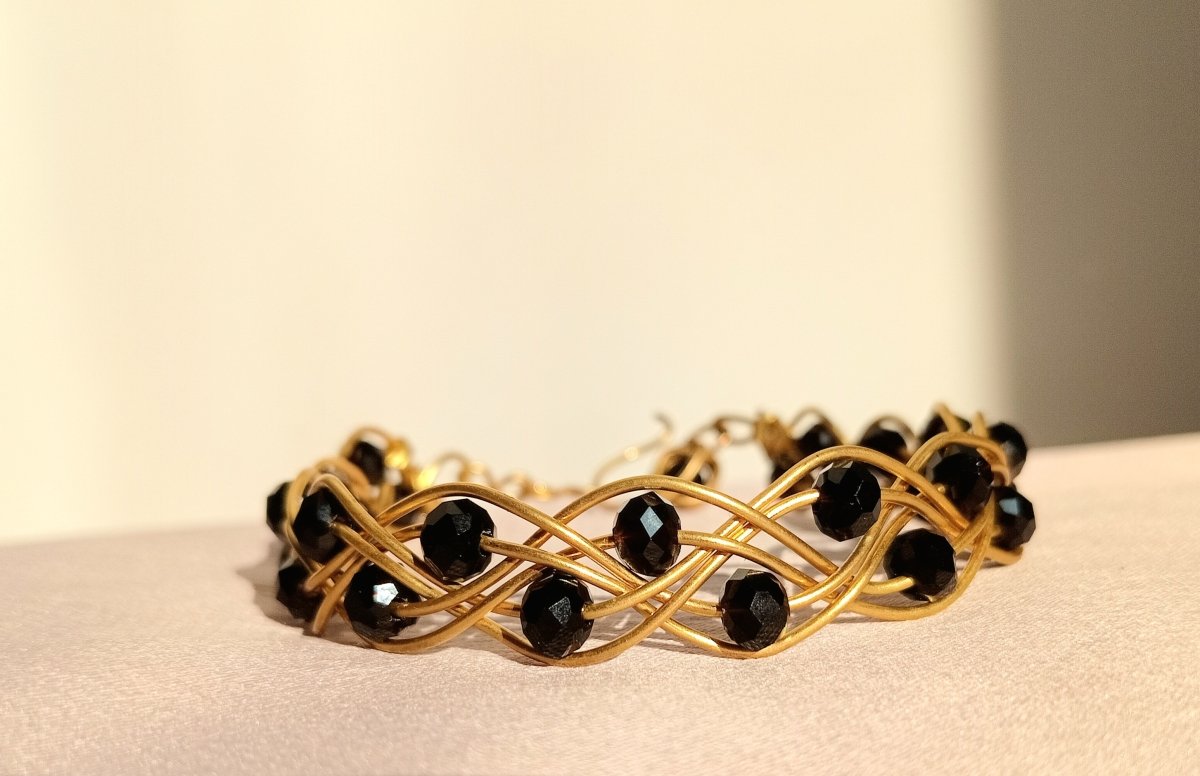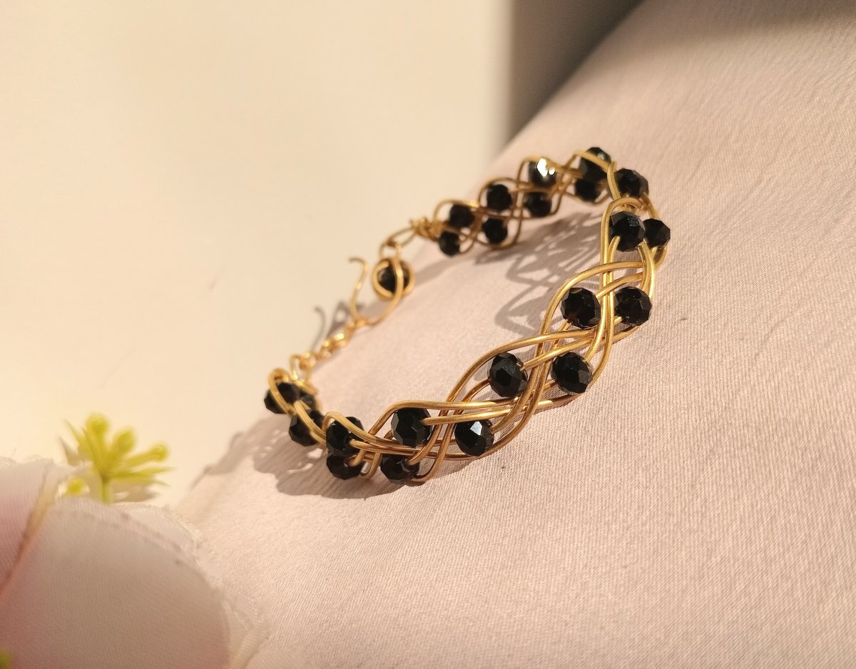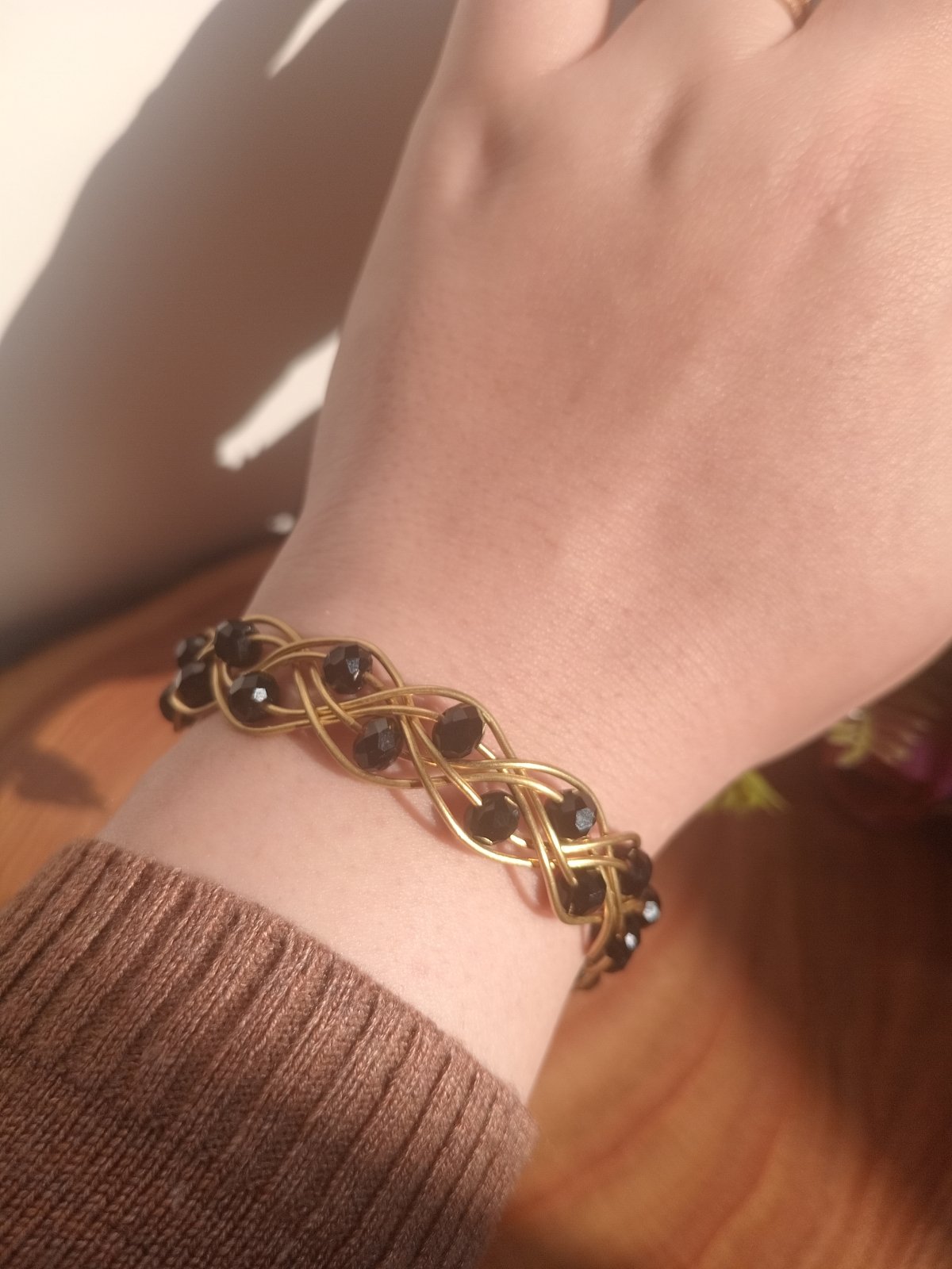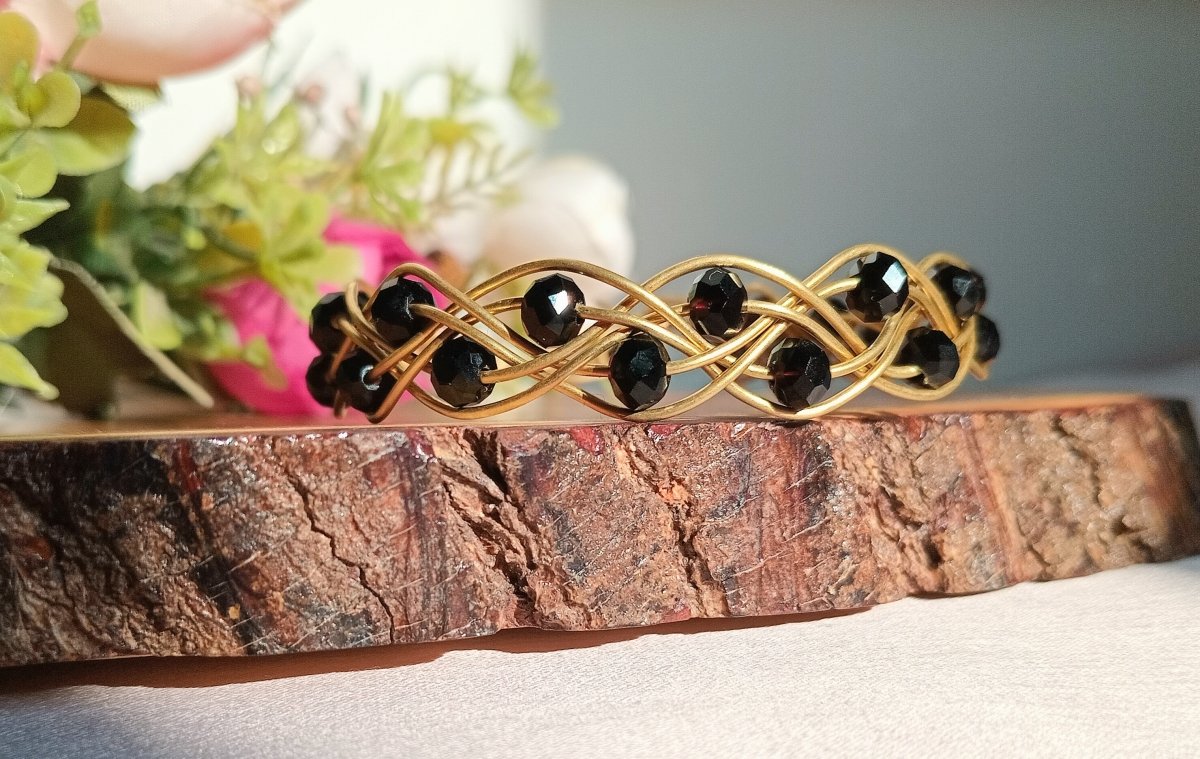 سوار من النحاس مصنوع يدوياً مع خرز كريستال أسود