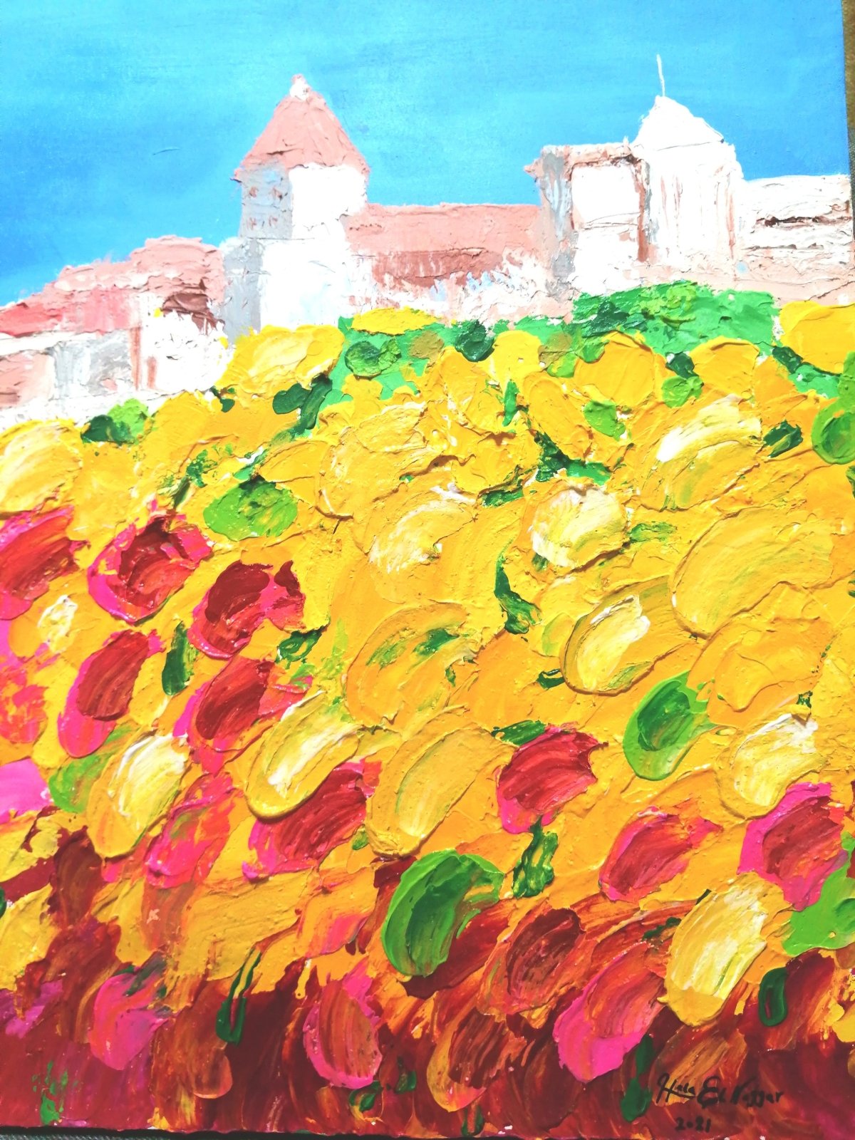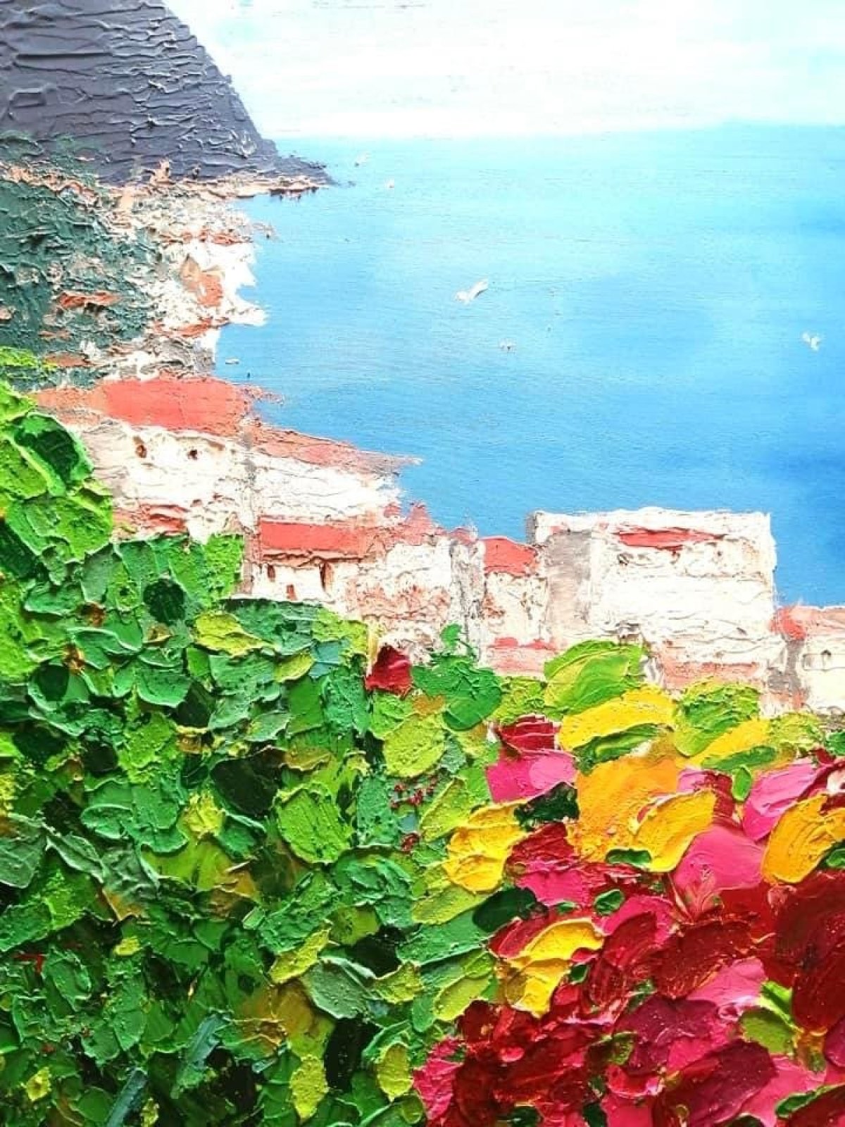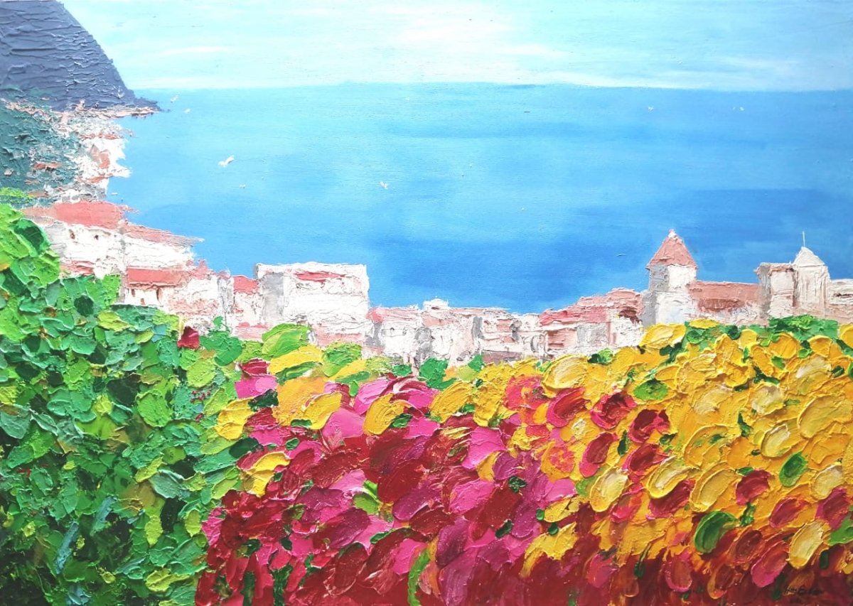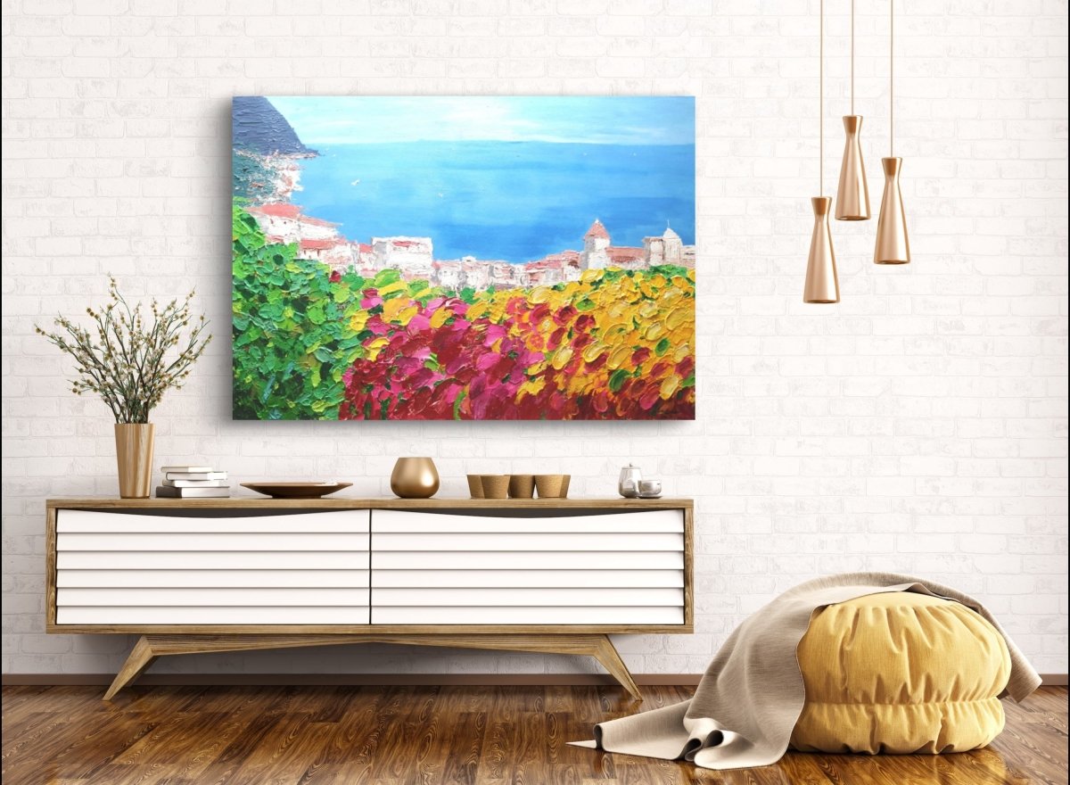 لوحة قماشية مشعة تصور جنة ساحلية، حيث ترقص الألوان النابضة بالحياة وسط مدينة ساحلية وحديقة مزهرة، مما يستحضر طاقة آسرة تبث الحياة والهدوء في المشهد، وتدعو المشاهدين إلى الانغماس في سحرها المضاء بأشعة الشمس.