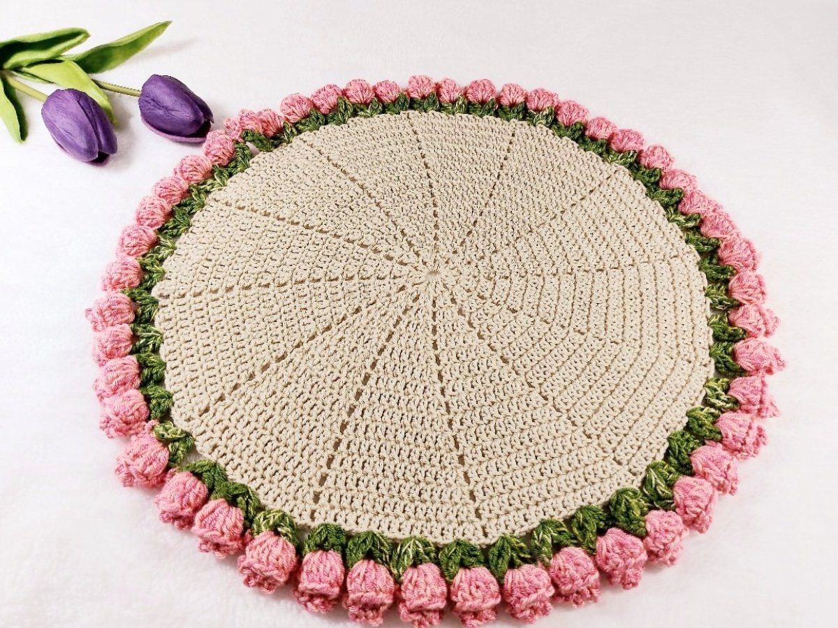 المفرش مشغول من خيط قطن ١٠٠% قطر المفرش ٣٠ سم ممكن استخدامة كمفرش او كوستر للسفرة واذا اطلب تنفيذه بحجم كبير ممكن يكون ثرو على الكنبة كديكور لطيف . او مفرش كبير . متاح تنفيذ المفرش او الورد باى لون او مقاس حسب الطلب ومتاح عمل المفرش بورد الجورى .