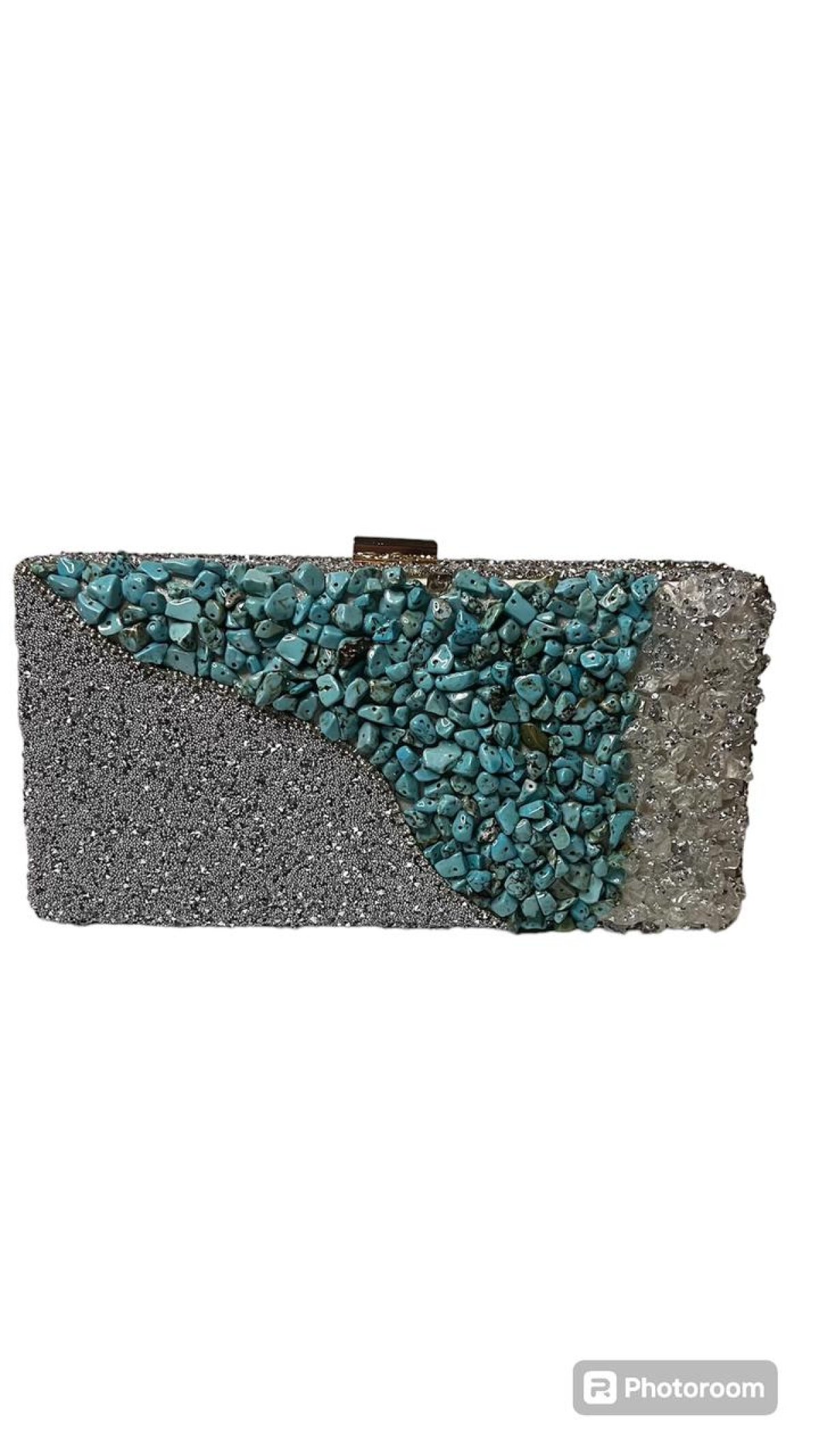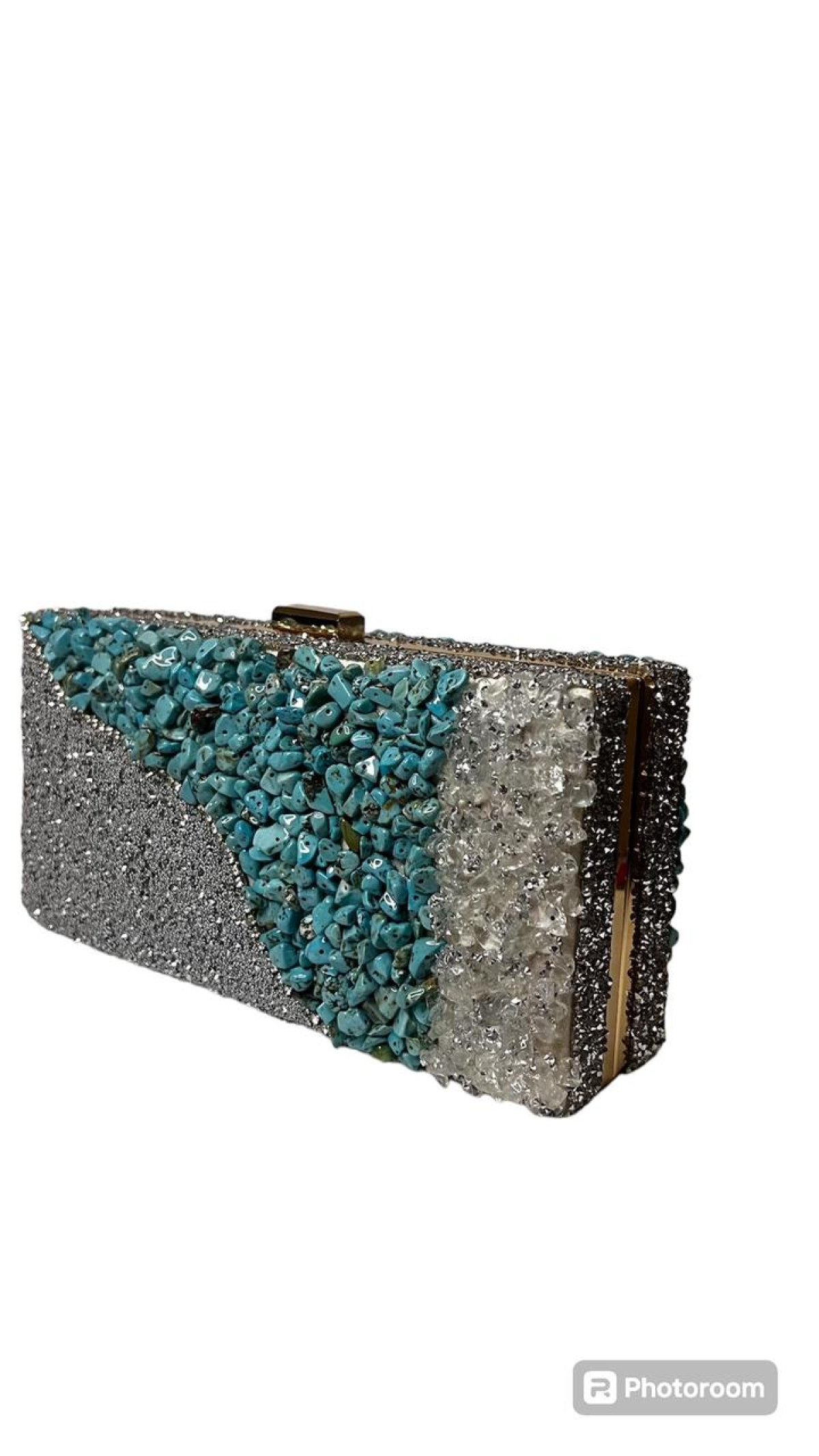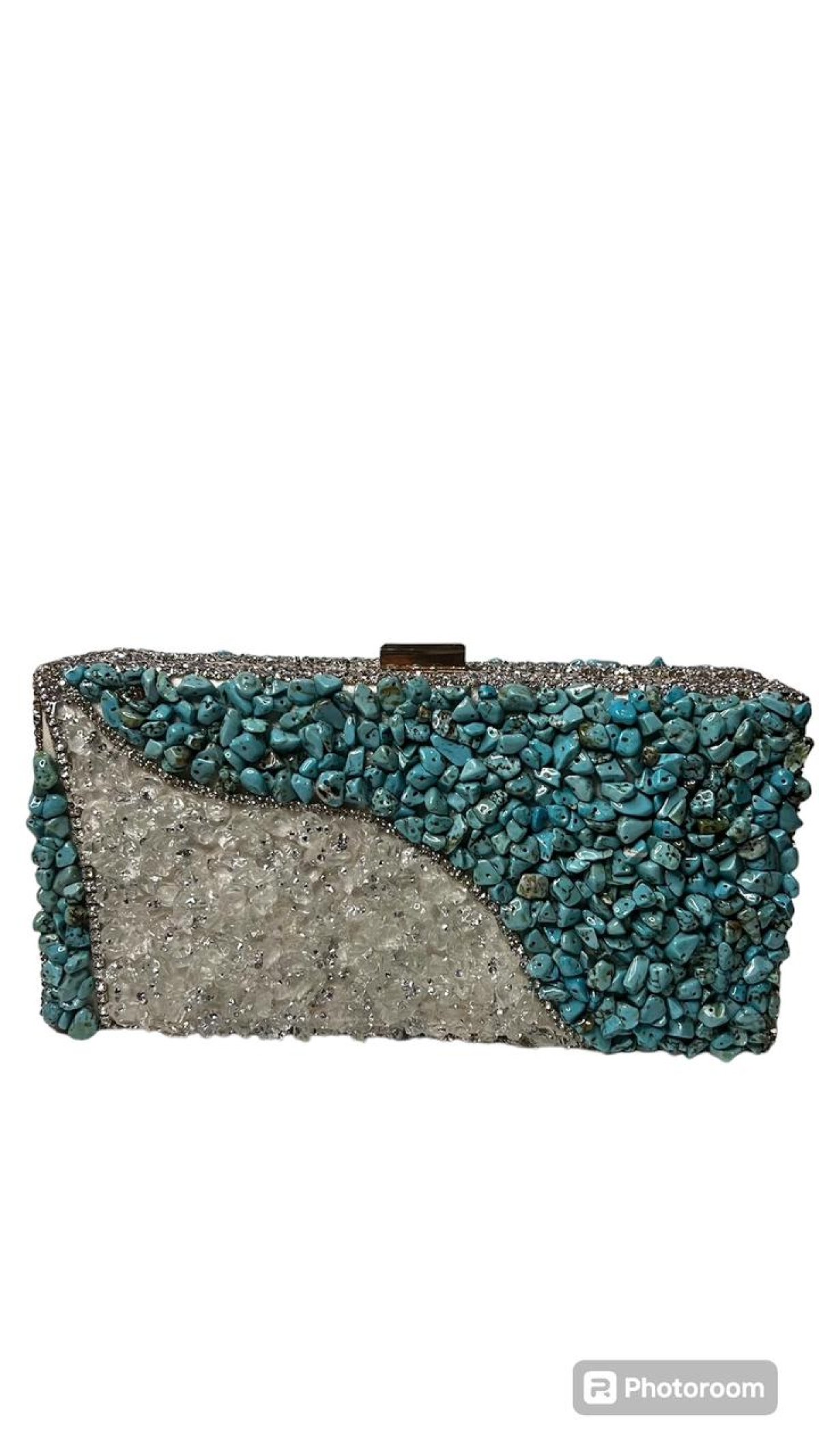 شنطه سواريه هاند ميد بالكامل مطعمه بحجر الفيروز الكريم، مع تطعيمات من الكريستال الطول 11سم العرض 17سم العمق 6 البطانه الداخليه للشنطه من قماش الشمواه والهيكل الخارجي من المعدن والشنطه دبل فيس لاطلاله جديده ومميزه كل يوم والشنطه تحتوي على 2 هانديل