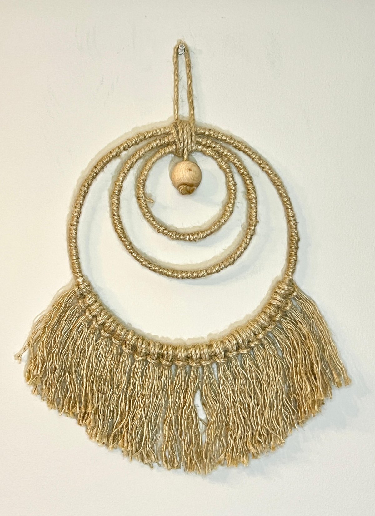 طاره خيش مصنوعه من خيط الخيش مكونه من ٣ أحجام الاكبر ٢٥سم ، المتوسط ٢٠سم ، الأصغر ١٠ سم . و خرزه خشب كبيره